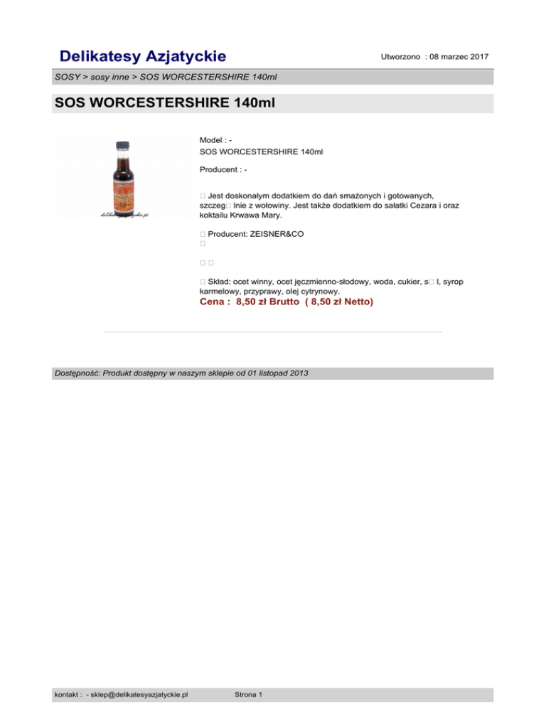 Delikatesy Azjatyckie Utworzono : 08 marzec 2017 SOSY > sosy inne > SOS WORCESTERSHIRE 140ml SOS WORCESTERSHIRE 140ml Model : SOS WORCESTERSHIRE 140ml Producent : Jest doskonałym dodatkiem do dań smażonych i gotowanych, szczeg�lnie z wołowiny. Jest także dodatkiem do sałatki Cezara i oraz koktailu Krwawa Mary. Producent: ZEISNER&CO � Skład: ocet winny, ocet jęczmienno-słodowy, woda, cukier, s�l, syrop karmelowy, przyprawy, olej cytrynowy. Cena : 8,50 zł Brutto ( 8,50 zł Netto) Dostępność: Produkt dostępny w naszym sklepie od 01 listopad 2013 kontakt : - [email protected] Strona 1