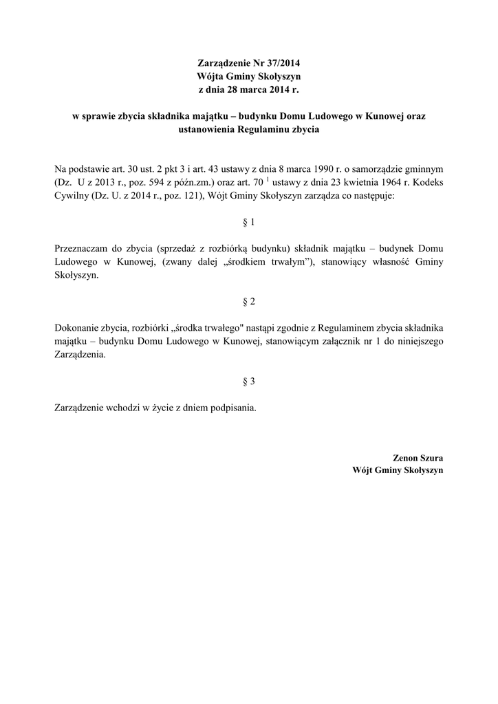 Zarządzenie Nr 37/2014 Wójta Gminy Skołyszyn z dnia 28 marca 2014 r. w sprawie zbycia składnika majątku – budynku Domu Ludowego w Kunowej oraz ustanowienia Regulaminu zbycia Na podstawie art. 30 ust. 2 pkt 3 i art. 43 ustawy z dnia 8 marca 1990 r. o samorządzie gminnym (Dz. U z 2013 r., poz. 594 z późn.zm.) oraz art. 70 1 ustawy z dnia 23 kwietnia 1964 r. Kodeks Cywilny (Dz. U. z 2014 r., poz. 121), Wójt Gminy Skołyszyn zarządza co następuje: §1 Przeznaczam do zbycia (sprzedaż z rozbiórką budynku) składnik majątku – budynek Domu Ludowego w Kunowej, (zwany dalej „środkiem trwałym”), stanowiący własność Gminy Skołyszyn. §2 Dokonanie zbycia, rozbiórki „środka trwałego" nastąpi zgodnie z Regulaminem zbycia składnika majątku – budynku Domu Ludowego w Kunowej, stanowiącym załącznik nr 1 do niniejszego Zarządzenia. §3 Zarządzenie wchodzi w życie z dniem podpisania. Zenon Szura Wójt Gminy Skołyszyn Załącznik Nr 1 do Zarządzenia Nr 37/2014 Wójta Gminy Skołyszyn z dnia 28 marca 2014 r. Regulamin zbycia składnika majątku ruchomego – budynku Domu Ludowego w Kunowej Rozdział I „POSTANOWIENIA OGÓLNE" §1 1. Regulamin określa sposób i tryb zbycia składnika majątku ruchomego - środka trwałego: budynku Domu Ludowego w Kunowej (zwanego dalej „środkiem trwałym"), stanowiącego własność Gminy Skołyszyn. 2. Zbycie środka trwałego zostanie przeprowadzone w trybie aukcji. 3. Przedmiotem zbycia jest budynek Domu Ludowego w Kunowej, który ze względu na stan techniczny oraz planowaną budowę nowego budynku Domu Ludowego został przeznaczony do rozbiórki. 4. Obowiązkiem oferenta, który wygra aukcję będzie rozbiórka i uprzątnięcie budynku na zasadach określonych w ust. 7. 5. Gmina Skołyszyn dokona zgłoszenia zamiaru rozbiórki budynku w Starostwie Powiatowym w Jaśle. 6. Opis budynku: 1) konstrukcja: drewniana, budynek posadowiony na podmurówce z pustaków żużlowych i fundamencie żelbetowym; 2) dach dwuspadowy o konstrukcji drewnianej kryty papą warstwową; 3) wymiary budynku: długość - 21 m; szerokość – 12 m, wysokość : 4 – 6 m. 7. Wymagania dotyczące warunków rozbiórki obiektu: 1) rozbiórkę budynku należy prowadzić przy użyciu specjalistycznego sprzętu i z zachowaniem wszelkich wymogów bezpieczeństwa; 2) obowiązkiem oferenta będzie uprzątnięcie zagospodarowanie i utylizacja wszystkich materiałów i odpadów powstałych przy rozbiórce obiektu zgodnie z obowiązującymi przepisami; 3) istniejące fundamenty budynku muszą zostać rozebrane co najmniej do istniejącego poziomu terenu; 4) termin rozbiórki i uprzątnięcia budynku: 2 m-ce od podpisania umowy. Rozdział II „ZASADY ZBYWANIA ŚRODKA TRWAŁEGO" §2 1. Gmina Skołyszyn poda do publicznej wiadomości ogłoszenie o aukcji co najmniej 7 dni przed terminem jej przeprowadzenia, poprzez co najmniej: 1) wywieszenie ogłoszenia na tablicy ogłoszeń w siedzibie Urzędu Gminy w Skołyszynie, 38-242 Skołyszyn 12; 2) zamieszczenie ogłoszenia o aukcji w Biuletynie Informacji Publicznej. §3 1. 1. Podstawę do zawarcia umowy z oferentem (licytantem) stanowić będzie zatwierdzony przez Wójta Gminy Skołyszyn protokół z przeprowadzonej aukcji. §4 Ogłoszenie o aukcji powinno zawierać informacje o: 1) parametrach technicznych zbywanego środka trwałego; 2) cenie wywoławczej; 3) wysokości i warunkach wpłaty wadium; 4) terminie i miejscu aukcji. Rozdział III „KOMISJA PRZETARGOWA, PROWADZENIE ORAZ DOKUMENTOWANIE POSTĘPOWANIA" §5 1. Czynności związane z przeprowadzeniem aukcji wykonuje Komisja Przetargowa w składzie: 1) Grzegorz Szański - Przewodniczący Komisji Przetargowej 2) Krystyna Zięba – Sekretarz Komisji Przetargowej. 3) Maria Antas – Członek Komisji Przetargowej. §6 1. 2. 3. 4. 5. 6. Cena wywoławcza za zbycie środka trwałego na zasadach określonych w § 1 regulaminu wynosi: 500,00 złotych brutto (słownie: pięćset złotych). Warunkiem przystąpienia oferentów do aukcji jest wniesienie wadium w wysokości 20% ceny wywoławczej środka trwałego będącego przedmiotem aukcji, w wysokości 100,00 zł. Wadium, o którym mowa w ust. 1 oferent przystępujący do aukcji jest zobowiązany wpłacić w kasie Urzędu Gminy w Skołyszynie, z siedzibą: 38-242 Skołyszyn 12 lub na konto Nr 92 8627 1037 2003 5000 0459 0004 w terminie do dnia …………………… (dzień przed terminem aukcji, zgodnie z ogłoszeniem o aukcji). Wpłacone wadium zostanie: 1) zaliczone na poczet ceny nabycia, jeżeli oferent wpłacający wadium wygra aukcję; 2) zwrócone po zamknięciu lub odwołaniu aukcji w terminie 3 dni od zamknięcia lub odwołania aukcji. Przed otwarciem aukcji Komisja Przetargowa zwraca się do oferentów o przedłożenie dowodów wpłaty wadium (nie dotyczy, jeżeli Komisja dysponuje dowodami wpłat) i okazanie dowodów tożsamości oraz stosownych pełnomocnictw, jeżeli oferent reprezentuje osoby fizyczne lub prawne biorące udział w aukcji. Przewodniczący Komisji Przetargowej otwiera aukcję, przekazując oferentom : 1) przedmiot aukcji; 2) cenę wywoławczą; 3) warunki dotyczące wysokości postąpienia; 4) termin uiszczenia ceny nabycia; 5) zmiany w stanie faktycznym i prawnym przedmiotu aukcji, które zaszły po ogłoszeniu o aukcji; 7. 8. 9. 10. 11. 12. 13. 14. 15. 16. 17. 18. 19. 20. 21. 22. 23. 6) nazwy (firmy) lub imiona i nazwiska oferentów, którzy wpłacili wadium i zostali dopuszczeniu do aukcji. Przystąpienie jednego oferenta wystarcza do przeprowadzenia aukcji. Przewodniczący Komisji Przetargowej informuje uczestników aukcji, że po trzecim wywołaniu najwyższej zaoferowanej ceny dalsze postąpienia nie zostaną przyjęte. O wysokości postąpienia decyduje Komisja Przetargowa, z tym, że postąpienie nie może wynosić mniej niż 10% ceny wywoławczej 50,00 złotych (słownie złotych: pięćdziesiąt). Uczestnicy aukcji zgłaszają ustnie kolejne postąpienia ceny, dopóki mimo trz