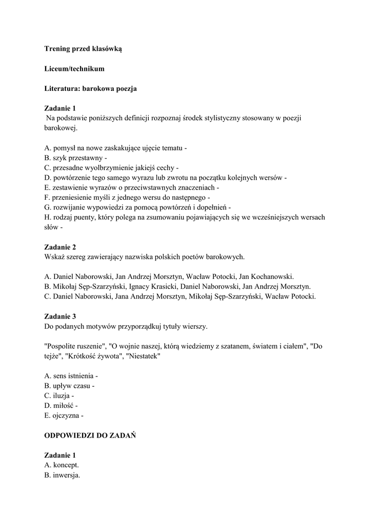 Trening przed klasówką Liceum/technikum Literatura: barokowa