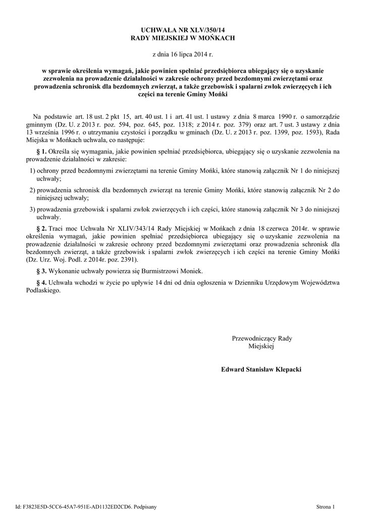 UCHWAŁA NR XLV/350/14 RADY MIEJSKIEJ W MOŃKACH z dnia 16 lipca 2014 r. w sprawie określenia wymagań, jakie powinien spełniać przedsiębiorca ubiegający się o uzyskanie zezwolenia na prowadzenie działalności w zakresie ochrony przed bezdomnymi zwierzętami oraz prowadzenia schronisk dla bezdomnych zwierząt, a także grzebowisk i spalarni zwłok zwierzęcych i ich części na terenie Gminy Mońki Na podstawie art. 18 ust. 2 pkt 15, art. 40 ust. 1 i art. 41 ust. 1 ustawy z dnia 8 marca 1990 r. o samorządzie gminnym (Dz. U. z 2013 r. poz. 594, poz. 645, poz. 1318; z 2014 r. poz. 379) oraz art. 7 ust. 3 ustawy z dnia 13 września 1996 r. o utrzymaniu czystości i porządku w gminach (Dz. U. z 2013 r. poz. 1399, poz. 1593), Rada Miejska w Mońkach uchwala, co następuje: § 1. Określa się wymagania, jakie powinien spełniać przedsiębiorca, ubiegający się o uzyskanie zezwolenia na prowadzenie działalności w zakresie: 1) ochrony przed bezdomnymi zwierzętami na terenie Gminy Mońki, które stanowią załącznik Nr 1 do niniejszej uchwały; 2) prowadzenia schronisk dla bezdomnych zwierząt na terenie Gminy Mońki, które stanowią załącznik Nr 2 do niniejszej uchwały; 3) prowadzenia grzebowisk i spalarni zwłok zwierzęcych i ich części, które stanowią załącznik Nr 3 do niniejszej uchwały. § 2. Traci moc Uchwała Nr XLIV/343/14 Rady Miejskiej w Mońkach z dnia 18 czerwca 2014r. w sprawie określenia wymagań, jakie powinien spełniać przedsiębiorca ubiegający się o uzyskanie zezwolenia na prowadzenie działalności w zakresie ochrony przed bezdomnymi zwierzętami oraz prowadzenia schronisk dla bezdomnych zwierząt, a także grzebowisk i spalarni zwłok zwierzęcych i ich części na terenie Gminy Mońki (Dz. Urz. Woj. Podl. z 2014r. poz. 2391). § 3. Wykonanie uchwały powierza się Burmistrzowi Moniek. § 4. Uchwała wchodzi w życie po upływie 14 dni od dnia ogłoszenia w Dzienniku Urzędowym Województwa Podlaskiego. Przewodniczący Rady Miejskiej Edward Stanisław Klepacki Id: F3823E5D-5CC6-45A7-951E-AD1132ED2CD6. Podpisany Strona 1 Załącznik Nr 1 do Uchwały Nr XLV/350/14 Rady Miejskiej w Mońkach z dnia 16 lipca 2014 r. Wymagania, jakie powinien spełniać przedsiębiorca ubiegający się o uzyskanie zezwolenia na prowadzenie działalności w zakresie ochrony przed bezdomnymi zwierzętami na terenie Gminy Mońki § 1. 1. Przedsiębiorca ubiegający się o uzyskanie zezwolenia na prowadzenie działalności w zakresie ochrony przed bezdomnymi zwierzętami, powinien spełniać następujące wymagania: 1) posiadać zarejestrowaną działalność gospodarczą obejmującą prowadzenie działalności w zakresie ochrony przed bezdomnymi zwierzętami; 2) przedsiębiorca prowadzący działalność ww. zakresie, jego wspólnicy i osoby zasiadające w organach przedsiębiorcy nie mogą być karani z art. 35 i 37 ustawy z dnia 21 sierpnia 1997 r. o ochronie zwierząt (Dz. U. z 2013 r. poz. 856); 3) dysponować specjalistycznym, atestowanym sprzętem niezbędnym do właściwego wyłapywania bezdomnych zwierząt, w tym: a) urządzeniami do odławiania i przenoszenia zwierząt, które nie stwarzają zagrożenia dla ich zdrowia i życia, b) pojazdem, spełniającym wymagania określone w ustawie z dnia 21 sierpnia 1997 r. o ochronie zwierząt (Dz. U. z 2013 r. poz. 856), w zakresie transportu zwierząt; 4) dysponować przeszkolonym personelem; 5) posiadać umowę z podmiotem prowadzącym schronisko dla zwierząt gwarantującą odbiór wyłapanych zwierząt lub pisemne oświadczenie tego podmiotu o gotowości odbioru zwierząt wyłapanych, a w przypadku gdy sam prowadzi schronisko powinien posiadać stosowne zezwolenie organu właściwego wg miejsca prowadzenia schroniska; 6) zapewniać w razie potrzeby pomoc weterynaryjną wyłapanym zwierzętom. § 2. Wymienione w § 1 ust. 1 wymagania powinny zostać potwierdzone odpowiednimi dokumentami. Id: F3823E5D-5CC6-45A7-951E-AD1132ED2CD6. Podpisany Strona 1 Załącznik Nr 2 do Uchwały Nr XLV/350/14 Rady Miejskiej w Mońkach z dnia 16 lipca 2014 r. Wymagania, jakie powinien spełniać przedsiębiorca ubiegający się o uzyskanie zezwolenia na prowadzenie działalności w zakresie prowadzenia schronisk dla bezdomnych zwierząt na terenie Gminy Mońki § 1. 1. Przedsiębiorca ubiegający się o uzyskanie zezwolenia na prowadzenie działalności w zakresie prowadzenia schronisk dla bezdomnych zwierząt, powinien spełniać następujące wymagania: 1) posiadać zarejestrowaną działalność gospodarczą obejmującą prowadzenie schronisk dla bezdomnych zwierząt; 2) przedsiębiorca prowadzący działalność w ww. zakresie, jego wspólnicy i osoby zasiadające w organach przedsiębiorcy nie mogą być karani z art. 35 i 37 ustawy z dnia 21 sierpnia 1997 r. o ochronie zwierząt (Dz. U. z 2013 r. poz. 856); 3) posiadać decyzję Powiatowego Lekarza Weterynarii nadającą weterynaryjny numer identyfikacyjny w trybie ustawy z dnia 11 marca 2004 r. o ochronie zdrowia zwierząt oraz zwalczania chorób zakaźnych zwierząt (Dz. U. z 2008 r. Nr 213, poz. 1342 z późn. zm.); 4) posiadać tytuł prawny do dysponowania terenem, na którym ma być prowadzona działalność, wynikający z prawa własności, użytkowania wieczystego, zarządu, ograniczonego prawa rzeczowego albo stosunku zobowiązaniowego, przewidującego uprawnienia do wykonywania robót budowlanych; 5) dysponować obiektami, pomieszczeniami oraz specjalistycznymi, atestowanym sprzętem i urządzeniami, niezbędnymi do prowadzenia działalności we wnioskowanym zakresie, określonymi w Rozporządzeniu Ministra Rolnictwa i Rozwoju Wsi z dnia 23 czerwca 2004 r. w sprawie szczegółowych wymagań weterynaryjnych dla prowadzenia schronisk dla zwierząt (Dz. U. z 2004 r. Nr 158, poz. 1657); 6) dysponować pojazdem przystosowanym do transportu zwierząt, posiadać zawartą umowę lub pisemne oświadczenie z podmiotem posiadającym pojazd przystosowany do transportu zwierząt i św