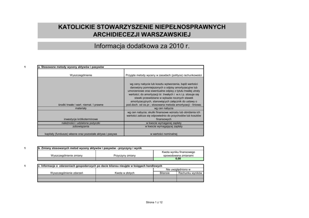 KATOLICKIE STOWARZYSZENIE NIEPEŁNOSPRAWNYCH ARCHIDIECEZJI WARSZAWSKIEJ Informacja dodatkowa za 2010 r. 1 1 a. Stosowane metody wyceny aktywów i pasywów Wyszczególnienie Przyjęte metody wyceny w zasadach (polityce) rachunkowości środki trwałe i wart. niemat. I prawne materiały inwestycje krótkoterminowe należności i udzielone pożyczki zobowiązania wg ceny nabycie lub kosztu wytworzenia, bądź wartości darowizny pomniejszonych o odpisy amortyzacyjne lub umorzeniowe oraz ewentualne odpisy z tytułu trwałej utraty wartości; do amortyzacji śr. trwałych i w.n.i p. stosuje się stawki przewidziane w wykazie rocznych stawek amortyzacyjnych, stanowiących załącznik do ustawy o pod.doch. od os.pr.; stosowana metoda amortyzacji - liniowa; wg cen nabycia wg cen nabycia; skutki finansowe wzrostu lub obniżenia ich wartości zalicza się odpowiednio do przychodów lub kosztów finansowych w kwocie wymaganej zapłaty w kwocie wymagającej zapłaty kapitały (fundusze) własne oraz pozostałe aktywa i pasywa w wartości nominalnej b. Zmiany stosowanych metod wyceny aktywów i pasywów - przyczyny i wynik Wyszczególnienie zmiany 1 Przyczyny zmiany Kwota wyniku finansowego spowodowana zmianami 0,00 c. Informacje o zdarzeniach gospodarczych po dacie bilansu nieujęte w księgach handlowych Wyszczególnienie zdarzeń Kwota w złotych Nie uwzględniono w Bilansie Rachunku wyników Strona 1 z 12 2 a. Rzeczowe aktywa trwałe - środki trwałe Nazwa grupy składników majątku trwałego Stan na początek roku obrotowego 1. grunty (w tym prawo użytkowania gruntu) 2. budynki, lokale i obiekty inżynierii lądowej i wodnej 3. kotły i maszyny energetyczne 4. urządzenia techniczne i maszyny 5. środki transportu 6. inne środki trwałe 7. Środki trwałe w budowie Razem 2 Przychody 352 800,00 984 835,00 4 315 929,44 11 638,80 166 823,71 682 414,00 149 079,11 0,00 5 678 685,06 14 640,00 0,00 0,00 0,00 15 558,00 1 236 790,42 2 251 823,42 0,00 Przemieszczenia Rozchody 708 000,00 629 635,00 0,00 259 268,40 0,00 0,00 0,00 0,00 0,00 4 071 301,04 11 638,80 166 823,71 682 414,00 164 637,11 1 236 790,42 6 963 240,08 0,00 0,00 967 268,40 b. Umorzenie środków trwałych - amortyzacja Nazwa grupy składników majątku trwałego 1. grunty (w tym prawo użytkowania gruntu) 2. budynki, lokale i obiekty inżynierii lądowej i wodnej 3.kotły ui maszyny energetyczne 4. urządzenia techniczne i maszyny 5. środki transportu 6. inne środki trwałe 7.środki trwałe w budowie Razem 2 Aktualizacja Stan na koniec roku obrotowego Stan na początek roku obrotowego Amortyzacja za rok 2010 Aktualizacja Inne zwiększenia Zmniejszenie Stan na Stan na koniec początek roku roku obrotowego obrotowego (netto) Stan na koniec roku obrotowego (netto) 54 075,00 3 116,66 0,00 37 716,66 19 475,00 298 725,00 610 160,00 411 724,72 135,79 104 911,90 595 296,20 114 937,97 0,00 1 281 081,58 74 490,71 814,72 13 892,97 54 190,12 6 328,88 0,00 152 834,06 0,00 22 047,75 0,00 0,00 0,00 0,00 0,00 0,00 59 764,41 464 167,68 950,51 118 804,87 649 486,32 121 266,85 0,00 1 374 151,23 3 904 204,72 11 503,01 61 911,81 87 117,80 34 141,14 0,00 4 397 603,48 3 607 133,36 10 688,29 48 018,84 32 927,68 43 370,26 1 236 790,42 5 589 088,85 0,00 c. Grunty użytkowane wieczyście Stan na początek roku obrotowego Zmiany w ciągu roku Zwiększenia Zmniejszenia Powierzchnia m2 Wartość Strona 2 z 12 Stan na koniec roku obrotowego 0,00 0,00 2 d. Środki trwałe używana na podstawie umowy najmu lub dzierżawy Stan na początek roku obrotowego 1. grunty (w tym prawo użytkowania gruntu) 2. budynki, lokale i obiekty inżynierii lądowej i wodnej 3. urządzenia techniczne i maszyny 4. środki transportu 5. inne środki trwałe Razem 2 Stan na koniec roku obrotowego 0,00 0,00 0,00 0,00 0,00 0,00 0,00 0,00 0,00 e. Wartości niematerialne i prawne Nazwa grupy składników majątku trwałego 1. Inne wartości niematerialne i prawne Razem 2 Zmiany w ciągu roku Zwiększenia Zmniejszenia Stan na początek roku obrotowego 3 391,60 3 391,60 Przychody Stan na koniec roku obrotowego 3 391,60 0,00 3 391,60 Rozchody 0,00 f. Umorzenie wartości niematerialnych i prawnych - amortyzacja Nazwa grupy składników majątku trwałego 1. Inne wartości niematerialne i prawne Razem Stan na początek roku obrotowego 3 391,60 3 391,60 Amortyzacja za rok Inne zwiększenia 0,00 Strona 3 z 12 0,00 Stan na początek roku Stan na koniec Stan na koniec obrotowego roku obrotowego Zmniejszenie roku obrotowego (netto) (netto) 3 391,60 0,00 0,00 0,00 3 391,60 0,00 0,00 2 g. Inwestycje długoterminowe 1. Nieruchomości 2. Wartości niematerialne i prawne 3. Długoterminowe aktywa finansowe a. udziały i akcje b. inne papiery wartościowe c. udzielone pożyczki 2 2 Stan na początek roku obrotowego 0,00 0,00 0,00 0,00 0,00 0,00 d. inne długoterminowe aktywa finansowe 0,00 4. Inne długoterminowe inwestycje Razem 0,00 0,00 Zmiany w ciągu roku Zwiększenia Zmniejszenia 0,00 Stan na koniec roku obrotowego 0,00 0,00 0,00 0,00 0,00 0,00 0,00 0,00 0,00 h. Podział należności według pozycji bilansu o pozostałym na dzień bilansowy, przewidywanym umową okresie spłaty okres wymagalności do 1 roku powyżej 1 roku stan na koniec roku początek roku koniec roku początek roku obrotowego obrotowego obrotowego obrotowego Należności z tytułu 1. dostaw i usług 0,00 2. podatków 3. środków od ZUS 4. wynagrodzeń 5. pożyczek z ZFSS 18 240,00 16 975,00 0,00 6. innych należności 111 000,00 151 000,00 114 000,00 Razem 129 240,00 167 975,00 114 000,00 0,00 0,00 Razem początek roku koniec roku obrotowego obrotowego 0,00 0,00 0,00 0,00 0,00 0,00 0,00 0,00 0,00 18 240,00 16 975,00 0,00 225 000,00 151 000,00 0,00 243 240,00 167 975,00 i. Podział zobowiązań według pozycji bilansu o pozostałym na dzień bilansowy, przewidywanym umową okresie spłaty okres wymagalności do 1 roku powyżej 1 roku Razem stan na początek roku koniec roku początek roku koniec roku początek roku koniec roku obrot