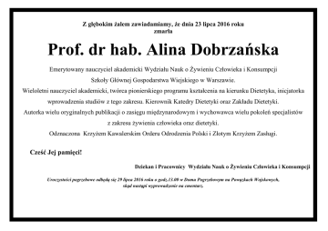Z głębokim żalem zawiadamiamy, że dnia 23 lipca 2016 roku zmarła Prof. dr hab. Alina Dobrzańska Emerytowany nauczyciel akademicki Wydziału Nauk o Żywieniu Człowieka i Konsumpcji Szkoły Głównej Gospodarstwa Wiejskiego w Warszawie. Wieloletni nauczyciel akademicki, twórca pionierskiego programu kształcenia na kierunku Dietetyka, inicjatorka wprowadzenia studiów z tego zakresu. Kierownik Katedry Dietetyki oraz Zakładu Dietetyki. Autorka wielu oryginalnych publikacji o zasięgu międzynarodowym i wychowawca wielu pokoleń specjalistów z zakresu żywienia człowieka oraz dietetyki. Odznaczona Krzyżem Kawalerskim Orderu Odrodzenia Polski i Złotym Krzyżem Zasługi. Cześć Jej pamięci! Dziekan i Pracownicy Wydziału Nauk o Żywieniu Człowieka i Konsumpcji Uroczystości pogrzebowe odbędą się 29 lipca 2016 roku o godz.13.00 w Domu Pogrzebowym na Powązkach Wojskowych, skąd nastąpi wyprowadzenie na cmentarz.