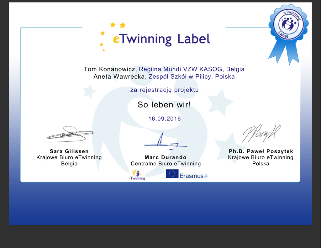 Tom Konanowicz, Regiina Mundi VZW KASOG, Belgia Aneta Wawrecka, Zespół Szkół w Pilicy, Polska za rejestrację projektu So leben wir! 16.09.2016 Sara Gilissen Krajowe Biuro eTwinning Belgia Marc Durando Centralne Biuro eTwinning Ph.D. Paweł Poszytek Krajowe Biuro eTwinning Polska