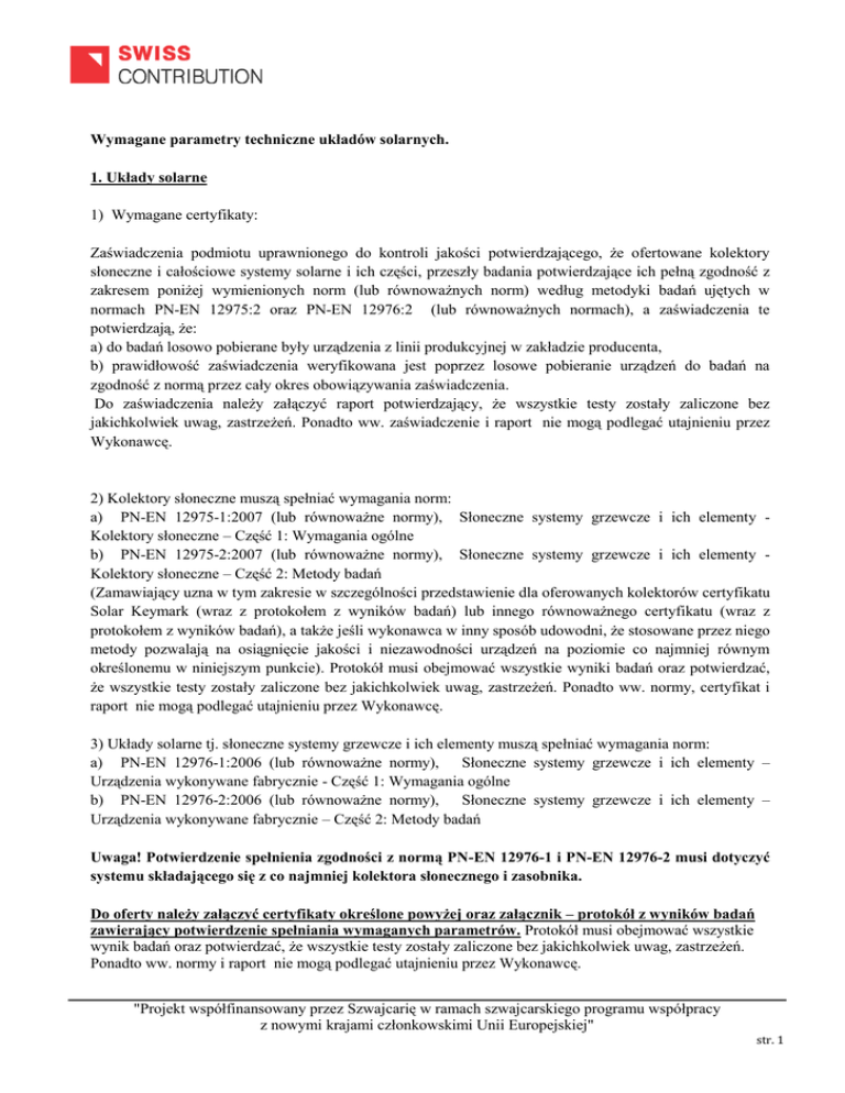 Wymagane parametry techniczne układów solarnych. 1. Układy solarne 1) Wymagane certyfikaty: Zaświadczenia podmiotu uprawnionego do kontroli jakości potwierdzającego, że ofertowane kolektory słoneczne i całościowe systemy solarne i ich części, przeszły badania potwierdzające ich pełną zgodność z zakresem poniżej wymienionych norm (lub równoważnych norm) według metodyki badań ujętych w normach PN-EN 12975:2 oraz PN-EN 12976:2 (lub równoważnych normach), a zaświadczenia te potwierdzają, że: a) do badań losowo pobierane były urządzenia z linii produkcyjnej w zakładzie producenta, b) prawidłowość zaświadczenia weryfikowana jest poprzez losowe pobieranie urządzeń do badań na zgodność z normą przez cały okres obowiązywania zaświadczenia. Do zaświadczenia należy załączyć raport potwierdzający, że wszystkie testy zostały zaliczone bez jakichkolwiek uwag, zastrzeżeń. Ponadto ww. zaświadczenie i raport nie mogą podlegać utajnieniu przez Wykonawcę. 2) Kolektory słoneczne muszą spełniać wymagania norm: a) PN-EN 12975-1:2007 (lub równoważne normy), Słoneczne systemy grzewcze i ich elementy Kolektory słoneczne – Część 1: Wymagania ogólne b) PN-EN 12975-2:2007 (lub równoważne normy), Słoneczne systemy grzewcze i ich elementy Kolektory słoneczne – Część 2: Metody badań (Zamawiający uzna w tym zakresie w szczególności przedstawienie dla oferowanych kolektorów certyfikatu Solar Keymark (wraz z protokołem z wyników badań) lub innego równoważnego certyfikatu (wraz z protokołem z wyników badań), a także jeśli wykonawca w inny sposób udowodni, że stosowane przez niego metody pozwalają na osiągnięcie jakości i niezawodności urządzeń na poziomie co najmniej równym określonemu w niniejszym punkcie). Protokół musi obejmować wszystkie wyniki badań oraz potwierdzać, że wszystkie testy zostały zaliczone bez jakichkolwiek uwag, zastrzeżeń. Ponadto ww. normy, certyfikat i raport nie mogą podlegać utajnieniu przez Wykonawcę. 3) Układy solarne tj. słoneczne systemy grzewcze i ich elementy muszą spełniać wymagania norm: a) PN-EN 12976-1:2006 (lub równoważne normy), Słoneczne systemy grzewcze i ich elementy – Urządzenia wykonywane fabrycznie - Część 1: Wymagania ogólne b) PN-EN 12976-2:2006 (lub równoważne normy), Słoneczne systemy grzewcze i ich elementy – Urządzenia wykonywane fabrycznie – Część 2: Metody badań Uwaga! Potwierdzenie spełnienia zgodności z normą PN-EN 12976-1 i PN-EN 12976-2 musi dotyczyć systemu składającego się z co najmniej kolektora słonecznego i zasobnika. Do oferty należy załączyć certyfikaty określone powyżej oraz załącznik – protokół z wyników badań zawierający potwierdzenie spełniania wymaganych parametrów. Protokół musi obejmować wszystkie wynik badań oraz potwierdzać, że wszystkie testy zostały zaliczone bez jakichkolwiek uwag, zastrzeżeń. Ponadto ww. normy i raport nie mogą podlegać utajnieniu przez Wykonawcę. "Projekt współfinansowany przez Szwajcarię w ramach szwajcarskiego programu współpracy z nowymi krajami członkowskimi Unii Europejskiej" str. 1 2) Wymagane parametry techniczne kolektorów słonecznych: Typ kolektora słonecznego: płaski Materiał obudowy kolektora: rama kolektora wykonana z jednego profilu aluminium. Izolacja: wysokoodporna izolacja z wełny mineralnej lub innej równoważnej. Wielkość i liczba: wymagana łączna powierzchnia czynna kolektorów dla jednej instalacji domowej (łączna powierzchnia czynna absorbera): - dla instalacji typu A i B: co najmniej 4,6 [m2], - dla instalacji typu C: co najmniej 6,9 [m2]. Wymiary wszystkich kolektorów montowanych w obrębie nieruchomości muszą być takie same. Absorber: płyta miedziana lub aluminiowa z powłoką selektywną Materiał i konstrukcja rur absorbera: - rura miedziana ułożona w sposób meandrowy lub harfowy Parametry absorbera: - min. współczynnik absorpcji: 0,95+/- 2% - max. współczynnik emisji: 0,05+/- 2% Płyn solarny (nośnik ciepła): nie palny, wodny roztwór glikolu propylenowego o zawartości wody maksimum do 60 %; o temperaturze krzepnięcia -30°C. Sprawność optyczna: min. 83 %( dopuszcza się zaokrąglenie do wartości całych procent) Współczynniki strat ciepła: - współczynnik strat ciepła liniowy max 3,800 W/m2K - współczynnik strat ciepła kwadratowy max 0,020 W/m2K2 Szyba kolektora: szyba hartowana, antyrefleksyjna odporna na gradobicie. Obecność powłoki antyrefleksyjnej musi zostać potwierdzona przez niezależną, akredytowaną jednostkę badawczą w sprawozdaniu z badań osiągów kolektorów słonecznych wg EN 12975 (lub równoważnej). Jako równoważność w tym zakresie dopuszcza się poświadczenie przepuszczalności solarnej szyby na poziomie min. 94 %. Max dopuszczalna temp. pracy: min 200 [ºC]-temperatura stagnacji Uwaga: wymienione wyżej wartości odnoszą się do powierzchni czynnej to jest: - powierzchni apertury, w przypadku gdy jej powierzchnia jest mniejsza od powierzchni absorbera, - powierzchni absorbera w przypadku gdy jego powierzchnia jest mniejsza od powierzchni apertury. 3) Wymagany stopień pokrycia zapotrzebowania ciepła na przygotowanie c.w.u. Dla instalacji solarnej na domach prywatnych co najmniej 50 % w skali całego roku kalendarzowego. Stopień pokrycia będzie określony dla instalacji referencyjnych o parametrach podanych w tabeli poniżej: Urządzenie/parametry Wartość / założenia "Projekt współfinansowany przez Szwajcarię w ramach szwajcarskiego programu współpracy z nowymi krajami członkowskimi Unii Europejskiej" str. 2 1. Instalacja solarna Nachylenie kolektorów do poziomu 0 450 Azymut 0 00 Położenie geograficzne instalacji solarnej 0 Przyjąć jak dla m. Krakowa Długość rur łączących instalacji solarnej na zewnątrz m Wg technologii przyjętego producenta kolektorów Długość rur łączących instalacji solarnej w pomieszczeniu m 1