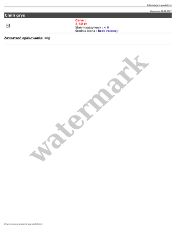 Informacje o produkcie Utworzono 08-03-2017 Chilli grys Cena : 2,50 zł Stan magazynowy : < 0 Średnia ocena : brak recenzji w at er m ar k Zawartosć opakowania: 40g Wygenerowano w programie www.oscGold.com