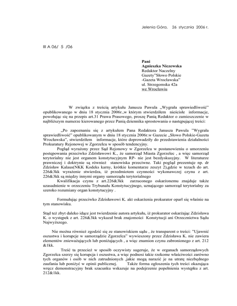 Jelenia Góra, 26 stycznia 2006 r. III A 06/ 5 /06 Pani Agnieszka Niczewska Redaktor Naczelny Gazety”Słowo Polskie -Gazeta Wrocławska” ul. Strzegomska 42a we Wrocławiu W związku z treścią artykułu Janusza Pawula „Wygrała sprawiedliwość” opublikowanego w dniu 18 stycznia 2006r.,w którym stwierdziłem nieścisłe informacje, powołując się na przepis art.31 Prawa Prasowego, proszę Panią Redaktor o zamieszczenie w najbliższym numerze kierowanego przez Panią dziennika sprostowania o następującej treści: „Po zapoznaniu się z artykułem Pana Redaktora Janusza Pawula ”Wygrała sprawiedliwość” opublikowanym w dniu 18 stycznia 2006r.w Gazecie „Słowo Polskie-Gazeta Wrocławska”, stwierdziłem informacje, które doprowadziły do przedstawienia działalności Prokuratury Rejonowej w Zgorzelcu w sposób tendencyjny. Pogląd wyrażony przez Sąd Rejonowy w Zgorzelcu w postanowieniu o umorzeniu postępowania przeciwko Zdzisławowi K., że samorząd Miasta Zgorzelec , a więc samorząd terytorialny nie jest organem konstytucyjnym RP- nie jest bezdyskusyjny. W literaturze prawniczej i doktrynie są również stanowiska przeciwne. Taki pogląd prezentuje np. dr Zdzisław Kalaus(NKK Kodeks karny, krótkie komentarze zeszyt 2),gdzie w tezach do art. 226&3kk wyrażenie stwierdza, iż przedmiotem czynności wykonawczej czynu z art. 226&3kk są między innymi organy samorządu terytorialnego Kwalifikacja czynu z art.226&3kk zarzuconego oskarżonemu znajduje także uzasadnienie w orzeczeniu Trybunału Konstytucyjnego, uznającego samorząd terytorialny za szeroko rozumiany organ konstytucyjny . Formułując przeciwko Zdzisławowi K. akt oskarżenia prokurator oparł się właśnie na tym stanowisku. Stąd też zbyt daleko idące jest twierdzenie autora artykułu, iż prokurator oskarżając Zdzisława K. o występek z art. 226&3kk wykazał brak znajomości Konstytucji ani Orzecznictwa Sądu Najwyższego. Nie można również zgodzić się ze stanowiskiem sądu , że transparent o treści: ”Ujawnić oszustwa i korupcje w samorządzie Zgorzelca” wywieszony przez Zdzisława K. nie zawiera elementów znieważających lub poniżających , a więc znamion czynu zabronionego z art. 212 &1kk. Treść ta przecież w sposób oczywisty sugeruje, że w organach samorządowych Zgorzelca szerzy się korupcja i oszustwa, a więc podnosi takie rzekome właściwości zarówno tych organów i osób w nich zatrudnionych ,jakie mogą narazić je na utratę niezbędnego zaufania lub poniżyć w opinii publicznej. Także forma ogłoszenia tych treści okazująca wręcz demonstracyjny brak szacunku wskazuje na podejrzenie popełnienia występku z art. 212&1kk. Z uwagi na to, iż umorzenie postępowania w takim trybie, jak to uczynił Sąd stanowi przeszkodę dla dochodzenia przez pokrzywdzone osoby pracujące w samorządzie lub poszczególne organy samorządowe, które czują się co najmniej zniesławione, swoich karnoprawnych i karnomaterialnych uprawnień, Prokurator Rejonowy w Zgorzelcu zaskarżył powyższą decyzję Sądu Rejonowego do Sądu wyższej instancji. Dodać należy, że doniesienia Zdzisława K. o rzekomych przestępstwach, jakich mieli dopuścić się pracownicy Urzędu Miasta, były przedmiotem wszechstronnego rozpoznania przez Prokuraturę w tym także przez Wydział do Spraw Przestępczości Zorganizowanej Prokuratury Okręgowej w Jeleniej Górze w związku ze sprawą prowadzoną przeciwko Piotrowi P.- architektowi miasta. Jednak podane przez Zdzisława K. okoliczności nie zostały w trakcie prowadzonych postępowań przygotowawczych potwierdzone i nie dały podstaw do oskarżenia urzędników samorządu terytorialnego o jakiekolwiek przestępstwa. W końcu podkreślić trzeba, że nieadekwatny do przedstawionego w artykule zdarzenia jest tytuł publikacji „Kompromitacja prokuratury”, który sugeruje bez żadnych podstaw faktycznych, jedynie na podstawie jednostkowego przypadku wniesienia aktu oskarżenia, negatywnie ocenianego przez Sąd Rejonowy złą pracę Prokuratury Rejonowej w Zgorzelcu. W rzeczywistości prokuratorzy tejże Prokuratury Rejonowej w sposób rzetelny i właściwy wykonują swoje obowiązki służbowe zgodnie z ustawą o prokuraturze. Z poważaniem Rzecznik Prasowy Prokuratury Okręgowej w Jeleniej Górze Ewa Węglarowicz –Makowska Prokurator Prokuratury Okręgowej