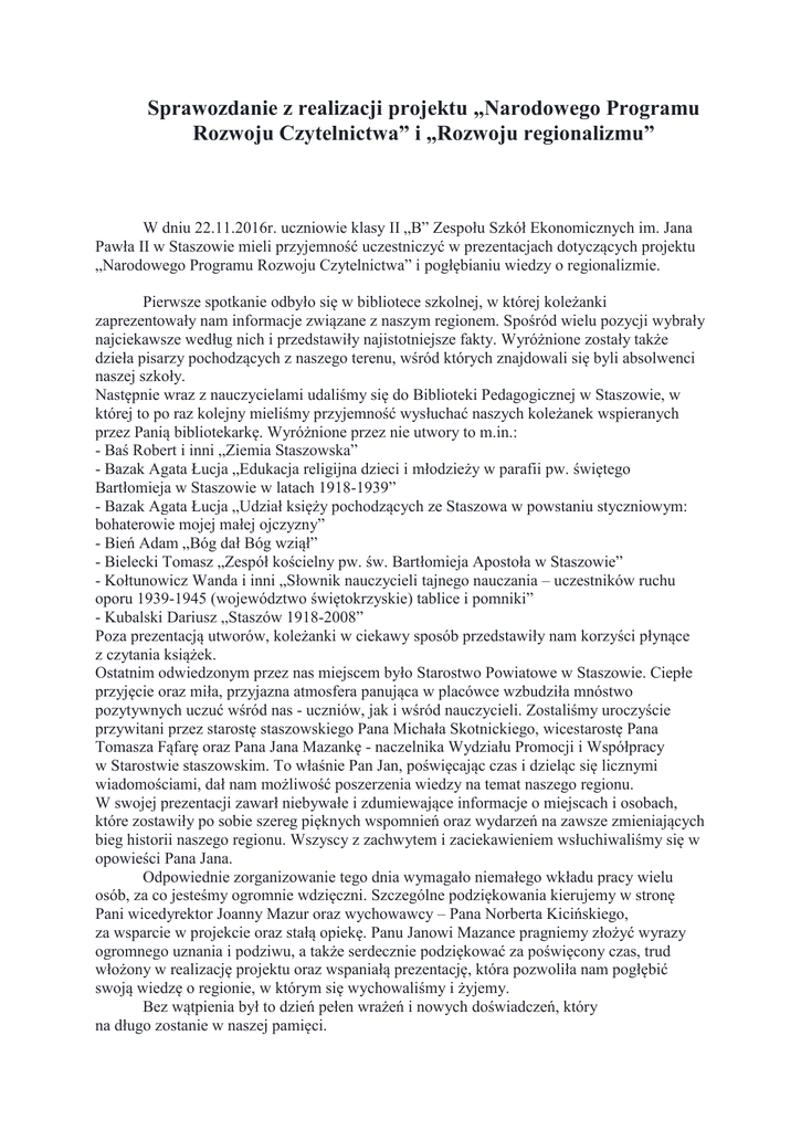 Sprawozdanie z realizacji projektu „Narodowego Programu Rozwoju Czytelnictwa” i „Rozwoju regionalizmu” W dniu 22.11.2016r. uczniowie klasy II „B” Zespołu Szkół Ekonomicznych im. Jana Pawła II w Staszowie mieli przyjemność uczestniczyć w prezentacjach dotyczących projektu „Narodowego Programu Rozwoju Czytelnictwa” i pogłębianiu wiedzy o regionalizmie. Pierwsze spotkanie odbyło się w bibliotece szkolnej, w której koleżanki zaprezentowały nam informacje związane z naszym regionem. Spośród wielu pozycji wybrały najciekawsze według nich i przedstawiły najistotniejsze fakty. Wyróżnione zostały także dzieła pisarzy pochodzących z naszego terenu, wśród których znajdowali się byli absolwenci naszej szkoły. Następnie wraz z nauczycielami udaliśmy się do Biblioteki Pedagogicznej w Staszowie, w której to po raz kolejny mieliśmy przyjemność wysłuchać naszych koleżanek wspieranych przez Panią bibliotekarkę. Wyróżnione przez nie utwory to m.in.: - Baś Robert i inni „Ziemia Staszowska” - Bazak Agata Łucja „Edukacja religijna dzieci i młodzieży w parafii pw. świętego Bartłomieja w Staszowie w latach 1918-1939” - Bazak Agata Łucja „Udział księży pochodzących ze Staszowa w powstaniu styczniowym: bohaterowie mojej małej ojczyzny” - Bień Adam „Bóg dał Bóg wziął” - Bielecki Tomasz „Zespół kościelny pw. św. Bartłomieja Apostoła w Staszowie” - Kołtunowicz Wanda i inni „Słownik nauczycieli tajnego nauczania – uczestników ruchu oporu 1939-1945 (województwo świętokrzyskie) tablice i pomniki” - Kubalski Dariusz „Staszów 1918-2008” Poza prezentacją utworów, koleżanki w ciekawy sposób przedstawiły nam korzyści płynące z czytania książek. Ostatnim odwiedzonym przez nas miejscem było Starostwo Powiatowe w Staszowie. Ciepłe przyjęcie oraz miła, przyjazna atmosfera panująca w placówce wzbudziła mnóstwo pozytywnych uczuć wśród nas - uczniów, jak i wśród nauczycieli. Zostaliśmy uroczyście przywitani przez starostę staszowskiego Pana Michała Skotnickiego, wicestarostę Pana Tomasza Fąfarę oraz Pana Jana Mazankę - naczelnika Wydziału Promocji i Współpracy w Starostwie staszowskim. To właśnie Pan Jan, poświęcając czas i dzieląc się licznymi wiadomościami, dał nam możliwość poszerzenia wiedzy na temat naszego regionu. W swojej prezentacji zawarł niebywałe i zdumiewające informacje o miejscach i osobach, które zostawiły po sobie szereg pięknych wspomnień oraz wydarzeń na zawsze zmieniających bieg historii naszego regionu. Wszyscy z zachwytem i zaciekawieniem wsłuchiwaliśmy się w opowieści Pana Jana. Odpowiednie zorganizowanie tego dnia wymagało niemałego wkładu pracy wielu osób, za co jesteśmy ogromnie wdzięczni. Szczególne podziękowania kierujemy w stronę Pani wicedyrektor Joanny Mazur oraz wychowawcy – Pana Norberta Kicińskiego, za wsparcie w projekcie oraz stałą opiekę. Panu Janowi Mazance pragniemy złożyć wyrazy ogromnego uznania i podziwu, a także serdecznie podziękować za poświęcony czas, trud włożony w realizację projektu oraz wspaniałą prezentację, która pozwoliła nam pogłębić swoją wiedzę o regionie, w którym się wychowaliśmy i żyjemy. Bez wątpienia był to dzień pełen wrażeń i nowych doświadczeń, który na długo zostanie w naszej pamięci.