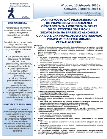 Wrocław, 18 listopada 2016 r. Rozwiązania informatyczne Katowice, 9 grudnia 2016 r. Ośrodek Kształcenia Samorządu Terytorialnego im. Waleriana Pańki CELE SZKOLENIA: Kompleksowe omówienie zasad wnoszenia oświadczeń i opłat za korzystanie z zezwoleń na sprzedaż alkoholu. Na szkoleniu uczestnicy będą mogli zapoznać się z bieżącymi problemami jakie mogą wystąpić w ustalaniu opłat: jak prawidłowo wydać zezwolenie na sprzedaż alkoholu stałe, jednorazowe, cateringowe, jak wygasić zezwolenie, jakie są obowiązki w zakresie ustawy o dostępie do informacji publicznej, jak weryfikować poprawność wniesionych oświadczeń przedsiębiorców, jak przeprowadzać kontrole placówek handlowych, jak przygotowywać przepisy miejscowe w zakresie ustalania opłat za wydanie zezwoleń. KORZYŚCI ZE SZKOLENIA: Uczestnicy w ramach prowadzonego szkolenia będą mogli wynieść praktyczną wiedzę niezbędną do wypełniania nałożonych na nich obowiązków. Dodatkowo uczestnicy mogą na bieżąco wyjaśniać swoje problemy dotyczące tematu szkolenia. JAK PRZYGOTOWAĆ PRZEDSIĘBIORCĘ DO PRAWIDŁOWEGO ZŁOŻENIA OŚWIADCZENIA I WNIESIENIA OPŁAT DO 31 STYCZNIA 2017 ROKU. ZEZWOLENIA NA SPRZEDAŻ ALKOHOLU OD A DO Z. JAK PRAWIDŁOWO ZASTOSOWAĆ PRAWO W PRAKTYCE ORGANU ZEZWALAJĄCEGO. PROGRAM: 1. Polityka informacyjna organu w stosunku do przedsiębiorców w aspekcie terminów wnoszenia oświadczenia i opłat za korzystanie z zezwoleń na sprzedaż alkoholu. Najnowsze orzecznictwo w sprawie cofnięcia zezwolenia z powodu fałszywych danych w oświadczeniu. 2. Zasady wnoszenia opłat w systemie ratalnym – bieżące problemy w praktyce organu: co zrobić z zezwoleniem, którego termin upływa 31 grudnia 2016 roku, dodatkowy 30-dniowy termin do wniesienia opłat – konsekwencje prawne i finansowe dla przedsiębiorcy, obowiązki organu zezwalającego, rezygnacja z zezwolenia w trakcie 30 dniowego terminu – jak prawidłowo obliczyć opłatę. 3. Jak zgodnie z prawem wydać zezwolenie na sprzedaż alkoholu w świetle aktualnie obowiązujących przepisów prawa: ustalenie prawidłowej treści wniosku o wydanie zezwolenia (po 19 maja 2016 r), wezwanie do usunięcia braków – forma i procedura, kiedy i jak należy przeprowadzić postępowanie opiniujące przed komisją, terminy ustawowe, dokumenty w trakcie postępowania, prawidłowy tryb wniesienia opłaty przed wydaniem zezwolenia. 4. Zezwolenia jednorazowe, cateringowe i na wyprzedaż – różnice i podobieństwa: ustalenie organu właściwego, kiedy musi być opinia komisji, termin ważności, zasady wnoszenia opłat za zezwolenia, zasięg terytorialny oraz prawidłowa treść zezwolenia, imprezy masowe, funkcjonowanie zezwoleń „sezonowych”, mobilne punkty sprzedaży alkoholu, dowóz alkoholu do domu, sprzedaż przez internet – aktualne problemy i orzecznictwo, 5. Procedura wygaszania zezwoleń krok po kroku: wszczęcie i przebieg postępowania, problem wyegzekwowania zaległych opłat po wygaszeniu zezwolenia, prawidłowe ustalenie okresu karencji, 6. Obowiązki organu zezwalającego wynikające z ustawy o dostępie do informacji publicznej: kto może być uprawniony do złożenia wniosku o udzielenie informacji dot. zezwoleń alkoholowych i które informacje trzeba udostępniać, istota wniosku o ponowne wykorzystanie informacji publicznej, terminy załatwienia wniosku i procedura organu, 7. Procedura kontroli wiarygodności oświadczeń o wartości sprzedaży alkoholu składanych przez przedsiębiorców a kontrole placówek handlowych w terenie. 8. Cofnięcie zezwolenia: procedura organu, zbieranie materiału dowodowego, skargi sąsiadów, mieszkańców, pisma z policji, kiedy można odmówić wszczęcia postępowania, 9. Reguły prawidłowego konstruowania treści uchwał „alkoholowych” na terenie gminy. co powinno być obiektem chronionym w gminie, zasady ustalania odległości, czas pracy placówek, bezwzględne i czasowe zakazy sprzedaży alkoholu – możliwości prawne i ustalanie obszarów chronionych przez radę gminy, jak i kiedy zmienić limit punktów sprzedaży alkoholu. 10. Jak prawidłowo stosować przepisy kodeksu postępowania administracyjnego w postępowaniu o wydanie, cofnięcie, zmianę i wygaszanie zezwoleń na sprzedaż napojów – porady prawne i praktyczne. S ZKOL EN I E S KI E RO WA N E DO : Osób zajmujących się wydawaniem, cofaniem i kontrolą zezwoleń na sprzedaż napojów alkoholowych, audytorów, kontrolerów. DAN E D O KO NT AKT U : Ośrodek Kształcenia Samorządu Terytorialnego im. Waleriana Pańki 40-014 Katowice ul. Mariacka 1 NIP: 522-000-18-95 Tel 32 259 86 73, 32 253 84 09 Fax. 32 259 86 73 w. 22, 26 e-mail: [email protected] www . oks t .p l OS O BA D O KO NT AKT U : Marlena Moliszewska-Gumulak tel. 32 206 80 39, 32 206 98 43 w. 29 [email protected] Jesteśmy członkiem: KOD SZKOLENIA Proszę właściwy zaznaczyć MIEJSCE SZKOLENIA: Wrocław, siedziba Ośrodka, ul. Piłsudskiego 49 – 57, III piętro. Katowice, siedziba Ośrodka, ul. Mariacka 1, II piętro. Mapkę dojazdu do miejsca szkolenia znajdą Państwo na www.okst.pl/dojazd TERMIN SZKOLENIA: Wrocław: 18 listopada 2016 r. godz. 9.00 – 14.00 Katowice: 9 grudnia 2016 r. godz. 9.00 – 14.00. CENA: 339 zł netto/os., Udział w szkoleniu zwolniony z VAT w przypadku finansowania szkolenia ze środków publicznych. Cena zawiera materiały szkoleniowe, zaświadczenie o ukończeniu szkolenia, poczęstunek i serwis kawowy. ZGŁOSZENIA: Wypełnioną kartę zgłoszenia należy przesłać mailem, faksem lub poprzez formularz zgłoszenia na www.okst.pl do 15 listopada 2016 r. (Wrocław) i do 6 grudnia 2016 r. (Katowice) ☐ Wrocław 1197/16D/G ☐ Katowice 1206/16/G Nazwa nabywcy (dane do faktury) Adres nabywcy (ulica, nr domu, kod pocztowy, miejscowość) NIP Telefon Email 1. Imię i nazwisko uczestnika, stanowisko 2. Imię i nazwisko uczestnika, stanowisko 3. Imię i nazwisko uczestnika, stanowisko Oświadczam, że szkolenie d