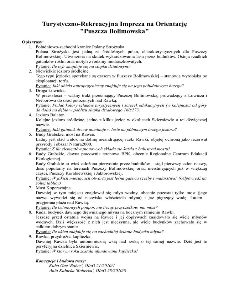 Turystyczno-Rekreacyjna Impreza na Orientację "Puszcza Bolimowska" Opis trasy: 1. Południowo-zachodni kraniec Polany Strożyska. Polana Strożyska jest jedną ze śródleśnych polan, charakterystycznych dla Puszczy Bolimowskiej. Utworzona na skutek wykarczowania lasu przez budników. Ostoja rzadkich gatunków roślin oraz motyli z rodziny modraszkowatych. Pytanie: Ile cyfr znajduje się na słupku działowym? 2. Niewielkie jezioro śródleśne. Tego typu jeziorka spotykane są czasem w Puszczy Bolimowskiej – stanowią wyrobiska po eksploatacji torfu. Pytanie: Jaki obiekt antropogeniczny znajduje się na jego południowym brzegu? 3. Droga Łowicka. W przeszłości – ważny trakt przecinający Puszczę Bolimowską, prowadzący z Łowicza i Nieborowa do osad położonych nad Rawką. Pytanie: Podać kolory szlaków turystycznych i ścieżek edukacyjnych (w kolejności od góry do dołu) na dębie w pobliżu słupka działowego 160/173. 4. Jezioro Balaton. Kolejne jezioro śródleśne, jedno z kilku jezior w okolicach Skierniewic o tej dźwięcznej nazwie. Pytanie: Jaki gatunek drzew dominuje w lesie na północnym brzegu jeziora? 5. Budy Grabskie, most na Rawce. Ładny jest stąd widok na dolinę meandrującej rzeki Rawki, objętej ochroną jako rezerwat przyrody i obszar Natura2000. Pytanie: Z ilu elementów pionowych składa się każda z balustrad mostu? 6. Budy Grabskie, dawna pracownia terenowa BPK, obecnie Regionalne Centrum Edukacji Ekologicznej. Budy Grabskie to wieś założona pierwotnie przez budników – stąd pierwszy człon nazwy, dość popularny na terenach Puszczy Bolimowskiej oraz, nieistniejących już w większej części, Puszczy Korabiewskiej i Jaktorowskiej. Pytanie: W jakich miesiącach otwarta jest leśna galeria rzeźby i malarstwa? (Odpowiedź na żółtej tablicy) 7. Most Kopersztajna. Dawniej w tym miejscu znajdował się młyn wodny, obecnie pozostał tylko most (jego nazwa wywodzi się od nazwiska właściciela młyna) i jaz piętrzący wodę. Latem – przyjemna plaża nad Rawką. Pytanie: Ile betonowych podpór, nie licząc przyczółków, ma most? 8. Ruda, budynek dawnego drewnianego młyna na bocznym ramieniu Rawki. Jeszcze przed ostatnią wojną na Rawce i jej dopływach znajdowało się wiele młynów wodnych. Dziś większość z nich jest nieczynna, ale wiele budynków zachowało się w całkiem dobrym stanie. Pytanie: Ile okien znajduje się na zachodniej ścianie budynku młyna? 9. Rawka, przydrożna kapliczka. Dawniej Rawka była autonomiczną wsią nad rzeką o tej samej nazwie. Dziś jest to peryferyjna dzielnica Skierniewic. Pytanie: W którym roku została ufundowana kapliczka? Koncepcja i budowa trasy: Kuba Gac 'Bober', OInO 21/2010/1 Ania Kałucka 'Boberka', OInO 28/2010/8