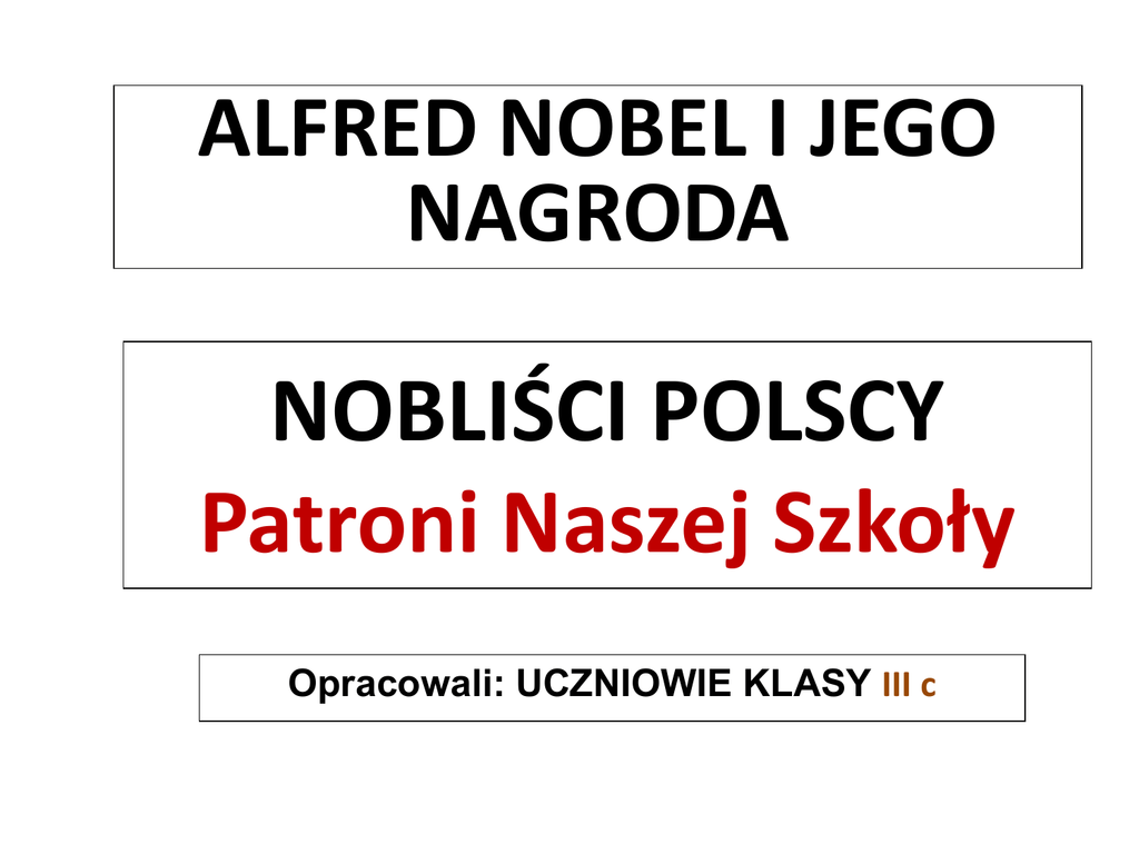 ALFRED NOBEL I JEGO NAGRODA NOBLIŚCI POLSCY Patroni Naszej Szkoły Opracowali: UCZNIOWIE KLASY III c ALFRED NOBEL I JEGO NAGRODA Kim był Alfred Nobel? Przemysłowiec i naukowiec szwedzki, wynalazca dynamitu, fundator Nagrody Nobla. Co to jest Nagroda Nobla? Wyróżnienie przyznawane za wybitne osiągnięcia naukowe, literackie lub zasługi dla społeczeństw i ludzkości, ustanowione ostatnią wolą fundatora, szwedzkiego przemysłowca i wynalazcy dynamitu –Alfreda Nobla. Kto i za co wręcza Nagrodę Nobla? Każdego roku, w dniu 10 grudnia, odbywają się w Sztokholmie i w Oslo uroczystości wręczenia najsłynniejszej i najbardziej prestiżowej spośród wszystkich istniejących na świecie nagród Nagrody Nobla. Nazwa tej nagrody pochodzi od nazwiska jej fundatora, którym był żyjący w latach 1833 - 1895 szwedzki wynalazca i przedsiębiorca, Alfred Nobel. NOBLIŚCI POLSCY Patroni Naszej Szkoły Wisława Szymborska • Wisława Szymborska urodziła się 2 lipca 1923 r. w Bninie koło Poznania (obecnie części Kórnika), jej rodzicami byli Wincenty Szymborski (1870 – 1936) – zarządca zakopiańskich dóbr hrabiego Zamoyskiego (tuż przed urodzeniem córki został przeniesiony do Kórnika w celu uporządkowania tamtejszych spraw finansowych) i Anna Maria z d. Rottermund (1890 – 1960). Nasza polska laureatka Nagrody Nobla po ciężkiej chorobie zmarła 1 lutego 2012 r. Lech Wałęsa Pokojową Nagrodę Nobla Lech Wałęsa otrzymał w 1983 jako lider podziemnej Solidarności. Odebrała ją jego żona Danuta Wałęsa 10 grudnia 1983 roku w Oslo. Osobisty odbiór Nagrody uniemożliwiły władze PRL odmawiając Wałęsie wydania paszportu. Lech Wałęsa urodził się 29 września 1943 w Popowie, koło Lipna na Ziemi Dobrzyńskiej. Czesław Miłosz Czesław Miłosz urodził się w 1911 r. na Litwie. Był poetą piszącym na wzór starotestamentowych proroków. Jego poezja wiązała się z ambicjami odbudowania trwałych wartości europejskiej kultury, sumienia i wiary. Henryk Sienkiewicz • Nagrodzony za „wybitne osiągnięcia w dziedzinie eposu” i – jak podkreślił jeden z jurorów – „rzadko spotykany geniusz, który wcielił w siebie ducha narodu”. • Henryk Sienkiewicz – polski powieściopisarz i nowelista. Urodzony 7 maja 1846 r. (Wola Okrzejska – Podlasie), zmarł 15 listopada 1916 (Vevey Szwajcaria) Władysław Reymont Władysław Stanisław Reymont (prawdziwe nazwisko: Rejment) – polski powieściopisarz i nowelista. Urodzony 6 maja 1867 roku (Kobiele Wielkie – gubernia piotrkowska), zmarł 5 grudnia 1925 roku (Warszawa). Źródła wykorzystane w prezentacji to strony Internetowe: http://pl.wikipedia.org/wiki/Nagroda_Nobla http://www.noblisci.pl/ http://www.polscy-noblisci-pl.com/ http://noblisci.bnet.pl/polacy/polacy.html http://www.poland.gov.pl/Noblisci,6694.html http://www.polscy-noblisci.gleby.net/ http://polska.lovetotravel.pl/polscy_noblisci http://pl.wikipedia.org/wiki/Henryk_Sienkiewicz Dziękujemy za uwagę