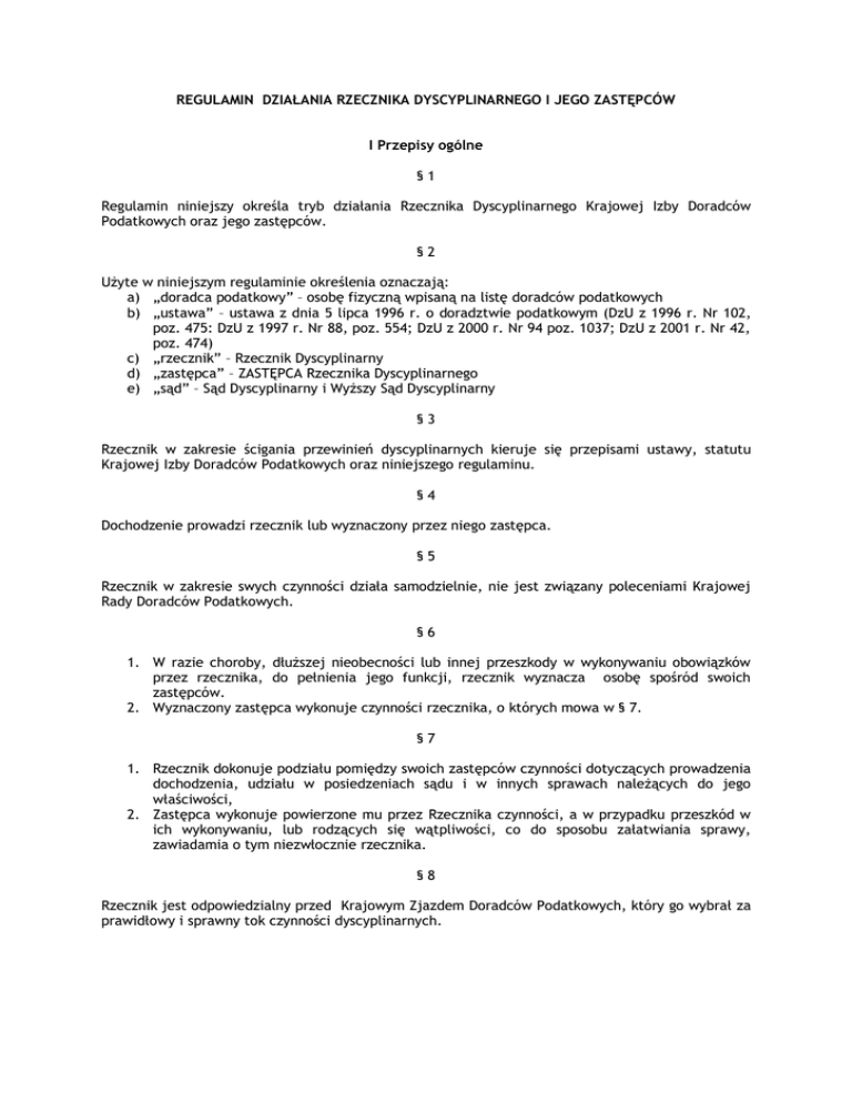 REGULAMIN DZIAŁANIA RZECZNIKA DYSCYPLINARNEGO I JEGO ZASTĘPCÓW I Przepisy ogólne §1 Regulamin niniejszy określa tryb działania Rzecznika Dyscyplinarnego Krajowej Izby Doradców Podatkowych oraz jego zastępców. §2 Użyte w niniejszym regulaminie określenia oznaczają: a) „doradca podatkowy” – osobę fizyczną wpisaną na listę doradców podatkowych b) „ustawa” – ustawa z dnia 5 lipca 1996 r. o doradztwie podatkowym (DzU z 1996 r. Nr 102, poz. 475: DzU z 1997 r. Nr 88, poz. 554; DzU z 2000 r. Nr 94 poz. 1037; DzU z 2001 r. Nr 42, poz. 474) c) „rzecznik” – Rzecznik Dyscyplinarny d) „zastępca” – ZASTĘPCA Rzecznika Dyscyplinarnego e) „sąd” – Sąd Dyscyplinarny i Wyższy Sąd Dyscyplinarny §3 Rzecznik w zakresie ścigania przewinień dyscyplinarnych kieruje się przepisami ustawy, statutu Krajowej Izby Doradców Podatkowych oraz niniejszego regulaminu. §4 Dochodzenie prowadzi rzecznik lub wyznaczony przez niego zastępca. §5 Rzecznik w zakresie swych czynności działa samodzielnie, nie jest związany poleceniami Krajowej Rady Doradców Podatkowych. §6 1. W razie choroby, dłuższej nieobecności lub innej przeszkody w wykonywaniu obowiązków przez rzecznika, do pełnienia jego funkcji, rzecznik wyznacza osobę spośród swoich zastępców. 2. Wyznaczony zastępca wykonuje czynności rzecznika, o których mowa w § 7. §7 1. Rzecznik dokonuje podziału pomiędzy swoich zastępców czynności dotyczących prowadzenia dochodzenia, udziału w posiedzeniach sądu i w innych sprawach należących do jego właściwości, 2. Zastępca wykonuje powierzone mu przez Rzecznika czynności, a w przypadku przeszkód w ich wykonywaniu, lub rodzących się wątpliwości, co do sposobu załatwiania sprawy, zawiadamia o tym niezwłocznie rzecznika. §8 Rzecznik jest odpowiedzialny przed Krajowym Zjazdem Doradców Podatkowych, który go wybrał za prawidłowy i sprawny tok czynności dyscyplinarnych. §9 1. Rzecznik przynajmniej raz w roku przeprowadza naradę z zastępcami w celu omówienia orzecznictwa dyscyplinarnego, rozważanie spornych zagadnień powstałych w praktyce dochodzeniowej, w postępowaniu przed sądem dyscyplinarnym, oraz ujednolicenia i usprawnienia postępowania. 2. Rzecznik może zarządzić wizytację w regionalnym oddziale Krajowej Izby Doradców Podatkowych w zakresie czynności rzecznika uczestnicząc w niej osobiście, lub przez wyznaczonego w tym celu jednego ze swych zastępców. 3. Rzecznik może udzielić wiążących wskazówek zastępcy. II Postępowanie wyjaśniające § 10 Rzecznik wszczyna postępowanie wyjaśniające w przypadku: 1. powzięcia wiadomości o popełnieniu czynu rodzącego odpowiedzialność dyscyplinarną doradcy podatkowego, a w szczególności: a) powiadomienia przez doradcę podatkowego zawierającego co najmniej następujące informację : - imię i nazwisko, adres prowadzenia działalności oraz numer wpisu na listę doradców podatkowych, doradcy podatkowego, któremu zarzuca się przewinienie, - imię i nazwisko, adres prowadzenia działalności oraz numer wpisu na listę doradców podatkowych, doradcy podatkowego zgłaszającego fakt wystąpienia przewinienia dyscyplinarnego, - opis zarzucanych doradcy podatkowemu czynów podlegających ściganiu dyscyplinarnemu, b) złożenia zawiadomienia przez klienta, którego obwiniony obsługiwał o niewykonaniu lun nienależytym wykonaniu obowiązków przez obwinionego, c) informacji w środkach masowego przekazu; 2. na żądanie Krajowej Rady Doradców Podatkowych, 3. na żądanie ministra właściwego do spraw finansów publicznych, 4. na żądanie Ministra Sprawiedliwości. § 11 1. Rzecznik wydaje postanowienie o wszczęciu postępowania wyjaśniającego przesyłając je: - Doradcy podatkowemu obwinionemu o dokonanie przewinienia dyscyplinarnego, - Osobie lub organowi, z informacji którego nastąpiło wszczęcie postępowania. 2. Rzecznik może przekazać prowadzenie postępowania wyjaśniającego zastępcy z regionu na terenie działania, którego toczyć się ma postępowanie. 3. W uzasadnionych przypadkach rzecznik może przekazać prowadzenie postępowania wyjaśniającego zastępcy z innego regionu, za jego zgoda, zamieszczając odpowiednią informację w przesłanym postanowieniu o wszczęciu postępowania wyjaśniającego. 4. Postępowanie wyjaśniające dotyczące członka organu Krajowej Izby Doradców Podatkowych prowadzi rzecznik lub wyznaczony przez niego zastępca wybrany w innym regionie niż działa obwiniony. § 12 1. Celem postępowania wyjaśniającego jest ustalenie czy i przez kogo przewinienie dyscyplinarne zostało popełnione oraz czy istnieje dostateczna podstawa do złożenia wniosku o ukaranie. 2. Postępowanie wyjaśniające polega na wszechstronnym zbadaniu okoliczności faktycznych, koniecznych do ustalenia znamion czynu, który jest zarzucany obwinionemu. 3. Podczas postępowania wyjaśniającego zbierane są i zabezpieczane dowody. 4. Podczas przeprowadzania postępowania wyjaśniającego rzecznik lub prowadzący postępowanie zastępca musi obowiązkowo umożliwić obwinionemu złożenie wyjaśnień. 5. Rzecznik lub prowadzący postępowanie zastępca wyznacza obwinionemu termin do złożenia wyjaśnień do protokołu lub na piśmie. 6. Na uzasadnione żądanie obwinionego, złożone przed upływem tego terminu, wyznaczony termin może zostać przedłużony przez wyznaczenie nowego terminu do złożenia wyjaśnień. 7. Uchybienie przez obwinionego wyznaczonemu terminowi, jest równoznaczne z odmową złożenia przez obwinionego wyjaśnień w postępowaniu wyjaśniającym. § 13 1. Po przeprowadzeniu postępowania wyjaśniającego rzecznik: a) składa wniosek o ukaranie lub b) umarza postępowanie wyjaśniające. 2. Jeżeli zebrane w sprawie dowody dają podstawy do stwierdzenia popełnienia przewinienia dyscyplinarnego, rzecznik lub jego zastępca wydaje stosowne postanowienie o złożeniu wniosku o ukaranie. 3. Z treścią tego