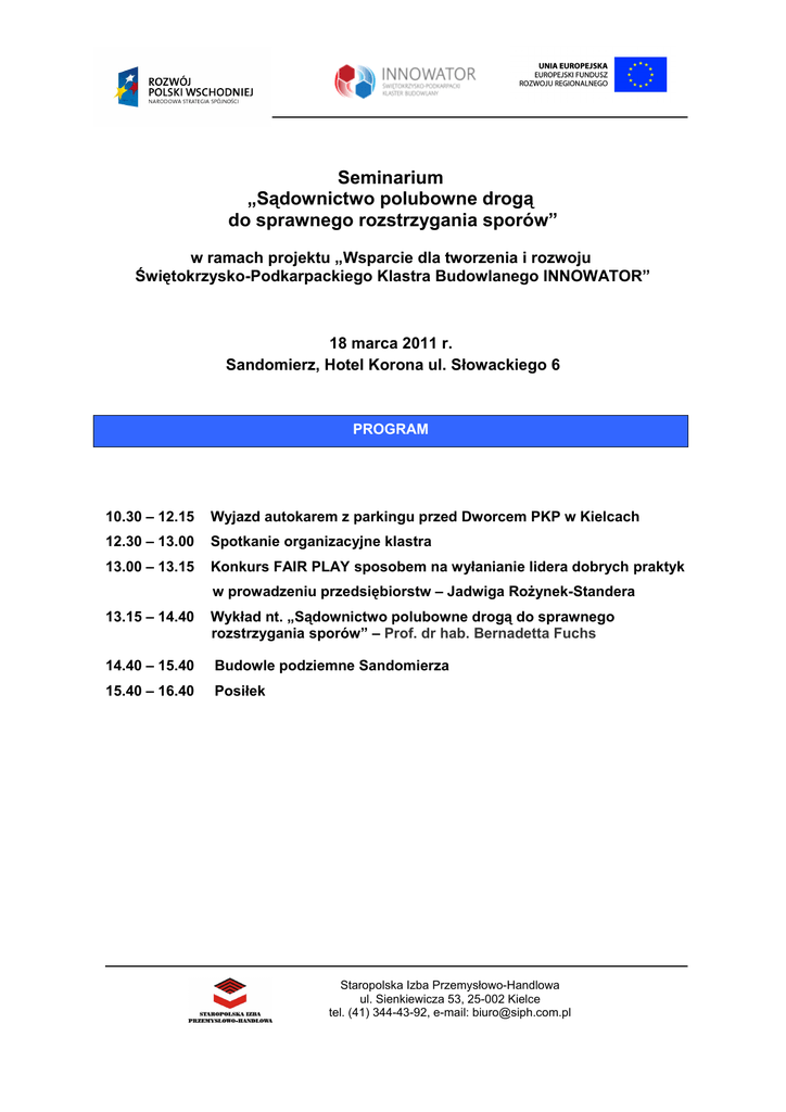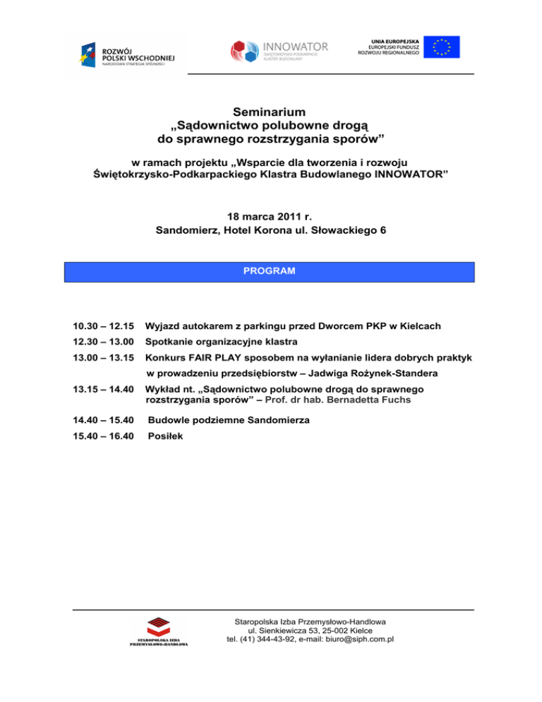 Seminarium „Sądownictwo polubowne drogą do sprawnego rozstrzygania sporów” w ramach projektu „Wsparcie dla tworzenia i rozwoju Świętokrzysko-Podkarpackiego Klastra Budowlanego INNOWATOR” 18 marca 2011 r. Sandomierz, Hotel Korona ul. Słowackiego 6 PROGRAM 10.30 – 12.15 Wyjazd autokarem z parkingu przed Dworcem PKP w Kielcach 12.30 – 13.00 Spotkanie organizacyjne klastra 13.00 – 13.15 Konkurs FAIR PLAY sposobem na wyłanianie lidera dobrych praktyk w prowadzeniu przedsiębiorstw – Jadwiga Rożynek-Standera 13.15 – 14.40 Wykład nt. „Sądownictwo polubowne drogą do sprawnego rozstrzygania sporów” – Prof. dr hab. Bernadetta Fuchs 14.40 – 15.40 Budowle podziemne Sandomierza 15.40 – 16.40 Posiłek Staropolska Izba Przemysłowo-Handlowa ul. Sienkiewicza 53, 25-002 Kielce tel. (41) 344-43-92, e-mail: [email protected]