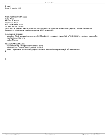 Fiesta Klub Polska trzeci ¶roda, 27 wrzesieñ 2006 NICK KLUBOWICZA: trzeci IMIÊ: Artur MODEL: Fiesta WERSJA: XR2i ROCZNIK: MK3, 1991 SILNIK: 1.6 8V 104KM OPIS AUTA: Jedno z najd³u¿szych sta¿em aut w Klubie. Obecnie w rêkach drugiego ju¿ z kolei Klubowicza. Poprzednio u £okmena, dlatego nazywane „Spadkiem― DOKONANE ZMIANY: - wizualne: Obni¿one zawieszenie, przód SPAX (-60) z regulacj± twardo¶ci, ty³ KONI (-60) z regulacj± wysoko¶ci. - mechaniczne: Nie by³o - audio: Pioneer PLANOWANE ZMIANY: - wizualne : Felgi 14-ki polakierowane na bia³o - mechaniczne : Przeróbka na wersjê 110 KM - audio : Wymiana przednich g³o¶ników na zestaw odseparowany + wzmacniacz   http://www.fiestaklubpolska.pl Powered by Joomla! Wygenerowano: 8 March, 2017, 08:10