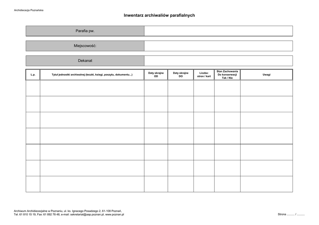 Archidiecezja Poznańska Inwentarz archiwaliów parafialnych Parafia pw. Miejscowość: Dekanat L.p. Tytuł jednostki archiwalnej (teczki, ksiegi, poszytu, dokumentu...) Archiwum Archidiecezjalne w Poznaniu, ul. ks. Ignacego Posadzego 2, 61-108 Poznań, Tel. 61 810 15 19, Fax: 61 892 78 48, e-mail: [email protected], www.poznan.pl Daty skrajne OD Daty skrajne DO Liczba: stron / kart Stan Zachowania Do konserwacji Tak / Nie Uwagi Strona .......... / ..........