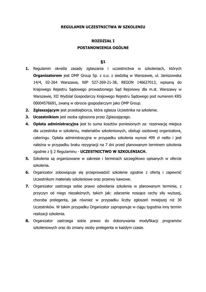REGULAMIN UCZESTNICTWA W SZKOLENIU ROZDZIAŁ I POSTANOWIENIA OGÓLNE §1 1. Regulamin określa zasady zgłaszania i uczestnictwa w szkoleniach, których Organizatorem jest DMP Group Sp. z o.o. z siedzibą w Warszawie, ul. Janiszowska 14/4, 02-264 Warszawa, NIP 527-269-21-38, REGON 146627013, wpisaną do Krajowego Rejestru Sądowego prowadzonego Sąd Rejonowy dla m.st. Warszawy w Warszawie, XII Wydział Gospodarczy Krajowego Rejestru Sądowego pod numerem KRS 00004576691, zwaną w obrocie gospodarczym jako DMP Group. 2. Zgłaszającym jest przedsiębiorca, która zgłasza Uczestnika na szkolenie. 3. Uczestnikiem jest osoba zgłoszona przez Zgłaszającego. 4. Opłata administracyjna jest to suma kosztów poniesionych za: rezerwację miejsca dla uczestnika w szkoleniu, materiałów szkoleniowych, obsługi osobowej organizatora, cateringu. Opłata administracyjna w przypadku szkolenia wynosi 499 zł netto i jest należna w przypadku braku rezygnacji na 7 dni przed planowanym terminem szkolenia zgodnie z § 2 Regulaminu - UCZESTNICTWO W SZKOLENIACH. 5. Szkolenia są organizowane w zakresie i terminach szczegółowo opisanych w ofercie szkolenia. 6. Organizator zobowiązuje się przeprowadzić szkolenie zgodnie z ofertą i zapewnić Uczestnikom materiały szkoleniowe oraz przerwy kawowe. 7. Organizator zastrzega sobie prawo odwołania szkolenia w planowanym terminie, z przyczyn od niego niezależnych, takich jak: zdarzenie noszące cechy siły wyższej, choroba prelegenta, jak również w przypadku liczby zgłoszeń mniejszej niż 30 Uczestników. W takim przypadku Organizator zaproponuje w ciągu tygodnia inny termin realizacji szkolenia. 8. Organizator zastrzega sobie prawo do dokonywania modyfikacji szkoleniowych oraz do zmiany osoby prelegenta w każdym czasie. programów ROZDZIAŁ II UCZESTNICTWO W SZKOLENIACH §1 Przyjmowanie zgłoszeń 1. Zgłoszenia można dokonać poprzez przesłanie wypełnionego formularza uczestnictwa lub poprzez stronę internetową Organizatora (www.dmpgroup.pl) najpóźniej na 7 dni przed planowanym terminem szkolenia z zastrzeżeniem punktu poniższego. 2. Organizator dopuszcza możliwość przyjęcia zgłoszeń po terminie 7 dniowym, o którym mowa w pkt. 1 powyżej, z zastrzeżeniem, że Zgłaszający nie może złożyć rezygnacji z udziału w szkoleniu i w pełni pokrywa koszty organizacyjne za zgłoszonych przez siebie Uczestników w przypadku niestawienia się ich na szkoleniu. 3. Organizator dopuszcza również możliwość zgłoszenia telefonicznego. Aby zgłoszenie telefoniczne było skuteczne i prawnie wiążące, Organizator wyśle e-maila do Zgłaszającego z potwierdzeniem danych Uczestników zgłoszonych telefonicznie, a Zgłaszający potwierdzi zgodność przedmiotowych danych w e-mailu zwrotnym do Organizatora. 4. Ilość miejsc na szkolenie jest ograniczona. O wpisaniu na listę uczestników decyduje kolejność zgłoszeń. 5. Za termin dostarczenia zgłoszenia przyjmuje się datę jego wpływu do skrzynki emailowej Organizatora. 6. Zgłoszenie na szkolenie w jakiejkolwiek formie jest wiążącą umową oraz jest równoznaczne z zapoznaniem się z treścią niniejszego Regulaminu i akceptacją zawartych w nim warunków przez Zgłaszającego. 7. Organizator zastrzega sobie prawo selekcji zgłoszeń, w szczególności do odrzucania zgłoszeń kierowanych przez jednostki prowadzące działalność konkurencyjną wobec Organizatora. §2 Rezygnacja z udziału w szkoleniu 1. Zgłaszający może złożyć rezygnację z udziału w szkoleniu. Rezygnacja musi zostać złożona w formie elektronicznej na adres mailowy Organizatora. 2. W przypadku złożenia rezygnacji do 7 dni przed wyznaczonym terminem szkolenia, Zgłaszający nie ponosi żadnych kosztów z zastrzeżeniem §1 pkt.2 niniejszego rozdziału. 3. W przypadku wycofania udziału w szkoleniu w okresie krótszym niż 7 dni przed planowanym terminem szkolenia, Zgłaszający jest zobowiązany pokryć 100% opłat administracyjnych za każdego zgłoszonego przez siebie Uczestnika. 4. W przypadku nieobecności Uczestnika na szkoleniu, bez złożonej wcześniej rezygnacji w odpowiednim terminie, Zgłaszający jest zobowiązany pokryć 100% opłaty administracyjnej za szkolenie. 5. Zmiana Uczestnika szkolenia przez Zgłaszającego jest nieodpłatna. 6. Zmiana Uczestnika szkolenia przez Zgłaszającego powinna nastąpić po uprzednim zgłoszeniu tego faktu do Organizatora. 7. W przypadku odwołania szkolenia przez Organizatora, Organizator zobowiązany jest w ciągu 7 dni wyznaczyć kolejny termin szkolenia. ROZDZIAŁ III FINANSE §1 Odpłatność za szkolenie Szkolenia organizowane przez Organizatora są nieodpłatne, z zastrzeżeniem § 2 Regulaminu - UCZESTNICTWO W SZKOLENIACH. §2 Dodatkowe świadczenie 1. Zgłaszającemu przysługuje prawo do dodatkowego świadczenia w postaci 2 godzin pomocy prawnej świadczonej przez Organizatora na rzecz Zgłaszającego. 2. Warunkiem koniecznym do zrealizowania świadczenia o którym mowa w pkt. 1 powyżej jest podpisanie umowy na obsługę prawną z Organizatorem na kwotę nie niższą niż 99 zł netto miesięcznie. ROZDZIAŁ IV UWAGI ORGANIZACYJNE §1 Techniczna strona szkolenia 1. Na co najmniej 45 minut przed wyznaczoną godziną szkolenia pracownik Organizatora pozostaje do dyspozycji Uczestników w celu: weryfikacji listy obecności oraz wydania materiałów szkoleniowych. §2 Prawa i obowiązki uczestnika w ramach szkolenia 1. Koszty wynikające z dojazdu na szkolenie i zakwaterowanie spoczywają na uczestniku szkolenia. 2. Zgodnie z Ustawą o ochronie danych osobowych z dnia 29 sierpnia 1997 roku (Dz. U. z roku 1997, nr 133, poz. 883), Zgłaszający wyraża zgodę na przetwarzanie swoich danych osobowych przez Organizatora w celu organizowania i realizacji szkoleń. 3. Podane przez Uczestnika dane osobowe będą przetwarzane, w celu realizacji zadań związanych z obsługą szkolenia i informowania o ofercie, przez DMP Group Sp. z o. o., z siedzibą w W