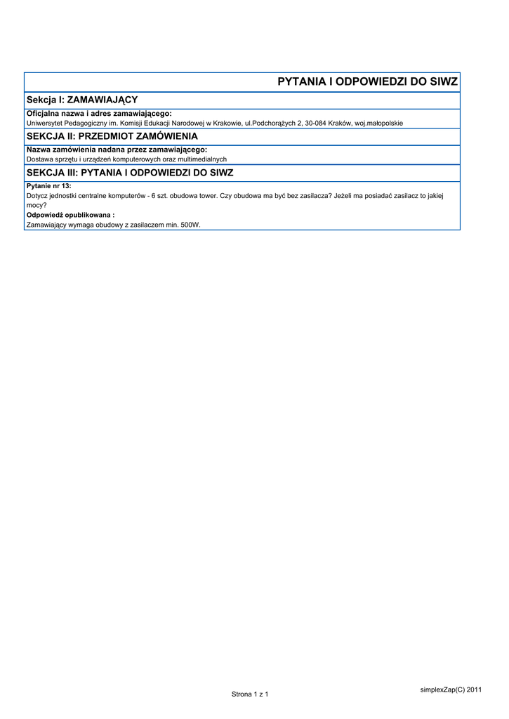 PYTANIA I ODPOWIEDZI DO SIWZ Sekcja I: ZAMAWIAJĄCY Oficjalna nazwa i adres zamawiającego: Uniwersytet Pedagogiczny im. Komisji Edukacji Narodowej w Krakowie, ul.Podchorążych 2, 30-084 Kraków, woj.małopolskie SEKCJA II: PRZEDMIOT ZAMÓWIENIA Nazwa zamówienia nadana przez zamawiającego: Dostawa sprzętu i urządzeń komputerowych oraz multimedialnych SEKCJA III: PYTANIA I ODPOWIEDZI DO SIWZ Pytanie nr 13: Dotycz jednostki centralne komputerów - 6 szt. obudowa tower. Czy obudowa ma być bez zasilacza? Jeżeli ma posiadać zasilacz to jakiej mocy? Odpowiedź opublikowana : Zamawiający wymaga obudowy z zasilaczem min. 500W. Strona 1 z 1 simplexZap(C) 2011