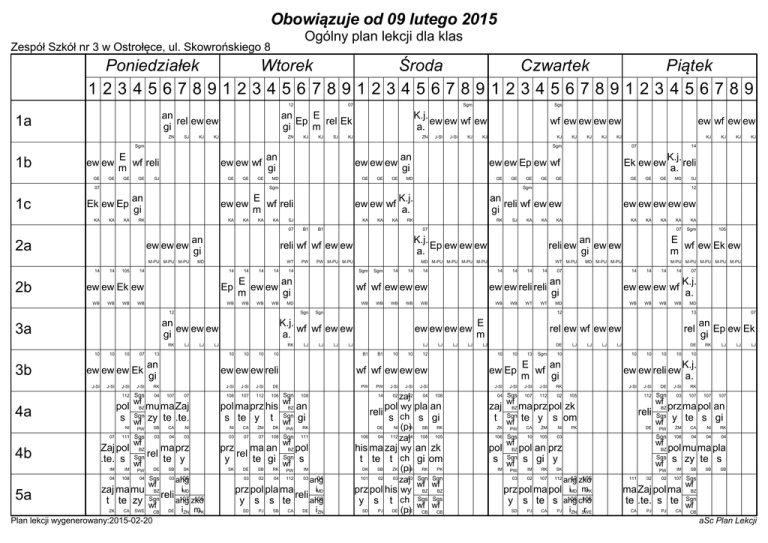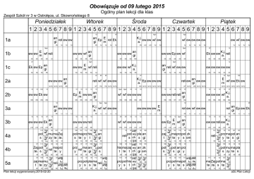Obowiązuje od 09 lutego 2015 Ogólny plan lekcji dla klas Zespół Szkół nr 3 w Ostrołęce, ul. Skowrońskiego 8 Poniedziałek Wtorek Środa Czwartek Piątek 123456789123456789123456789123456789123456789 12 an rel ew ew gi 1a ZN SJ KJ 07 Sgm an E Ep rel Ek gi m KJ ZN KJ KJ SJ Sgs K.j. ew ew wf ew a. KJ ZN J-SI J-SI KJ wf ew ew ew ew KJ KJ Sgm 1b ew ew GE GE GE ew ew wf SJ GE GE GE 07 1c KA an gi ew ew ew MD GE KA KA an gi ew ew RK KA KA E wf reli m KA KA an ew ew ew gi 2a M-PU M-PU M-PU 2b Ep WB WB WB 14 14 14 3b 07 13 ew ew ew Ek an gi J-SI 10 J-SI 10 J-SI J-SI RK 112 Sgs 04 LJ LJ 107 07 111 Sgs 03 04 03 wf Zaj pol BZ ma prz Sgn rel te y .te. s wf IM IM DE SB SK PW 106 ang wf iMD zaj ma mu BZ reli 107 105 Sgn ang zko t te zy wf ZK CA SWE DE iZN mPK CB Plan lekcji wygenerowany:2015-02-20 04 5a 108 04 Sgs 03 KA KA GE WB WB WB LJ 10 J-SI J-SI DE 108 107 112 106 LJ Sgm 14 14 108 Sgn 111 wf PW 04 ang i prz pol pla ma MD reli 108 ang y s s te SD PJ SB CA DE iZN 02 04 112 03 KA GE GE MD KA KA WB WB WB WT M-PU 14 WB 14 07 ew ew reli reli an gi WB 14 WB 14 WT LJ LJ LJ B1 10 10 LJ 12 PW J-SI J-SI J-SI zaj02 04 108 pol wy pla an reli s ch s gi DE NI (p) NI SB RK 106 04 112 zaj04 108 105 his ma zaj wy an zk t te t ch gi om DK SB ZK (p) SB RK PK 101 02 03 Sgn Sgn zaj03 wf wf prz pol his wy BZ BZ Sgs Sgs y s t ch wf wf SD PJ DE (p) DE CB CB 14 02 LJ LJ WT KA KA KA KA 07 Sgm MD M-PU M-PU M-PU M-PU M-PU M-PU M-PU 14 14 14 14 ew ew ew wf MD DE 10 ew Ep 13 Sgm WB WB WB WB LJ LJ J-SI J-SI J-SI RK Sgs 107 112 02 LJ LJ 10 10 ew ew reli ew K.j. a. J-SI 105 105 DE J-SI RK 112 Sgn 03 107 DE wf 12 zko 105 ang i m prz pol ma pol MD PK 108 chó 106 y s te s ang SD PJ CA PJ iZN SWE r 107 112 LJ 107 107 LJ LJ prz ma pol an wf y te s gi ŻM CA NI RK BZ PW 108 04 04 04 wf pol mu ma pla Sgs s zy te s wf BZ PW 02 RK Sgs Sgn 03 pol BZ pol an prz Sgn s gi y s wf IM IM RK SK 03 10 J-SI reli PW 10 07 wf zaj BZ ma prz pol zk Sgn te y t wf s om ZK CA ŻM NI PK Sgs MD DE 10 wf 106 K.j. a. an rel Ep ew Ek gi 10 E an wf m gi 04 07 13 10 J-SI 105 E wf ew Ek ew m rel ew wf ew ew LJ 10 SJ ew ew ew ew ew an reli ew ew ew gi E ew ew ew ew m PW 108 prz ma an BZ pol rel Sgn s y te gi wf SK DE SB RK IM 03 14 wf wf ew ew ew PW 07 GE KJ K.j. reli a. 12 B1 Sgn KA MD M-PU M-PU M-PU M-PU WB LJ SJ Sgn pol ma prz his BZ an Sgn gi s te y t wf NI CA ŻM DK RK 07 RK wf wf ew ew ew wf 03 Ek ew ew GE KJ 12 K.j. Ep ew ew ew a. Sgm 10 J-SI GE KJ 14 07 MD RK 10 GE KJ 07 an reli wf ew ew gi RK PW M-PU M-PU ew ew ew reli PW 4b GE K.j. a. K.j. wf wf ew ew a. 10 pol BZ mu ma Zaj Sgn zy te .te. s wf NI SB CA NI 07 PW Sgn wf 4a KJ ew ew Ep ew wf MD B1 E an ew ew m gi an ew ew ew gi RK KA B1 14 12 3a ew ew wf SJ WT ew ew Ek ew WB 105 MD 14 10 GE reli wf wf ew ew 14 WB 14 KJ Sgm 07 14 GE an gi Sgm Ek ew Ep KJ Sgm E wf reli m GE KJ ew wf ew ew 111 02 PW IM SB 02 107 Sgs SB SB wf ma Zaj pol ma BZ Sgn te .te. s te wf CA PJ PJ CA CB aSc Plan Lekcji Zespół Szkół nr 3 w Ostrołęce, ul. Skowrońskiego 8 Poniedziałek Wtorek Środa Czwartek Piątek 123456789123456789123456789123456789123456789 04 03 04 108 Sgs 105 02 wf 5b zaj pol ma an BZ mu Sgn zy t s te gi wf ZK PJ ZK ZN SWE 111 101 Sgs 106 Sgs 03 SK ZK SB SJ PK 108 107 111 105 111 108 PW PW 106 108 1A 1B 2A 2B 3A 3B 112 04 106 03 Sgn wf an ma wd zaj his BZ reli Sgn gi te ż t t wf ZN CA ŻM ZK DK DE PK PW 101 Plan lekcji wygenerowany:2015-02-20 107 112 111 111 106 B3 B3 wf wf bio pol pol CW CW His Sgn Sgn l s s wf Wółko wf Wółko 112 CB 111 105 111 zaj ma mu an wy prz pol te zy gi ch y s CA SWE PM (p) IM SD IM 03 04 106 111 107 105 zaj zko ma pla wy pol an mPK te s ch s gi CA SB (p) DK IM ZN 108 107 105 107 108 106 Sgn 112 04 DK wski wski MJ MJ DK wski S-SB SB S-SB 03 02 B2 B2 04 111 105 B1 02 101 04 ŁW SA wski wski NI NI SWE wski PM ŁW 101 07 nie mAA 02 112 101 107 106 03 111 101 101 wf Sgs wf 04 nie 107 pol ch CW m AA ma reli 105 07 Sgn s ang te e wf info CW CB S-SB SD WT PK iZN MJ 111 101 106 Sgn 108 112 101 ŻM SD MJ DK KB 101 107 105 03 112 Sgn 108 101 106 106 wf pol ma CW nie pol His Sgs reli s te wf m s S-SB ŁW DK AA S-SB SJ CB 04 105 Sgn wf 03 107 106 fiz pol inf CW ma wo Sgs reli te s y s o wf ŁW NI PK DE MJ SA CB 106 Sgn CB PK 112 106 an CW ch ma nie an ed Sgs e te m gi be gi wf PM SD MJ AA PM BK CB 04 108 108 111 105 101 111 07 wf SWE 111 Sgs 111 108 112 106 112 101 03 Sgn 106 111 07 SWE 04 wf zart CB SWE 108 101 Sgs 106 03 101 PW 107 101 04 03 112 108 Sgn 03 wf 106 chó r SWE ge fiz nie CW SB pol His Sgn 106 s og y m wf zart ŻM DK ŁW AA NI 03 04 101 07 B1 ang wf ma iMD zaj ge CW reli 108 t og Sgn te ang wf SJ MJ iRK ZK ŻM Wółko wski 04 fiz zaj ma an BZ pol reli Sgn y t te gi Wółko wf s ŁW ZK ŁW SJ PM NI wski 02 Sgn 105 112 04 105 112 ang zart SB wf info iZN wo pol CW PK bio 07 s 105 Sgs l ang s info wf iRK SA PJ PK CB KB 106 111 111 101 Sgs 112 ang wf wo pol iMD CW bio His 106 Sgn l s s nie wf DK SA S-SB m KB AA CB 108 02 Sgs ma prz BZ his pol reli Sgn t te y wf s CA SD DK IM DE 04 CB 111 wf 02 Sgn 02 PW 111 wf zart 112 Sgs wf 112 pol ge ch ma CW SB Sgn 106 s og e te wf zart S-SB ŻM SD ŁW 106 his ma BZ pol an Sgn s gi t te wf DK CA IM PM SWE 101 04 CB 106 AA DK 02 SK 111 101 CW 107 ZN 04 ŁW ŻM SD SD NI SWE r 04 07 107 105 ang 07 Sgs nie wf fiz mAA iZN CW zaj ma 07 nie 105 Sgn t reli te chó 106 y ang wf ŁW iRK mAA CB ZK WT MJ SWE r 04 106 107 101 108 02 ang iMD ma fiz zaj His 106 reli 106 ang te y chó t ZK DK iZN MJ ŁW WT SWE r SB Sgs 101 PJ Sgs nie ma ge ch bio pol 106 m te og e l s chó an fiz an ed 105 wf gi y gi be info PM ŁW PM BK His ZK 107 PW wf 105 chó r SWE r PJ 03 03 wf 108 108 101 107 ang pol iMD mu fiz ma reli 03 zy y te chó 106 s ang SJ S-SB iRK SWE ŁW MJ SWE r iRK 03 nie info ge ch ma PK bio pol mAA Sgs l 108 og e te wf s ang ŻM SD MJ KB S-SB iZN CB PJ 03 an ma his BZ wd reli Sgn ż gi te t wf ZN SJ ZK DK ŻM ma pol BZ pol mu prz Sgn s zy y chó 106 te s wf CA IM IM SWE SD r pol ge ch ma bio His 02 s og e te l ang 112 03 wf pol Z.d mu BZ an ma pla Sg