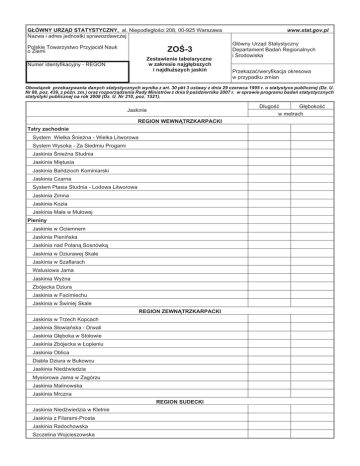 G£ÓWNY URZ¥D STATYSTYCZNY, al. Niepodleg³oœci 208, 00-925 Warszawa Nazwa i adres jednostki sprawozdawczej Polskie Towarzystwo Przyjació³ Nauk o Ziemi ZOŒ-3 Zestawienie tabelaryczne w zakresie najg³êbszych i najd³u¿szych jaskiñ Numer identyfikacyjny - REGON www.stat.gov.pl G³ówny Urz¹d Statystyczny Departament Badañ Regionalnych i Œrodowiska Przekazaæ/weryfikacja okresowa w przypadku zmian Obowi¹zek przekazywania danych statystycznych wynika z art. 30 pkt 3 ustawy z dnia 29 czerwca 1995 r. o statystyce publicznej (Dz. U. Nr 88, poz. 439, z póŸn. zm.) oraz rozporz¹dzenia Rady Ministrów z dnia 9 paŸdziernika 2007 r. w sprawie programu badañ statystycznych statystyki publicznej na rok 2008 (Dz. U. Nr 210, poz. 1521). D³ugoœæ G³êbokoœæ w metrach Jaskinie REGION WEWN¥TRZKARPACKI Tatry zachodnie System Wielka Œnie¿na - Wielka Litworowa System Wysoka - Za Siedmiu Progami Jaskinia Œnie¿na Studnia Jaskinia Miêtusia Jaskinia Bañdzioch Kominiarski Jaskinia Czarna System Ptasia Studnia - Lodowa Litworowa Jaskinia Zimna Jaskinia Kozia Jaskinia Ma³a w Mu³owej Pieniny Jaskinie w Ociemnem Jaskinia Pieniñska Jaskinia nad Polan¹ Sosnówk¹ Jaskinia w Dziurawej Skale Jaskinia w Szaflarach Walusiowa Jama Jaskinia Wy¿na Zbójecka Dziura Jaskinia w Facimiechu Jaskinia w Œwiniej Skale REGION ZEWN¥TRZKARPACKI Jaskinia w Trzech Kopcach Jaskinia S³owiañska - Drwali Jaskinia G³êboka w Sto³owie Jaskinia Zbójecka w £opieniu Jaskinia Oblica Diabla Dziura w Bukowcu Jaskinia NiedŸwiedzia Mysiorowa Jama w Zagórzu Jaskinia Malinowska Jaskinia Mrczna REGION SUDECKI Jaskinia NiedŸwiedzia w Kletnie Jaskinia z Filarami-Prosta Jaskinia Radochowska Szczelina Wojcieszowska D³ugoœæ G³êbokoœæ w metrach Jaskinie REGION SUDECKI (dok.) Jaskinia Nowa Jaskinia na Œcianie Jaskinia Imieninowa Jaskinia B³otna Z³ota Sztolnia Jaskinia Kryszta³owa REGION GÓR ŒWIÊTOKRZYSKICH System Chelosiowa Jama - Jaskinia Jaworznicka Jaskinia Pajêcza Jaskinia w Sztolni Zofia na Miedziance Jaskinia Raj Szczelina na Kadzielni Jaskinia Zbójecka w £agowie Jaskinia Gwarecka Jaskinia Wschodnia na Kadzielni Jaskinia na Wietrzni Jaskinia Piek³o pod Skibami REGION WY¯YNY KRAKOWSKO-CZÊSTOCHOWSKIEJ Jaskinia wierna Jaskinia Wierzchowska Górna Jaskinia Brzozowa Jaskinia Szachownica I Jaskinia pod Skipirzep¹ Jaskinia Twardowskiego Piêtrowa Szczelina Jaskinia Koralowa Jaskinia Studnisko Jaskinia Nietoperzowa REGION NIECKI NIDZIAÑSKIEJ Jaskinia Skorocicka Jaskinia Sawickiego Jaskinia w Skorocicach u Ujœcia Doliny Jaskinia Pó³nocna Du¿a Jaskinia w Gackach Jaskinia pod Œwiecami Jaskinia Dzwonów Jaskinia Stara Jaskinia Flisa Jaskinia w Aleksandrowie E-mail osoby sporz¹dzaj¹cej sprawozdanie - WYPE£NIAÆ WIELKIMI LITERAMI .............................................................. (imiê, nazwisko i telefon osoby sporz¹dzaj¹cej sprawozdanie) ............................................................ (miejscowoœæ, data) ............................................................... (piecz¹tka imienna i podpis osoby dzia³aj¹cej w imieniu sprawozdawcy)