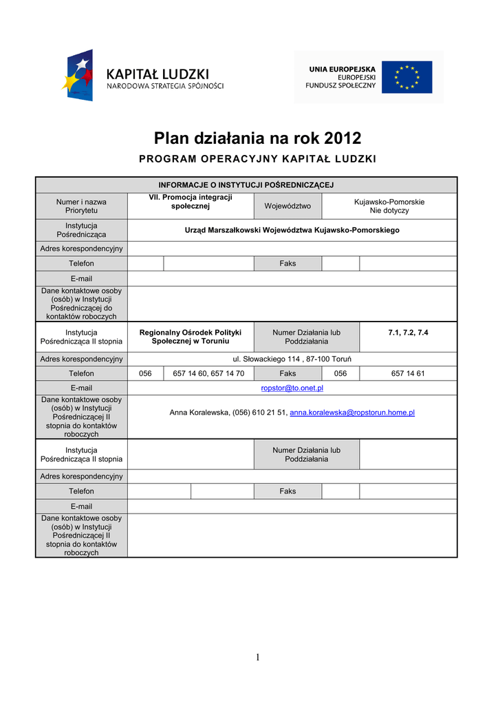 Plan działania na rok 2012 PROGRAM OPERACYJNY KAPITAŁ LUDZKI INFORMACJE O INSTYTUCJI POŚREDNICZĄCEJ Numer i nazwa Priorytetu VII. Promocja integracji społecznej Instytucja Pośrednicząca Kujawsko-Pomorskie Nie dotyczy Województwo Urząd Marszałkowski Województwa Kujawsko-Pomorskiego Adres korespondencyjny Telefon Faks E-mail Dane kontaktowe osoby (osób) w Instytucji Pośredniczącej do kontaktów roboczych Instytucja Pośrednicząca II stopnia Regionalny Ośrodek Polityki Społecznej w Toruniu Adres korespondencyjny Telefon Numer Działania lub Poddziałania ul. Słowackiego 114 , 87-100 Toruń 056 657 14 60, 657 14 70 Faks E-mail Dane kontaktowe osoby (osób) w Instytucji Pośredniczącej II stopnia do kontaktów roboczych 7.1, 7.2, 7.4 056 657 14 61 [email protected] Anna Koralewska, (056) 610 21 51, [email protected] Instytucja Pośrednicząca II stopnia Numer Działania lub Poddziałania Adres korespondencyjny Telefon Faks E-mail Dane kontaktowe osoby (osób) w Instytucji Pośredniczącej II stopnia do kontaktów roboczych 1 KARTA DZIAŁANIA 7.1 Poddziałanie 7.1.1 Projekty, któr ych realizacja jest kontynuow ana B1.1 PROJEKT REALIZOWANY W TRYBIE SYSTEMOWYM Nr umowy z KSI i tytuł projektu nie dotyczy Beneficjent systemowy 139 ośrodków pomocy społecznej Okres realizacji projektu 02.2008-12.2013* Kwota poniesionych/planowanych wydatków w projekcie w latach 2007-2011 (w tym krajowy wkład publiczny) w roku 2012 (w tym krajowy wkład publiczny) 95 108 721,18 PLN (14 266 308,18 PLN) 34 687 285,61 PLN (5 203 092,84 PLN) ogółem w projekcie (w tym krajowy wkład publiczny) 170 101 280,30 PLN (25 515 192,05 PLN) Kryteria dostępu 1. Szczegółowe kryteria wyboru projektów Projekt jest skierowany w co najmniej 10% do osób niepełnosprawnych. Uzasadnienie: 2. Niepełnosprawność jest problemem społecznym i wymaga wielu działań pomocowych. Osoby niepełnosprawne wymagają podwójnej pomocy, po pierwsze - ze względu na swoją fizyczną i/lub umysłową niepełnosprawność, po drugie – z uwagi na trudności i bariery związane z integracją społeczno-zawodową. Stopień zatrudnienia osób niepełnosprawnych w województwie kujawsko-pomorskim jest niski. Według danych z Badania Aktywności Ekonomicznej Ludności (Bank Danych Lokalnych Głównego Urzędu Statystycznego) w województwie kujawsko-pomorskim wskaźnik zatrudnienia osób niepełnosprawnych w wieku aktywności zawodowej 15-64 lat, w 2010 r. wyniósł 20,7%; podczas gdy dla wszystkich osób w wieku aktywności zawodowej wynosił on 62,5%. Efekty dotychczas realizowanych projektów, skłaniają do wniosku, iż nadal istnieje potrzeba wspierania osób niepełnosprawnych, również w ramach projektów systemowych. W 2010 r. osoby niepełnosprawne korzystające z zasiłków okresowych stanowiły 8,81% wszystkich klientów ośrodków pomocy społecznej korzystających z zasiłków okresowych (dane MPiPS za 2010 r.). Na podstawie powyższych danych Instytucja Wdrażająca uznała, 10% udział osób niepełnosprawnych za uzasadniony. Kryterium zostanie zweryfikowane na podstawie zapisów we wniosku o dofinansowanie realizacji projektu. Projekt zakłada realizację instrumentu aktywizacji edukacyjnej: skierowanie i sfinansowanie zajęć szkolnych, związanych z uzupełnianiem wykształcenia na poziomie podstawowym, gimnazjalnym, ponadgimnazjalnym lub policealnym z uwzględnieniem realnych potrzeb uczestników projektu. 2 Uzasadnienie: Uzupełnienie wykształcenia nie tylko ułatwia późniejsze znalezienie zatrudnienia, ale również jest znaczącym czynnikiem inicjującym zmiany świadomościowe wśród klientów pomocy społecznej. Wprowadzone kryterium ma za zadanie zwrócić szczególną uwagę beneficjentów systemowych na planowanie ścieżki wsparcia dla uczestników projektów z uwzględnieniem instrumentu aktywizacji edukacyjnej. Jednocześnie nie można zapomnieć o tym, by wybór wsparcia proponowanego uczestnikom projektu każdorazowo odpowiadał na ich aktualne potrzeby. Stąd też nie będzie wymagane zastosowanie instrumentu aktywizacji edukacyjnej dla każdego uczestnika projektu, ani dla określonego procentu uczestników. Kryterium dostępu uznaje się za spełnione, nawet jeśli tylko jeden spośród uczestników projektu skorzysta z tego rodzaju wsparcia. Kryterium zostanie zweryfikowane na podstawie zapisów we wniosku o dofinansowanie realizacji projektu. 3. Projekt zawiera opis przebiegu, zastosowanych narzędzi i wynik diagnozy potrzeb grupy docelowej projektu, przeprowadzonej na obszarze objętym planowanym wsparciem projektu, a działania zaplanowane w projekcie są dostosowane do zdiagnozowanych potrzeb uczestników projektu. Dostosowanie zaprojektowanego w projekcie wsparcia do indywidualnych potrzeb uczestników jest kwestią priorytetową dla osiągnięcia celów projektu, a co za tym idzie, celów Działania. Konieczna jest zatem diagnoza potrzeb uczestników projektu, aby odpowiednio ukierunkować wsparcie. W treści wniosku musi znaleźć się informacja o przeprowadzonej Uzasadnienie: przez beneficjenta analizie potrzeb grupy docelowej z obszaru, który beneficjent planuje objąć wsparciem. Kryterium zostanie zweryfikowane na podstawie zapisów we wniosku o dofinansowanie realizacji projektu. * W latach 2012-2013 w Województwie Kujawsko-Pomorskim realizowane będą 2-letnie projekty systemowe. 3 Projekty, któr ych realizacja rozpocznie się w 2012 r. B2.1 PROJEKT PRZEWIDZIANY DO REALIZACJI W TRYBIE SYSTEMOWYM Planowany tytuł projektu nie dotyczy Nr i nazwa celu szczegółowego, w który wpisuje się dany projekt nie dotyczy Rozwój form aktywnej integracji oraz upowszechnianie aktywnej integracji i pracy socjalnej. Typ/typy projektów (operacji) przewidziane do realizacji w ramach projektu Beneficjent systemowy Czy typ projektu został przewidziany w SzOP do realizacji w trybie systemowym? Wsparcie realizowane zgodnie z „Zasadami przygotowania, realizacji i rozliczania projektó