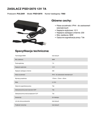 ZASILACZ PSD12070 12V/7A Główne cechy: Specyfikacja