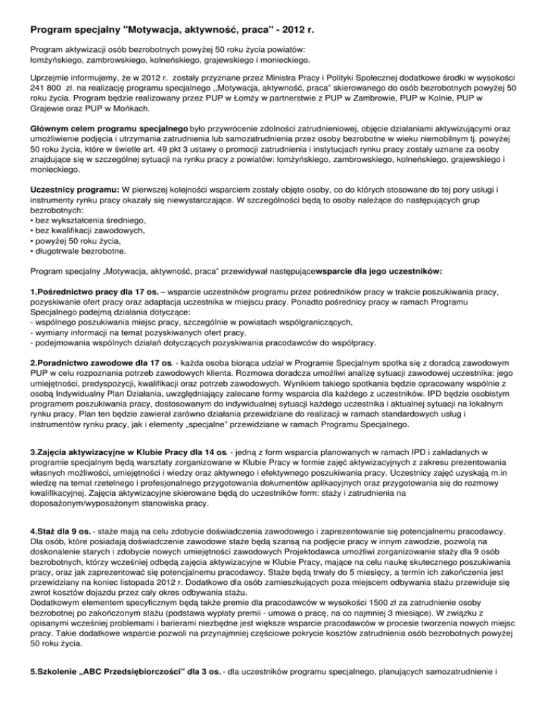 Program specjalny "Motywacja, aktywność, praca" - 2012 r. Program aktywizacji osób bezrobotnych powyżej 50 roku życia powiatów: łomżyńskiego, zambrowskiego, kolneńskiego, grajewskiego i monieckiego. Uprzejmie informujemy, że w 2012 r. zostały przyznane przez Ministra Pracy i Polityki Społecznej dodatkowe środki w wysokości 241 800 zł. na realizację programu specjalnego ,,Motywacja, aktywność, praca” skierowanego do osób bezrobotnych powyżej 50 roku życia. Program będzie realizowany przez PUP w Łomży w partnerstwie z PUP w Zambrowie, PUP w Kolnie, PUP w Grajewie oraz PUP w Mońkach. Głównym celem programu specjalnego było przywrócenie zdolności zatrudnieniowej, objęcie działaniami aktywizującymi oraz umożliwienie podjęcia i utrzymania zatrudnienia lub samozatrudnienia przez osoby bezrobotne w wieku niemobilnym tj. powyżej 50 roku życia, które w świetle art. 49 pkt 3 ustawy o promocji zatrudnienia i instytucjach rynku pracy zostały uznane za osoby znajdujące się w szczególnej sytuacji na rynku pracy z powiatów: łomżyńskiego, zambrowskiego, kolneńskiego, grajewskiego i monieckiego. Uczestnicy programu: W pierwszej kolejności wsparciem zostały objęte osoby, co do których stosowane do tej pory usługi i instrumenty rynku pracy okazały się niewystarczające. W szczególności będą to osoby należące do następujących grup bezrobotnych: • bez wykształcenia średniego, • bez kwalifikacji zawodowych, • powyżej 50 roku życia, • długotrwale bezrobotne. Program specjalny „Motywacja, aktywność, praca” przewidywał następujące wsparcie dla jego uczestników: 1.Pośrednictwo pracy dla 17 os. – wsparcie uczestników programu przez pośredników pracy w trakcie poszukiwania pracy, pozyskiwanie ofert pracy oraz adaptacja uczestnika w miejscu pracy. Ponadto pośrednicy pracy w ramach Programu Specjalnego podejmą działania dotyczące: - wspólnego poszukiwania miejsc pracy, szczególnie w powiatach współgraniczących, - wymiany informacji na temat pozyskiwanych ofert pracy, - podejmowania wspólnych działań dotyczących pozyskiwania pracodawców do współpracy. 2.Poradnictwo zawodowe dla 17 os. - każda osoba biorąca udział w Programie Specjalnym spotka się z doradcą zawodowym PUP w celu rozpoznania potrzeb zawodowych klienta. Rozmowa doradcza umożliwi analizę sytuacji zawodowej uczestnika: jego umiejętności, predyspozycji, kwalifikacji oraz potrzeb zawodowych. Wynikiem takiego spotkania będzie opracowany wspólnie z osobą Indywidualny Plan Działania, uwzględniający zalecane formy wsparcia dla każdego z uczestników. IPD będzie osobistym programem poszukiwania pracy, dostosowanym do indywidualnej sytuacji każdego uczestnika i aktualnej sytuacji na lokalnym rynku pracy. Plan ten będzie zawierał zarówno działania przewidziane do realizacji w ramach standardowych usług i instrumentów rynku pracy, jak i elementy „specjalne” przewidziane w ramach Programu Specjalnego. 3.Zajęcia aktywizacyjne w Klubie Pracy dla 14 os. - jedną z form wsparcia planowanych w ramach IPD i zakładanych w programie specjalnym będą warsztaty zorganizowane w Klubie Pracy w formie zajęć aktywizacyjnych z zakresu prezentowania własnych możliwości, umiejętności i wiedzy oraz aktywnego i efektywnego poszukiwania pracy. Uczestnicy zajęć uzyskają m.in wiedzę na temat rzetelnego i profesjonalnego przygotowania dokumentów aplikacyjnych oraz przygotowania się do rozmowy kwalifikacyjnej. Zajęcia aktywizacyjne skierowane będą do uczestników form: staży i zatrudnienia na doposażonym/wyposażonym stanowiska pracy. 4.Staż dla 9 os. - staże mają na celu zdobycie doświadczenia zawodowego i zaprezentowanie się potencjalnemu pracodawcy. Dla osób, które posiadają doświadczenie zawodowe staże będą szansą na podjęcie pracy w innym zawodzie, pozwolą na doskonalenie starych i zdobycie nowych umiejętności zawodowych Projektodawca umożliwi zorganizowanie staży dla 9 osób bezrobotnych, którzy wcześniej odbędą zajęcia aktywizacyjne w Klubie Pracy, mające na celu naukę skutecznego poszukiwania pracy, oraz jak zaprezentować się potencjalnemu pracodawcy. Staże będą trwały do 5 miesięcy, a termin ich zakończenia jest przewidziany na koniec listopada 2012 r. Dodatkowo dla osób zamieszkujących poza miejscem odbywania stażu przewiduje się zwrot kosztów dojazdu przez cały okres odbywania stażu. Dodatkowym elementem specyficznym będą także premie dla pracodawców w wysokości 1500 zł za zatrudnienie osoby bezrobotnej po zakończonym stażu (podstawa wypłaty premii - umowa o pracę, na co najmniej 3 miesiące). W związku z opisanymi wcześniej problemami i barierami niezbędne jest większe wsparcie pracodawców w procesie tworzenia nowych miejsc pracy. Takie dodatkowe wsparcie pozwoli na przynajmniej częściowe pokrycie kosztów zatrudnienia osób bezrobotnych powyżej 50 roku życia. 5.Szkolenie „ABC Przedsiębiorczości” dla 3 os. - dla uczestników programu specjalnego, planujących samozatrudnienie i ubiegających się o środki na uruchomienie własnej działalności gospodarczej, zostanie zorganizowane szkolenie: „ABC przedsiębiorczości”. Powyższe szkolenie pozwoli na uzyskanie wiedzy z zagadnień dotyczących prowadzenia działalności gospodarczej tj. rejestracja działalności, zarządzanie finansami w małej firmie, dokumentacja finansowa, obowiązki firmy wobec ZUS-u i US, BHP dla pracodawców, obsługa kas fiskalnych. Tego rodzaju wsparcie ma zwiększyć szanse nowopowstałej firmy na sukces. Usługę wykona zewnętrzna firma szkoleniowa. W okresie prowadzenia zajęć, dla osób spoza miejsca odbywania szkolenia, zapewnimy zwrot kosztów dojazdu. 6.Jednorazowe środki na podjęcie działalności gospodarczej dla 3 os. w wysokości 20 000 zł- środki na podjęcie działalności gospodarczej pozwolą osobom bezrobotnym na podjęcie samozatrudnienia, a tym samym stworz