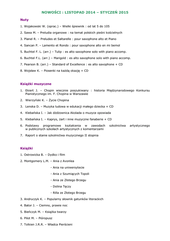 NOWOŚCI : LISTOPAD 2014 – STYCZEŃ 2015 Nuty 1. Wojakowski W. (oprac.) – Wielki śpiewnik : od lat 5 do 105 2. Sawa M. – Preludia organowe : na temat polskich pieśni kościelnych 3. Planel R. – Preludes et Saltarelle : pour saxophone alto et Piano 4. Sancan P. – Lamento et Rondo : pour saxophone alto en mi bemol 5. Buchtel F. L. (arr.) – Tulip : es alto saxophone solo with piano accomp. 6. Buchtel F.L. (arr.) – Marigold : es alto saxophone solo with piano accomp. 7. Pearson B. (arr.) – Standard of Excellence : es alto saxophone + CD 8. Wojsław K. – Piosenki na każdą okazję + CD Książki muzyczne 1. Ekiert J. – Chopin wiecznie poszukiwany : historia Międzynarodowego Konkursu Pianistycznego im. F. Chopina w Warszawie 2. Wierzyński K. – Życie Chopina 3. Lenska D. – Muzyka ludowa w edukacji małego dziecka + CD 4. Klebańska I. – Jak dżdżownica Akolada o muzyce opowiada 5. Klebańska I. – Kaprys, żart i inne muzyczne fanaberie + CD 6. Podstawy programowe kształcenia w zawodach w publicznych szkołach artystycznych z komentarzami 7. Raport o stanie szkolnictwa muzycznego II stopnia Książki 1. Ostrowicka B. – Dydko i film 2. Montgomery L.M. – Ania z Avonlea - Ania na uniwersytecie - Ania z Szumiących Topoli - Ania ze Złotego Brzegu - Dolina Tęczy - Rilla ze Złotego Brzegu 3. Andruczyk K. – Popularny słownik gatunków literackich 4. Bator J. – Ciemno, prawie noc 5. Bieńczyk M. – Książka twarzy 6. Pilot M. – Pióropusz 7. Tolkien J.R.R. – Władca Pierścieni szkolnictwa artystycznego