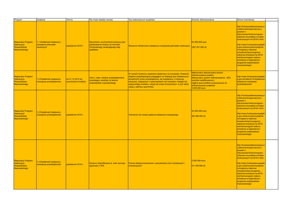 Program Działanie Termin Kto może składać wnioski Typ realizowanych projektów: Wartość dofinansowania Strona internetowa http://funduszedlamazowsza.e u/dokument/zapoznaj-sie-zprawem-idokumentami/harmonogramnaborow-na-projekty-w-trybiekonkursowym-na-2016-r.html Regionalny Program Operacyjny Województwa Mazowieckiego Regionalny Program Operacyjny Województwa Mazowieckiego 1.1 Działalność badawczo rozwojowa jednostek naukowych 1.2 Działalność badawczorozwojowa przedsiębiorstw październik 2016 r. od 31.12.2015 do wyczerpania środków Warunkiem uruchomienia konkursu jest zatwierdzenie aneksu do Kontrakt Terytorialnego zawierającego listę projektów. Wsparcie infrastruktury badawczo-rozwojowej jednostek naukowych mikro, małe i średnie przedsiębiorstwa posiadający siedzibę na terenie województwa mazowieckiego W ramach konkursu wspierane będą bony na innowacje. Wsparcie obejmie przedsięwzięcia polegające na realizacji prac badawczych określonych przez przedsiębiorcę, we współpracy z instytucją naukową, związanych z opracowaniem lub rozwojem nowego lub ulepszonego produktu, usługi lub zmian procesowych, w tym także usług z zakresu wzornictwa. 62 598 855 euro (267 291 000 zł) Maksymalny dopuszczalny poziom dofinansowania projektu Maksymalny poziom dofinansowania - 80% kosztów kwalifikowanych. Ogólna pula środków przeznaczona na dofinansowanie projektów 5 000 000 euro http://www.funduszeeuropejski e.gov.pl/strony/skorzystaj/har monogramy-naborowwnioskow/harmonogramynaborow-wnioskow-na-2016rok/harmonogram-naboruwnioskow-w-regionalnymprogramie-wojewodztwamazowieckiego/ http://www.funduszeeuropejski e.gov.pl/nabory/12-dzialalnoscbadawczo-rozwojowaprzedsiebiorstw/ http://funduszedlamazowsza.e u/dokument/zapoznaj-sie-zprawem-idokumentami/harmonogramnaborow-na-projekty-w-trybiekonkursowym-na-2016-r.html Regionalny Program Operacyjny Województwa Mazowieckiego 1.2 Działalność badawczo rozwojowa przedsiębiorstw 20 000 000 euro październik 2016 r Tworzenie lub rozwój zaplecza badawczo-rozwojowego (85 398 000 zł) http://www.funduszeeuropejski e.gov.pl/strony/skorzystaj/har monogramy-naborowwnioskow/harmonogramynaborow-wnioskow-na-2016rok/harmonogram-naboruwnioskow-w-regionalnymprogramie-wojewodztwamazowieckiego/ http://funduszedlamazowsza.e u/dokument/zapoznaj-sie-zprawem-idokumentami/harmonogramnaborow-na-projekty-w-trybiekonkursowym-na-2016-r.html Regionalny Program Operacyjny Województwa Mazowieckiego 1.2 Działalność badawczo rozwojowa przedsiębiorstw 5 000 000 euro październik 2016 r Konkurs nieprofilowany tj. brak wymogu zgodności z RIS Proces eksperymentowania i poszukiwania nisz rozwojowych i innowacyjnych (21 349 500 zł) http://www.funduszeeuropejski e.gov.pl/strony/skorzystaj/har monogramy-naborowwnioskow/harmonogramynaborow-wnioskow-na-2016rok/harmonogram-naboruwnioskow-w-regionalnymprogramie-wojewodztwamazowieckiego/ Regionalny Program Operacyjny Województwa Mazowieckiego Regionalny Program Operacyjny Województwa Mazowieckiego 2.1 E-usługi Poddziałanie 2.1.1 E-usługi dla Mazowsza 23 039 976 euro grudzień 2016 r. 2.1 E-usługi Poddziałanie 2.1.1 E-usługi dla Mazowsza od 30.06.2016 do 02.09.2016 Zintegrowany system informacji kulturalnej http://funduszedlamazowsza.e u/nabory-wnioskow/2-1-euslugi-poddzialania-2-1-1-typprojektow-wykorzystanie-tik-doobslugi-procesow-zwiazanychMaksymalny dopuszczalny poziom z-edukacja-na-uczelniachdofinansowania projektu lub maks. dopuszczalna Wsparciem zostaną objęte projekty polegające na wykorzystaniu TIK wyzszych.html uczelnie wyższe, w rozumieniu: uczelnie kwota dofinansowania projektu do obsługi procesów związanych z edukacją na uczelniach publiczne i niepubliczne, działające na Maksymalny poziom dofinansowania - 80 % wyższych, celem świadczenia usług drogą elektroniczną, aby http://www.funduszeeuropejski podstawie zapisów ustawy z dnia 27 lipca kosztów kwalifikowanych projektu. podnieść dostępność, jakość i efektywność kształcenia w regionie, e.gov.pl/strony/skorzystaj/har 2005 r. Prawo o szkolnictwie wyższym. Ogólna pula środków przeznaczona na jak np. rekrutacja przez Internet, czy e-learning. monogramy-naborowdofinansowanie projektów wnioskow/harmonogramy9 498 261,00 EUR (41 678 369,27 PLN naborow-wnioskow-na-2016rok/harmonogram-naboruwnioskow-w-regionalnymprogramie-wojewodztwamazowieckiego/ W ramach konkursu wspierane będą projekty dotyczące: organizacji terenów inwestycyjnych m. in. na obszarach powojskowych, poprzemysłowych, pokolejowych i popegeerowskich oraz ich kompleksowe zagospodarowanie obejmujące w szczególności: Regionalny Program Operacyjny Województwa Mazowieckiego 3.1 Poprawa rozwoju MŚP na Mazowszu Poddziałanie 3.1.1 Rozwój MŚP w ramach ZIT od 29.04.2016 do 18.07.2016 (98 378 000 zł) http://www.funduszeeuropejski e.gov.pl/strony/skorzystaj/har monogramy-naborowwnioskow/harmonogramynaborow-wnioskow-na-2016rok/harmonogram-naboruwnioskow-w-regionalnymprogramie-wojewodztwamazowieckiego/ jednostki samorządu terytorialnego, ich związki i stowarzyszenia z obszarów realizacji Zintegrowanych Inwestycji Terytorialnych Warszawskiego Obszaru Funkcjonalnego. http://funduszedlamazowsza.e u/nabory-wnioskow/3-1poprawa-rozwoju-msp-namazowszu-poddzialanie-3-1-1rozwoj-msp-w-ramach-zit-typMaksymalny dopuszczalny poziom prace studyjno-koncepcyjne – wyłącznie jako element projektu projektow-uporzadkowanie-idofinansowania projektu lub maks. dopuszczalna infrastrukturalnego; przygotowanie-terenowkwota dofinansowania projektu kompleksowe wyposażenie/doposażenie terenu inwestycyjnego w inwestycyjnych-w-celu-nadaniaMaksymalny poziom dofinansowania - 80 % media, tj.: budowa / modernizacja sieci zaopatrzenia w wodę, im-nowych-funkcjibudowa / modernizacja sieci kanalizacyjnej, budowa / modernizacja kosztów kwalifikowanych projektu. gospodarczych.html sieci gazowej, budowa / modernizacja sieci ciepłowniczej, budowa / Ogólna pula środków przeznacz