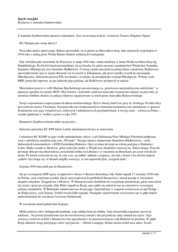 Język rosyjski Rozmowa z Antonim Zambrowskim Z Antonim Zambrowskim autorem wspomnień „Syn czerwonego księcia” rozmawia Tomasz Zbigniew Zapert RZ: Pamięta pan swoje adresy? Wszystkie oprócz pierwszego. Babcia opowiadała, że to gdzieś na Marszałkowskiej. Jako niemowlę wyjechałem w 1934 roku z matką przez Wolne Miasto Gdańsk statkiem do Leningradu. Gdy wróciłem jako nastolatek do Warszawy w maju 1945 roku, zamieszkaliśmy w domu Wedla na Puławskiej róg Madalińskiego. Po dwóch latach przenieśliśmy się na Szucha 16, gdzie naszymi sąsiadami byli Władysław Gomułka, Stanisław Mikołajczyk oraz Stanisław Radkiewicz. Ci dwaj ostatni mieszkali na jednej klatce schodowej. Radkiewicz opowiadał memu ojcu w mojej obecności na wczasach w Zakopanem, jak przez omyłkę wszedł do mieszkania Mikołajczyka. Sekretarka prezesa PSL krzyknęła z wrażenia, do przedpokoju wybiegł Mikołajczyk. Widząc szefa MBP, pomyślał zapewne, że już nadeszła jego godzina, ale Radkiewicz przeprosił za najście. Mieszkałem jeszcze w willi Mariana Spychalskiego aresztowanego za „prawicowo-nacjonalistyczne odchylenie”, w pięknym ogrodzie na terenie MON. Moi koledzy i koleżanki cenili ten teren jako wymarzone miejsce na prywatki, ja natomiast lubiłem chodzić na pokazy filmowe organizowane co dzień przez marszałka Rokossowskiego. Swoje wspomnienia rozpoczynam od adresu moskiewskiego. Był to sławny hotel Lux przy ul. Gorkiego 36 (dziś ulicy przywrócono nazwę Twerskiej). Stacjonowała tam międzynarodowa śmietanka komunistyczna zatrudniona w aparacie Kominternu oraz jego związkowych, rolniczych i młodzieżowych przybudówkach. Lwia jej część – zwłaszcza Polacy – została zgładzona w wielkie czystce w roku 1937. Romanowi Zambrowskiemu udało się przeżyć... Sekretarz generalny KC KPP Julian Leński zdymisjonował ojca ze stanowiska I sekretarza KC KZMP za jego wielki spektakularny sukces, czyli Deklarację Praw Młodego Pokolenia podpisaną wraz z młodzieżą socjalistyczną oraz „Wiciami”. Na jego miejsce mianowano Stanisława Radkiewicza – szefa białoruskich komsomolców z KZM Zachodniej Białorusi. Ojca wysłano do kraju na robotę partyjną w Radomiu i Łodzi. Matka została w Moskwie, gdzie kończyła studia w Wojskowej Akademii Lotniczej im. Żukowskiego. Przyszli pewnego dnia po nią enkawudyści, posiedziała krótko na Łubiance i w więzieniu na Butyrkach, po czym wróciła do domu. Po latach zwierzyła mi się, że cały czas „na dołku” płakała z rozpaczy, nie tyle z troski o los dwóch małych synków, lecz bojąc się, że Romek mógłby uwierzyć, iż ona naprawdę była „wrogiem ludu”. Jesienią 1939 roku trafił pan do Baranowicz. Już po rozwiązaniu KPP ojciec wylądował w obozie w Berezie Kartuskiej. Gdy Stalin napadł 17 września 1939 roku na Polskę, straż więzienna uciekła. Ojciec przywędrował do pobliskich Baranowicz i dostał posadę w sowieckim urzędzie miejskim. Ściągnął nas z Moskwy. W Baranowiczach chodziłem do rosyjskiego przedszkola, gdzie nauczyłem się czytać i pisać po rosyjsku. Gdy Hitler napadł na Rosję, ojcu udało się umieścić nas na ciężarówce wywożącej rodziny urzędników. W Bobrujska załadowano nas do pociągu. Zajechaliśmy w wagonie towarowym aż nad Wołgę – do Kujbyszewa, czyli Samary. Podróż trwała kilka tygodni. Następnie ciężarówkami wywieziono nas w głąb stepów nadwołżańskich do sowchozu Czerwony Październik. W sowchozie umarł pański brat Sergiusz. Matka podczas żniw obsługiwała kombajn, więc oddała brata do żłobka. Tam niemowlaka napojono surowym mlekiem... Na jesieni przeniesiono nas do sowchozowej centrali i tam już podczas zimy znalazł nas ojciec. Jego sowieccy szefowie uciekli z Baranowicz bez uprzedzenia i on maszerował przez całą Białoruś na piechotę. W głębi Rosji odnalazł swego partyjnego szefa i przyjaciela – Alfreda Lampego. Dzięki niemu ustalił nasz adres. Został strona 1 / 3 Język rosyjski Rozmowa z Antonim Zambrowskim nauczycielem w miejscowej szkole podstawowej, do której i ja trafiłem. Później ojca przeniesiono dalej w step – do innego sowchozu, gdzie został dyrektorem szkoły podstawowej, a matka – nauczycielką. Ojciec zgłosił się na ochotnika do I Dywizji im. Tadeusza Kościuszki w Sielcach. Na jesieni 1943 roku tacie udało się przenieść nas do Kujbyszewa. Matka została etatową przewodniczącą Zarządu Obwodowego Związku Patriotów Polskich. W lecie 1944 roku zostawiła mnie w pobliskim Stawropolu w polskim domu dziecka. Miałem tam być jedynie przez lato, ale wkrótce matka wyjechała do ojca do Lublina i dzięki temu ukończyłem IV oddział, tym razem polskiej szkoły. Było to moje pierwsze spotkanie z autentyczną Polską. Zarówno wychowankowie, jak i wychowawczynie pochodzili z Kresów, głównie z Wołynia. Zostali wywiezieni stamtąd podczas pierwszej akcji NKWD 10 lutego 1940 roku obejmującej polską inteligencję, urzędników i osadników wojskowych. Koledzy przyjęli mnie z rezerwą. Nic dziwnego. Byłem dzieckiem sowieckiego systemu wychowania, Polakiem uznającym wyższość wielkiego narodu rosyjskiego. Traktowano mnie jak ideowego przedstawiciela siły, która wywlokła ich z domów, pozbawiła życia bliskich, skazała na poniewierkę i głód. No i byłem ateistą. Na szczęście ten konflikt nie trwał długo. Już po kilku tygodniach mówiłem płynnie po polsku (z wołyńskim akcentem), na apelach z zapałem śpiewałem „Rotę”, a po wysłuchaniu wielu opowieści kolegów o bohaterstwie żołnierza polskiego w wojnie z bolszewikami oraz we wrześniu 1939 roku wgramoliłem się na dach szopy, aby na ścianie budynku napisać kredą hasło „Niech żyje Polska” oraz „Westerplatte trwa”. Nawróciłem się też na katolicyzm. Pierwszym pana idolem był Josip Broz-Tito. W 1946 roku widziałem go z bliska stojącego na trybunie w Al. Ujazdowskich w Warszawie. 