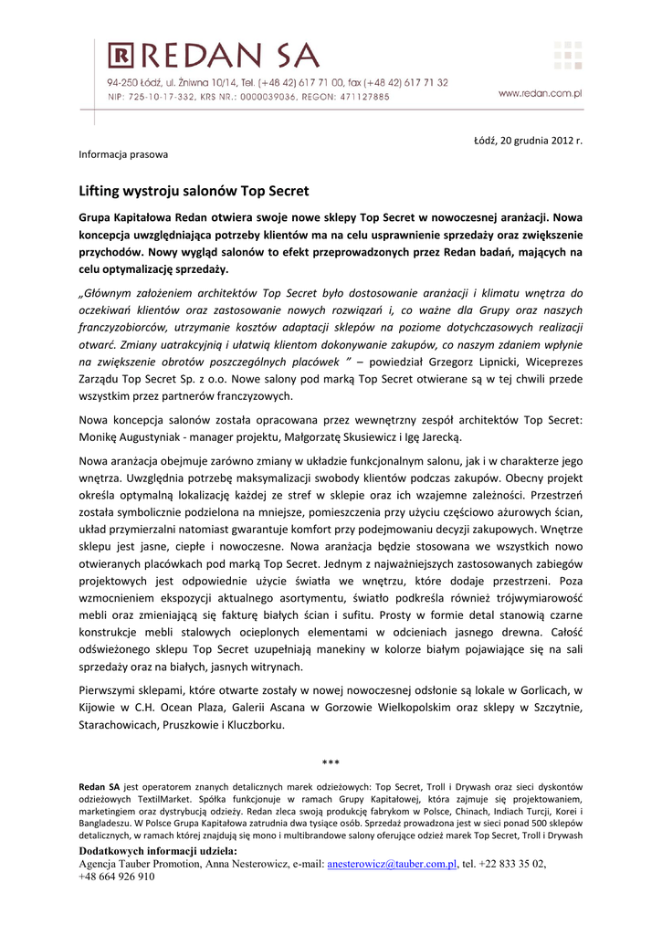 Łódź, 20 grudnia 2012 r. Informacja prasowa Lifting wystroju salonów Top Secret Grupa Kapitałowa Redan otwiera swoje nowe sklepy Top Secret w nowoczesnej aranżacji. Nowa koncepcja uwzględniająca potrzeby klientów ma na celu usprawnienie sprzedaży oraz zwiększenie przychodów. Nowy wygląd salonów to efekt przeprowadzonych przez Redan badań, mających na celu optymalizację sprzedaży. „Głównym założeniem architektów Top Secret było dostosowanie aranżacji i klimatu wnętrza do oczekiwań klientów oraz zastosowanie nowych rozwiązań i, co ważne dla Grupy oraz naszych franczyzobiorców, utrzymanie kosztów adaptacji sklepów na poziome dotychczasowych realizacji otwarć. Zmiany uatrakcyjnią i ułatwią klientom dokonywanie zakupów, co naszym zdaniem wpłynie na zwiększenie obrotów poszczególnych placówek ” – powiedział Grzegorz Lipnicki, Wiceprezes Zarządu Top Secret Sp. z o.o. Nowe salony pod marką Top Secret otwierane są w tej chwili przede wszystkim przez partnerów franczyzowych. Nowa koncepcja salonów została opracowana przez wewnętrzny zespół architektów Top Secret: Monikę Augustyniak - manager projektu, Małgorzatę Skusiewicz i Igę Jarecką. Nowa aranżacja obejmuje zarówno zmiany w układzie funkcjonalnym salonu, jak i w charakterze jego wnętrza. Uwzględnia potrzebę maksymalizacji swobody klientów podczas zakupów. Obecny projekt określa optymalną lokalizację każdej ze stref w sklepie oraz ich wzajemne zależności. Przestrzeń została symbolicznie podzielona na mniejsze, pomieszczenia przy użyciu częściowo ażurowych ścian, układ przymierzalni natomiast gwarantuje komfort przy podejmowaniu decyzji zakupowych. Wnętrze sklepu jest jasne, ciepłe i nowoczesne. Nowa aranżacja będzie stosowana we wszystkich nowo otwieranych placówkach pod marką Top Secret. Jednym z najważniejszych zastosowanych zabiegów projektowych jest odpowiednie użycie światła we wnętrzu, które dodaje przestrzeni. Poza wzmocnieniem ekspozycji aktualnego asortymentu, światło podkreśla również trójwymiarowość mebli oraz zmieniającą się fakturę białych ścian i sufitu. Prosty w formie detal stanowią czarne konstrukcje mebli stalowych ocieplonych elementami w odcieniach jasnego drewna. Całość odświeżonego sklepu Top Secret uzupełniają manekiny w kolorze białym pojawiające się na sali sprzedaży oraz na białych, jasnych witrynach. Pierwszymi sklepami, które otwarte zostały w nowej nowoczesnej odsłonie są lokale w Gorlicach, w Kijowie w C.H. Ocean Plaza, Galerii Ascana w Gorzowie Wielkopolskim oraz sklepy w Szczytnie, Starachowicach, Pruszkowie i Kluczborku. *** Redan SA jest operatorem znanych detalicznych marek odzieżowych: Top Secret, Troll i Drywash oraz sieci dyskontów odzieżowych TextilMarket. Spółka funkcjonuje w ramach Grupy Kapitałowej, która zajmuje się projektowaniem, marketingiem oraz dystrybucją odzieży. Redan zleca swoją produkcję fabrykom w Polsce, Chinach, Indiach Turcji, Korei i Bangladeszu. W Polsce Grupa Kapitałowa zatrudnia dwa tysiące osób. Sprzedaż prowadzona jest w sieci ponad 500 sklepów detalicznych, w ramach której znajdują się mono i multibrandowe salony oferujące odzież marek Top Secret, Troll i Drywash Dodatkowych informacji udziela: Agencja Tauber Promotion, Anna Nesterowicz, e-mail: [email protected], tel. +22 833 35 02, +48 664 926 910 oraz dyskontowe sklepy Textilmarket. Redan powstał w 1995 roku, a w 2003 roku akcje Spółki zostały dopuszczone do publicznego obrotu na Giełdzie Papierów Wartościowych w Warszawie. Spółka aktywnie wspiera Fundację Happy Kids. Dodatkowych informacji udziela: Agencja Tauber Promotion, Anna Nesterowicz, e-mail: [email protected], tel. +22 833 35 02, +48 664 926 910