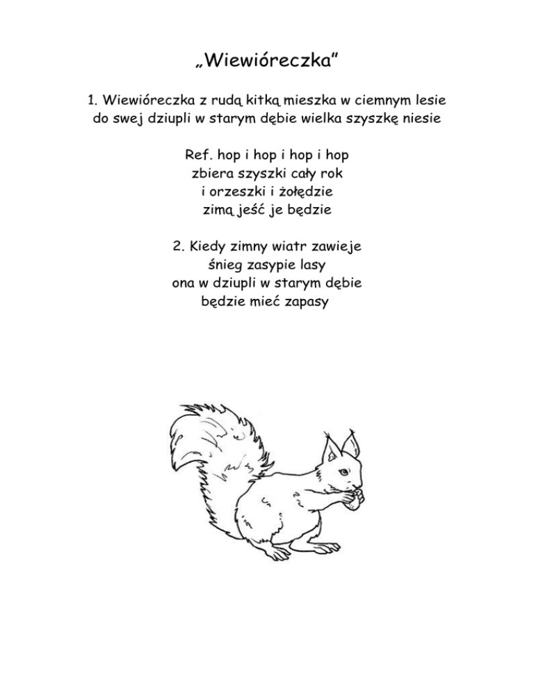 „Wiewióreczka” 1. Wiewióreczka z rudą kitką mieszka w ciemnym lesie do swej dziupli w starym dębie wielka szyszkę niesie Ref. hop i hop i hop i hop zbiera szyszki cały rok i orzeszki i żołędzie zimą jeść je będzie 2. Kiedy zimny wiatr zawieje śnieg zasypie lasy ona w dziupli w starym dębie będzie mieć zapasy