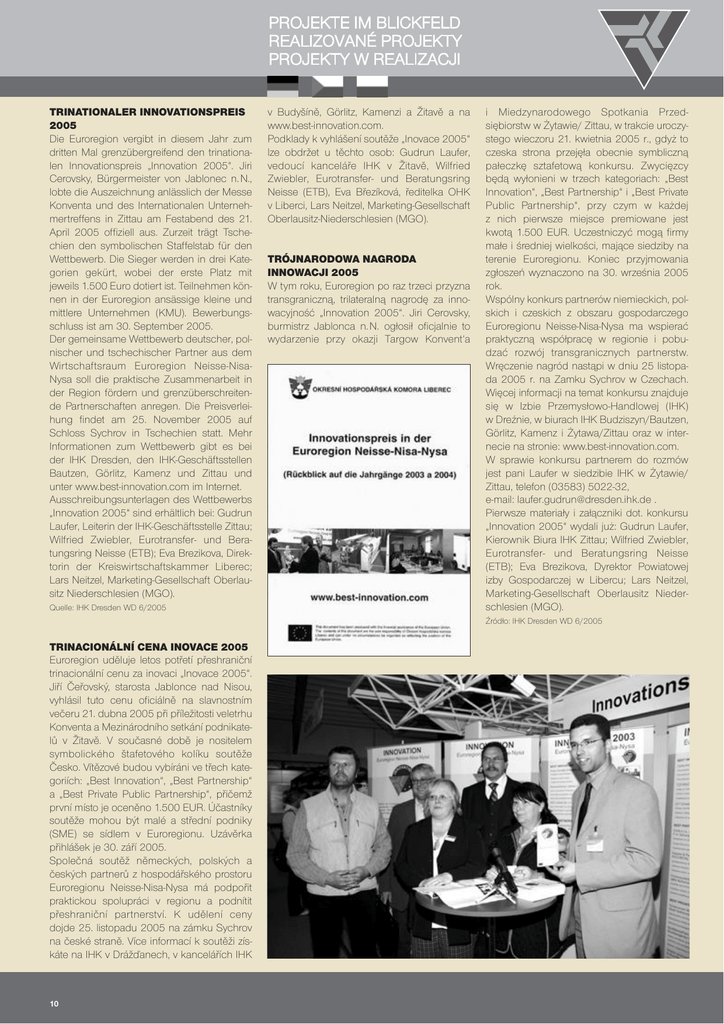 TRINATIONALER INNOVATIONSPREIS 2005 Die Euroregion vergibt in diesem Jahr zum dritten Mal grenzübergreifend den trinationalen Innovationspreis „Innovation 2005“. Jiri Cerovsky, Bürgermeister von Jablonec n. N., lobte die Auszeichnung anlässlich der Messe Konventa und des Internationalen Unternehmertreffens in Zittau am Festabend des 21. April 2005 offiziell aus. Zurzeit trägt Tschechien den symbolischen Staffelstab für den Wettbewerb. Die Sieger werden in drei Kategorien gekürt, wobei der erste Platz mit jeweils 1.500 Euro dotiert ist. Teilnehmen können in der Euroregion ansässige kleine und mittlere Unternehmen (KMU). Bewerbungsschluss ist am 30. September 2005. Der gemeinsame Wettbewerb deutscher, polnischer und tschechischer Partner aus dem Wirtschaftsraum Euroregion Neisse-NisaNysa soll die praktische Zusammenarbeit in der Region fördern und grenzüberschreitende Partnerschaften anregen. Die Preisverleihung findet am 25. November 2005 auf Schloss Sychrov in Tschechien statt. Mehr Informationen zum Wettbewerb gibt es bei der IHK Dresden, den IHK-Geschäftsstellen Bautzen, Görlitz, Kamenz und Zittau und unter www.best-innovation.com im Internet. Ausschreibungsunterlagen des Wettbewerbs „Innovation 2005“ sind erhältlich bei: Gudrun Laufer, Leiterin der IHK-Geschäftsstelle Zittau; Wilfried Zwiebler, Eurotransfer- und Beratungsring Neisse (ETB); Eva Brezikova, Direktorin der Kreiswirtschaftskammer Liberec; Lars Neitzel, Marketing-Gesellschaft Oberlausitz Niederschlesien (MGO). Quelle: IHK Dresden WD 6/2005 v Budyšíně, Görlitz, Kamenzi a Žitavě a na www.best-innovation.com. Podklady k vyhlášení soutěže „Inovace 2005“ lze obdržet u těchto osob: Gudrun Laufer, vedoucí kanceláře IHK v Žitavě, Wilfried Zwiebler, Eurotransfer- und Beratungsring Neisse (ETB), Eva Březíková, ředitelka OHK v Liberci, Lars Neitzel, Marketing-Gesellschaft Oberlausitz-Niederschlesien (MGO). TRÓJNARODOWA NAGRODA INNOWACJI 2005 W tym roku, Euroregion po raz trzeci przyzna transgraniczną, trilateralną nagrodę za innowacyjność „Innovation 2005“. Jiri Cerovsky, burmistrz Jablonca n. N. ogłosił oficjalnie to wydarzenie przy okazji Targow Konvent‘a i Miedzynarodowego Spotkania Przedsiębiorstw w Żytawie/ Zittau, w trakcie uroczystego wieczoru 21. kwietnia 2005 r., gdyż to czeska strona przejęła obecnie symbliczną pałeczkę sztafetową konkursu. Zwycięzcy będą wyłonieni w trzech kategoriach: „Best Innovation“, „Best Partnership“ i „Best Private Public Partnership“, przy czym w każdej z nich pierwsze miejsce premiowane jest kwotą 1.500 EUR. Uczestniczyć mogą firmy małe i średniej wielkości, mające siedziby na terenie Euroregionu. Koniec przyjmowania zgłoszeń wyznaczono na 30. września 2005 rok. Wspólny konkurs partnerów niemieckich, polskich i czeskich z obszaru gospodarczego Euroregionu Neisse-Nisa-Nysa ma wspierać praktyczną współpracę w regionie i pobudzać rozwój transgranicznych partnerstw. Wręczenie nagród nastąpi w dniu 25 listopada 2005 r. na Zamku Sychrov w Czechach. Więcej informacji na temat konkursu znajduje się w Izbie Przemysłowo-Handlowej (IHK) w Dreźnie, w biurach IHK Budziszyn/Bautzen, Görlitz, Kamenz i Żytawa/Zittau oraz w internecie na stronie: www.best-innovation.com. W sprawie konkursu partnerem do rozmów jest pani Laufer w siedzibie IHK w Żytawie/ Zittau, telefon (03583) 5022-32, e-mail: [email protected] . Pierwsze materiały i załączniki dot. konkursu „Innovation 2005“ wydali już: Gudrun Laufer, Kierownik Biura IHK Zittau; Wilfried Zwiebler, Eurotransfer- und Beratungsring Neisse (ETB); Eva Brezikova, Dyrektor Powiatowej izby Gospodarczej w Libercu; Lars Neitzel, Marketing-Gesellschaft Oberlausitz Niederschlesien (MGO). Źródło: IHK Dresden WD 6/2005 TRINACIONÁLNÍ CENA INOVACE 2005 Euroregion uděluje letos potřetí přeshraniční trinacionální cenu za inovaci „Inovace 2005“. Jiří Čeřovský, starosta Jablonce nad Nisou, vyhlásil tuto cenu oficiálně na slavnostním večeru 21. dubna 2005 při příležitosti veletrhu Konventa a Mezinárodního setkání podnikatelů v Žitavě. V současné době je nositelem symbolického štafetového kolíku soutěže Česko. Vítězové budou vybíráni ve třech kategoriích: „Best Innovation“, „Best Partnership“ a „Best Private Public Partnership“, přičemž první místo je oceněno 1.500 EUR. Účastníky soutěže mohou být malé a střední podniky (SME) se sídlem v Euroregionu. Uzávěrka přihlášek je 30. září 2005. Společná soutěž německých, polských a českých partnerů z hospodářského prostoru Euroregionu Neisse-Nisa-Nysa má podpořit praktickou spolupráci v regionu a podnítit přeshraniční partnerství. K udělení ceny dojde 25. listopadu 2005 na zámku Sychrov na české straně. Více informací k soutěži získáte na IHK v Drážďanech, v kancelářích IHK 10