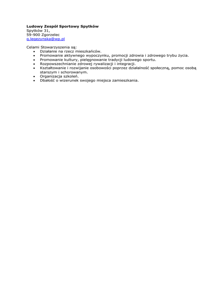 Ludowy Zespół Sportowy Spytków Spytków 31, 59-900 Zgorzelec [email protected] Celami Stowarzyszenia są: Działanie na rzecz mieszkańców. Promowanie aktywnego wypoczynku, promocji zdrowia i zdrowego trybu życia. Promowanie kultury, pielęgnowanie tradycji ludowego sportu. Rozpowszechnianie zdrowej rywalizacji i integracji. Kształtowanie i rozwijanie osobowości poprzez działalność społeczną, pomoc osobą starszym i schorowanym. Organizacja szkoleń. Dbałość o wizerunek swojego miejsca zamieszkania.