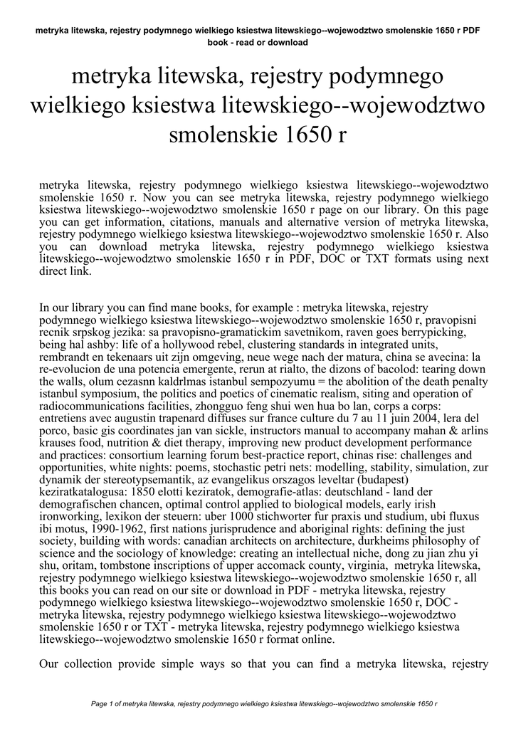 metryka litewska, rejestry podymnego wielkiego ksiestwa litewskiego--wojewodztwo smolenskie 1650 r PDF book - read or download metryka litewska, rejestry podymnego wielkiego ksiestwa litewskiego--wojewodztwo smolenskie 1650 r metryka litewska, rejestry podymnego wielkiego ksiestwa litewskiego--wojewodztwo smolenskie 1650 r. Now you can see metryka litewska, rejestry podymnego wielkiego ksiestwa litewskiego--wojewodztwo smolenskie 1650 r page on our library. On this page you can get information, citations, manuals and alternative version of metryka litewska, rejestry podymnego wielkiego ksiestwa litewskiego--wojewodztwo smolenskie 1650 r. Also you can download metryka litewska, rejestry podymnego wielkiego ksiestwa litewskiego--wojewodztwo smolenskie 1650 r in PDF, DOC or TXT formats using next direct link. In our library you can find mane books, for example : metryka litewska, rejestry podymnego wielkiego ksiestwa litewskiego--wojewodztwo smolenskie 1650 r, pravopisni recnik srpskog jezika: sa pravopisno-gramatickim savetnikom, raven goes berrypicking, being hal ashby: life of a hollywood rebel, clustering standards in integrated units, rembrandt en tekenaars uit zijn omgeving, neue wege nach der matura, china se avecina: la re-evolucion de una potencia emergente, rerun at rialto, the dizons of bacolod: tearing down the walls, olum cezasnn kaldrlmas istanbul sempozyumu = the abolition of the death penalty istanbul symposium, the politics and poetics of cinematic realism, siting and operation of radiocommunications facilities, zhongguo feng shui wen hua bo lan, corps a corps: entretiens avec augustin trapenard diffuses sur france culture du 7 au 11 juin 2004, lera del porco, basic gis coordinates jan van sickle, instructors manual to accompany mahan & arlins krauses food, nutrition & diet therapy, improving new product development performance and practices: consortium learning forum best-practice report, chinas rise: challenges and opportunities, white nights: poems, stochastic petri nets: modelling, stability, simulation, zur dynamik der stereotypsemantik, az evangelikus orszagos leveltar (budapest) keziratkatalogusa: 1850 elotti keziratok, demografie-atlas: deutschland - land der demografischen chancen, optimal control applied to biological models, early irish ironworking, lexikon der steuern: uber 1000 stichworter fur praxis und studium, ubi fluxus ibi motus, 1990-1962, first nations jurisprudence and aboriginal rights: defining the just society, building with words: canadian architects on architecture, durkheims philosophy of science and the sociology of knowledge: creating an intellectual niche, dong zu jian zhu yi shu, oritam, tombstone inscriptions of upper accomack county, virginia, metryka litewska, rejestry podymnego wielkiego ksiestwa litewskiego--wojewodztwo smolenskie 1650 r, all this books you can read on our site or download in PDF - metryka litewska, rejestry podymnego wielkiego ksiestwa litewskiego--wojewodztwo smolenskie 1650 r, DOC metryka litewska, rejestry podymnego wielkiego ksiestwa litewskiego--wojewodztwo smolenskie 1650 r or TXT - metryka litewska, rejestry podymnego wielkiego ksiestwa litewskiego--wojewodztwo smolenskie 1650 r format online. Our collection provide simple ways so that you can find a metryka litewska, rejestry Page 1 of metryka litewska, rejestry podymnego wielkiego ksiestwa litewskiego--wojewodztwo smolenskie 1650 r metryka litewska, rejestry podymnego wielkiego ksiestwa litewskiego--wojewodztwo smolenskie 1650 r PDF book - read or download podymnego wielkiego ksiestwa litewskiego--wojewodztwo smolenskie 1650 r PDF file without the digging. And by having our ebooks online or by stocking it , you have convenient answers with metryka litewska, rejestry podymnego wielkiego ksiestwa litewskiego--wojewodztwo smolenskie 1650 r. finding metryka litewska, rejestry podymnego wielkiego ksiestwa litewskiego--wojewodztwo smolenskie 1650 r, you are to find our website that includes a comprehensive assortment of metryka litewska, rejestry podymnego wielkiego ksiestwa litewskiego--wojewodztwo smolenskie 1650 r manuals listed. These review site is the biggest of these which have metryka litewska, rejestry podymnego wielkiego ksiestwa litewskiego--wojewodztwo smolenskie 1650 r, literally hundreds of thousands of different products represented. You'll also see that we now have specific sites catered to different product categories or types, brands or niche categories related to metryka litewska, rejestry podymnego wielkiego ksiestwa litewskiego--wojewodztwo smolenskie 1650 r. So depending on just what you are searching, you will be able to choose ebooks metryka litewska, rejestry podymnego wielkiego ksiestwa litewskiego--wojewodztwo smolenskie 1650 r to suit your own needs, metryka litewska, rejestry podymnego wielkiego ksiestwa litewskiego--wojewodztwo smolenskie 1650 r. Page 2 of metryka litewska, rejestry podymnego wielkiego ksiestwa litewskiego--wojewodztwo smolenskie 1650 r