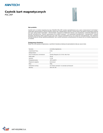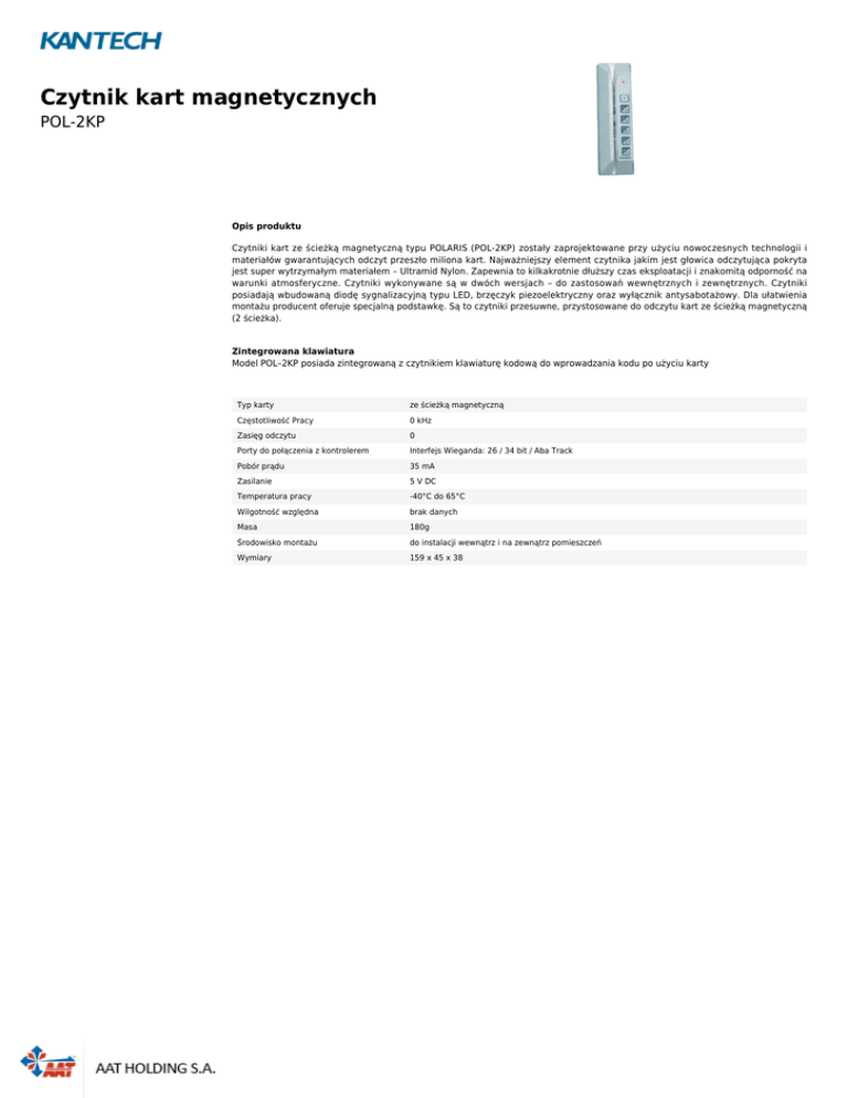 Czytnik kart magnetycznych POL-2KP Opis produktu Czytniki kart ze ścieżką magnetyczną typu POLARIS (POL-2KP) zostały zaprojektowane przy użyciu nowoczesnych technologii i materiałów gwarantujących odczyt przeszło miliona kart. Najważniejszy element czytnika jakim jest głowica odczytująca pokryta jest super wytrzymałym materiałem – Ultramid Nylon. Zapewnia to kilkakrotnie dłuższy czas eksploatacji i znakomitą odporność na warunki atmosferyczne. Czytniki wykonywane są w dwóch wersjach – do zastosowań wewnętrznych i zewnętrznych. Czytniki posiadają wbudowaną diodę sygnalizacyjną typu LED, brzęczyk piezoelektryczny oraz wyłącznik antysabotażowy. Dla ułatwienia montażu producent oferuje specjalną podstawkę. Są to czytniki przesuwne, przystosowane do odczytu kart ze ścieżką magnetyczną (2 ścieżka). Zintegrowana klawiatura Model POL–2KP posiada zintegrowaną z czytnikiem klawiaturę kodową do wprowadzania kodu po użyciu karty Typ karty ze ścieżką magnetyczną Częstotliwość Pracy 0 kHz Zasięg odczytu 0 Porty do połączenia z kontrolerem Interfejs Wieganda: 26 / 34 bit / Aba Track Pobór prądu 35 mA Zasilanie 5 V DC Temperatura pracy -40°C do 65°C Wilgotność względna brak danych Masa 180g Środowisko montażu do instalacji wewnątrz i na zewnątrz pomieszczeń Wymiary 159 x 45 x 38
