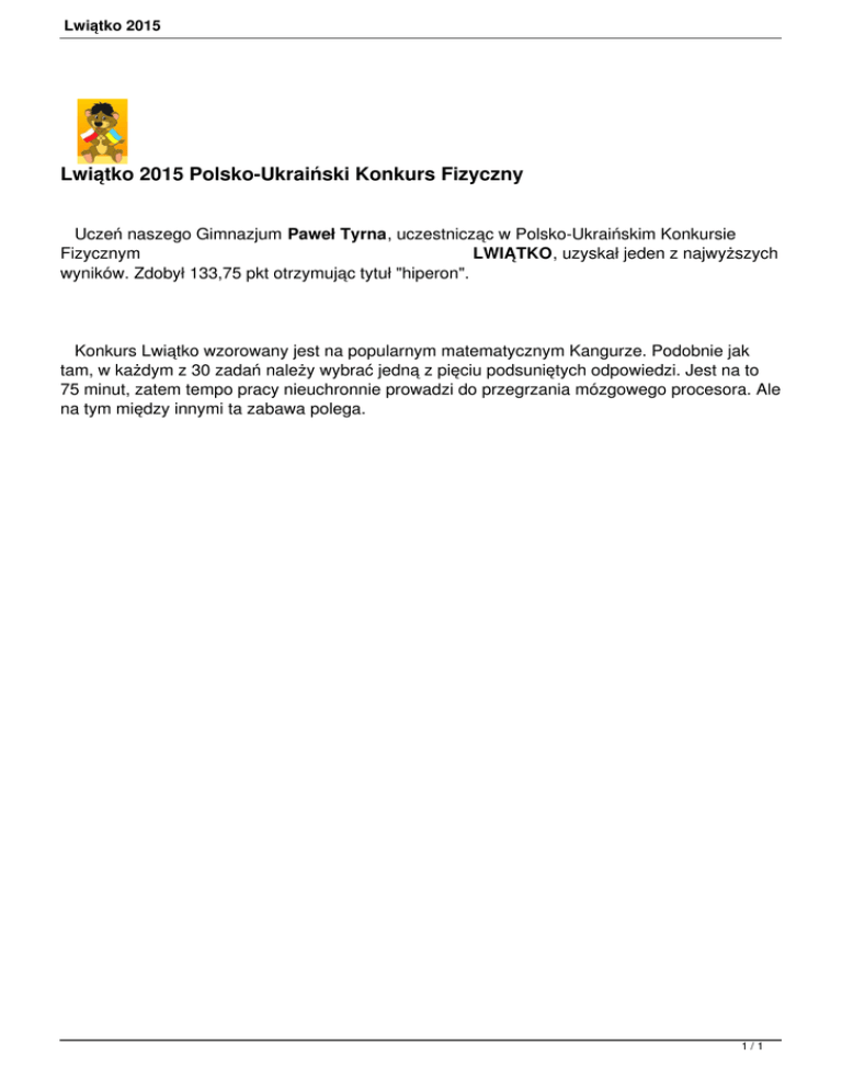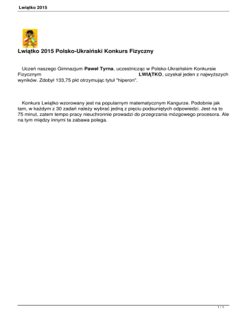 Lwiątko 2015 Lwiątko 2015 Polsko-Ukraiński Konkurs Fizyczny Uczeń naszego Gimnazjum Paweł Tyrna, uczestnicząc w Polsko-Ukraińskim Konkursie Fizycznym LWIĄTKO, uzyskał jeden z najwyższych wyników. Zdobył 133,75 pkt otrzymując tytuł "hiperon". Konkurs Lwiątko wzorowany jest na popularnym matematycznym Kangurze. Podobnie jak tam, w każdym z 30 zadań należy wybrać jedną z pięciu podsuniętych odpowiedzi. Jest na to 75 minut, zatem tempo pracy nieuchronnie prowadzi do przegrzania mózgowego procesora. Ale na tym między innymi ta zabawa polega. 1/1