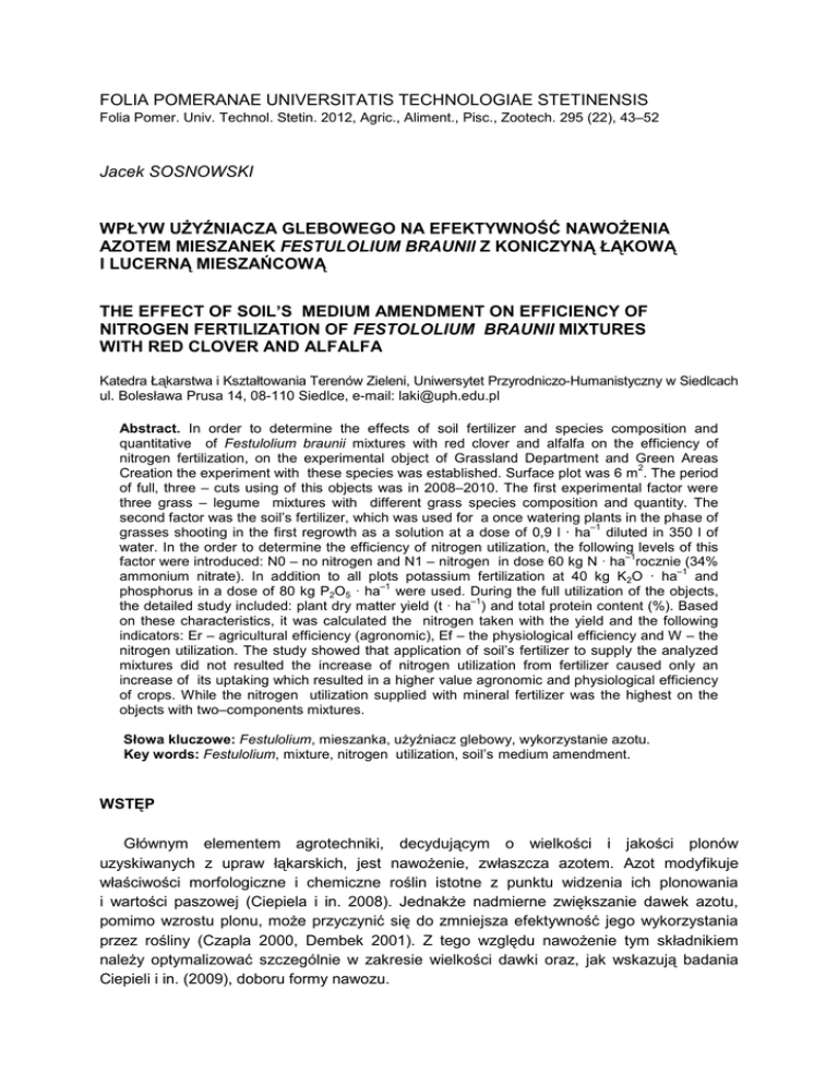 FOLIA POMERANAE UNIVERSITATIS TECHNOLOGIAE STETINENSIS Folia Pomer. Univ. Technol. Stetin. 2012, Agric., Aliment., Pisc., Zootech. 295 (22), 43–52 Jacek SOSNOWSKI WPŁYW UśYŹNIACZA GLEBOWEGO NA EFEKTYWNOŚĆ NAWOśENIA AZOTEM MIESZANEK FESTULOLIUM BRAUNII Z KONICZYNĄ ŁĄKOWĄ I LUCERNĄ MIESZAŃCOWĄ THE EFFECT OF SOIL’S MEDIUM AMENDMENT ON EFFICIENCY OF NITROGEN FERTILIZATION OF FESTOLOLIUM BRAUNII MIXTURES WITH RED CLOVER AND ALFALFA Katedra Łąkarstwa i Kształtowania Terenów Zieleni, Uniwersytet Przyrodniczo-Humanistyczny w Siedlcach ul. Bolesława Prusa 14, 08-110 Siedlce, e-mail: [email protected] Abstract. In order to determine the effects of soil fertilizer and species composition and quantitative of Festulolium braunii mixtures with red clover and alfalfa on the efficiency of nitrogen fertilization, on the experimental object of Grassland Department and Green Areas 2 Creation the experiment with these species was established. Surface plot was 6 m . The period of full, three – cuts using of this objects was in 2008–2010. The first experimental factor were three grass – legume mixtures with different grass species composition and quantity. The second factor was the soil’s fertilizer, which was used for a once watering plants in the phase of –1 grasses shooting in the first regrowth as a solution at a dose of 0,9 l · ha diluted in 350 l of water. In the order to determine the efficiency of nitrogen utilization, the following levels of this –1 factor were introduced: N0 – no nitrogen and N1 – nitrogen in dose 60 kg N · ha rocznie (34% –1 ammonium nitrate). In addition to all plots potassium fertilization at 40 kg K2O · ha and –1 phosphorus in a dose of 80 kg P2O5 · ha were used. During the full utilization of the objects, –1 the detailed study included: plant dry matter yield (t · ha ) and total protein content (%). Based on these characteristics, it was calculated the nitrogen taken with the yield and the following indicators: Er – agricultural efficiency (agronomic), Ef – the physiological efficiency and W – the nitrogen utilization. The study showed that application of soil’s fertilizer to supply the analyzed mixtures did not resulted the increase of nitrogen utilization from fertilizer caused only an increase of its uptaking which resulted in a higher value agronomic and physiological efficiency of crops. While the nitrogen utilization supplied with mineral fertilizer was the highest on the objects with two–components mixtures. Słowa kluczowe: Festulolium, mieszanka, uŜyźniacz glebowy, wykorzystanie azotu. Key words: Festulolium, mixture, nitrogen utilization, soil’s medium amendment. WSTĘP Głównym elementem agrotechniki, decydującym o wielkości i jakości plonów uzyskiwanych z upraw łąkarskich, jest nawoŜenie, zwłaszcza azotem. Azot modyfikuje właściwości morfologiczne i chemiczne roślin istotne z punktu widzenia ich plonowania i wartości paszowej (Ciepiela i in. 2008). JednakŜe nadmierne zwiększanie dawek azotu, pomimo wzrostu plonu, moŜe przyczynić się do zmniejsza efektywność jego wykorzystania przez rośliny (Czapla 2000, Dembek 2001). Z tego względu nawoŜenie tym składnikiem naleŜy optymalizować szczególnie w zakresie wielkości dawki oraz, jak wskazują badania Ciepieli i in. (2009), doboru formy nawozu. 44 J. Sosonowski Ocena skuteczności nawoŜenia roślin, zwłaszcza azotem, powinna być wyraŜana nie tylko zmianami ilościowymi i jakościowymi plonu, ale takŜe za pomocą mierników empirycznych. Zdaniem wielu autorów (Korona i in. 1994, Fotyma 1997, Kruczek i Szulc 2000, Małecka i Blecharczyk 2005), w ocenie takiej moŜna wykorzystać efektywność agronomiczną, która określa przyrost plonu na jednostkę azotu, zastosowanego w nawozach, i efektywność fizjologiczną, odnoszącą się do zdolności roślin do przetwarzania azotu pobranego z gleby i nawozów na plon uŜytkowy. W ostatnim czasie w literaturze prezentowano badania dotyczące zasilania gleby preparatami opartymi na mikroorganizmach (Sulewska i in. 2009, Klama i in. 2010, Sosnowski i Jankowski 2010, Wojtala-Łozowska i Parylak 2010), które jak podaje Sulewska i in. (2009), korzystnie wpływają na jej Ŝyzność oraz zdrowotność i plonowanie roślin. Ponadto jak wykazały badania Sosnowskiego i Jankowskiego (2010), uŜyźnianie mikrobiologiczne przyczyniło się do wzrostu produkcyjności mieszanek Festulolium braunii z lucerną mieszańcową i koniczyną łąkową. Celem pracy było określenie wpływu uŜyźniacza glebowego oraz składu gatunkowego i ilościowego mieszanek Festulolium braunii z koniczyną łąkową i lucerną mieszańcową na efektywność nawoŜenia azotem. MATERIAŁ I METODY Doświadczenie z uprawą Festulolium w mieszankach z koniczyną łąkową i lucerną mieszańcową, załoŜono w kwietniu 2007 roku w układzie losowanych bloków w trzech powtórzeniach na obiekcie doświadczalnym Katedry Łąkarstwa i Kształtowania Terenów Zieleni UP-H w Siedlcach (współrzędne geograficzne: 52.169°N, 22.280°E). Gleba pod doświadczenie naleŜała do rzędu kulturoziemnych, typu hortisole, wytworzonych z piasku słabo gliniastego (tab. 1). Tabela 1. Skład granulometryczny gleby. Procentowy udział frakcji ziemistych (średnica w mm) Table 1. Grain composition of soil. Percentage share of earth fractions (diameter in mm) Suma frakcji Suma frakcji Sum of fraction Sum of fraction 1–0,1 0,1–0,05 0,05–0,02 0,02–0,06 0,06–0,002 <0,002 0,1–0,02 <0,02 76 9 5 4 4 2 14 10 Grupa granulometryczna Grain group psg Analizę chemiczną gleby wykonano w Okręgowej Stacji Chemicznej w Wesołej. Gleba odznaczała się odczynem obojętnym (tab. 2), średnio wysokim poziomem próchnicy, bardzo wysoką zawartością fosforu, wysoką magnezu oraz średnią przyswajalnych form potasu, azotu ogólnego, azotanowego i amonowego. Tabela 2. Skład chemiczny gleby Table 2. Chemical composition of soil pH Zawartość sk