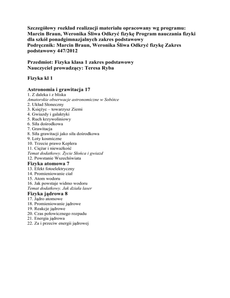 Szczegółowy rozkład realizacji materiału opracowany wg programu: Marcin Braun, Weronika Śliwa Odkryć fizykę Program nauczania fizyki dla szkół ponadgimnazjalnych zakres podstawowy Podręcznik: Marcin Braun, Weronika Śliwa Odkryć fizykę Zakres podstawowy 447/2012 Przedmiot: Fizyka klasa 1 zakres podstawowy Nauczyciel prowadzący: Teresa Ryba Fizyka kl 1 Astronomia i grawitacja 17 1. Z daleka i z bliska Amatorskie obserwacje astronomiczne w Sobótce 2. Układ Słoneczny 3. Księżyc – towarzysz Ziemi 4. Gwiazdy i galaktyki 5. Ruch krzywoliniowy 6. Siła dośrodkowa 7. Grawitacja 8. Siła grawitacji jako siła dośrodkowa 9. Loty kosmiczne 10. Trzecie prawo Keplera 11. Ciężar i nieważkość Temat dodatkowy. Życie Słońca i gwiazd 12. Powstanie Wszechświata Fizyka atomowa 7 13. Efekt fotoelektryczny 14. Promieniowanie ciał 15. Atom wodoru 16. Jak powstaje widmo wodoru Temat dodatkowy. Jak działa laser Fizyka jądrowa 8 17. Jądro atomowe 18. Promieniowanie jądrowe 19. Reakcje jądrowe 20. Czas połowicznego rozpadu 21. Energia jądrowa 22. Za i przeciw energii jądrowej Klasa ef Lp 1 Data 4.09.2012 Realizowany temat Lekcja organizacyjna. Zapoznanie z zasadami oceniania. BHP pracowni. 2 3 4 5 6 7 8 9 10 11 12 13 14 15 16 11.09.2012 18.09.2012 25.09.2012 2.10.2012 9.10.2012 16.10.2012 23.10.2012 30.10.2012 6.11.2012 13.11.2012 20.11.2012 27.11.2012 4.12.2012 11.12.2012 18.12.2012 25.12.2012 1.01.2013 8.01.2013 15.01.2013 22.01.2013 29.01.2013 5.02.2013 12.02.2013 19.02.2013 26.02.2013 5.03.2013 12.03.2013 19.03.2013 26.03.2013 2.04.2013 9.04.2013 16.04.2013 23.04.2013 30.04.2013 7.05.2013 14.05.2013 21.05.2013 28.05.2013 4.06.2013 11.06.2013 18.06.2013 25.06.2013 Z daleka i z bliska Amatorskie obserwacje astronomiczne w Sobótce Układ Słoneczny Księżyc – towarzysz Ziemi Gwiazdy i galaktyki Ruch krzywoliniowy Siła dośrodkowa Grawitacja Siła grawitacji jako siła dośrodkowa Loty kosmiczne Trzecie prawo Keplera Ciężar i nieważkość Życie Słońca i gwiazd Powstanie Wszechświata 17 18 19 20 21 22 23 24 25 26 27 28 29 30 31 32 33 34 35 36 37 38 Powtórzenie wiadomości Święto Bożego Narodzenia Nowy Rok Praca klasowa Efekt fotoelektryczny Promieniowanie ciał Ferie Zimowe Ferie Zimowe Atom wodoru Jak powstaje widmo wodoru Jak działa laser Powtórzenie wiadomości Praca klasowa Jądro atomowe Promieniowanie jądrowe Ferie wiosenne Wielcy odkrywcy – Maria Curie. Reakcje jądrowe Czas połowicznego rozpadu Energia jądrowa Za i przeciw energii jądrowej Powtórzenie wiadomości Praca klasowa Godziny do dyspozycji nauczyciela Godziny do dyspozycji nauczyciela Godziny do dyspozycji nauczyciela Godziny do dyspozycji nauczyciela Godziny do dyspozycji nauczyciela Klasa 1kt Lp 1 Data 5.09.2012 Realizowany temat Lekcja organizacyjna. Zapoznanie z zasadami oceniania. BHP pracowni. 2 3 4 5 6 7 8 9 10 11 12 13 14 15 16 12.09.2012 19.09.2012 26.09.2012 3.10.2012 10.10.2012 17.10.2012 24.10.2012 31.10.2012 7.11.2012 14.11.2012 21.11.2012 28.11.2012 5.12.2012 12.12.2012 19.12.2012 26.12.2012 2.01.2013 9.01.2013 16.01.2013 23.01.2013 30.01.2013 6.02.2013 13.02.2013 20.02.2013 27.02.2013 6.03.2013 13.03.2013 20.03.2013 27.03.2013 3.04.2013 10.04.2013 17.04.2013 24.04.2013 1.05.2013 8.05.2013 15.05.2013 22.05.2013 29.05.2013 5.06.2013 12.06.2013 19.06.2013 26.06.2013 Z daleka i z bliska Amatorskie obserwacje astronomiczne w Sobótce Układ Słoneczny Księżyc – towarzysz Ziemi Gwiazdy i galaktyki Ruch krzywoliniowy Siła dośrodkowa Grawitacja Siła grawitacji jako siła dośrodkowa Loty kosmiczne Trzecie prawo Keplera Ciężar i nieważkość Życie Słońca i gwiazd Powstanie Wszechświata 17 18 19 20 21 22 23 24 25 26 27 28 29 30 31 32 33 34 35 36 37 38 Powtórzenie wiadomości Święto Bożego Narodzenia Praca klasowa Efekt fotoelektryczny Promieniowanie ciał Atom wodoru Ferie Zimowe Ferie Zimowe Jak powstaje widmo wodoru Jak działa laser Powtórzenie wiadomości Praca klasowa Jądro atomowe Promieniowanie jądrowe Ferie wiosenne Wielcy odkrywcy – Maria Curie. Reakcje jądrowe Czas połowicznego rozpadu Energia jądrowa Święto pracy Za i przeciw energii jądrowej Powtórzenie wiadomości Praca klasowa Godziny do dyspozycji nauczyciela Godziny do dyspozycji nauczyciela Godziny do dyspozycji nauczyciela Godziny do dyspozycji nauczyciela Godziny do dyspozycji nauczyciela