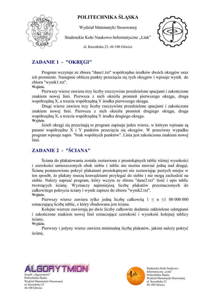 POLITECHNIKA ŚLĄSKA Wydział Matematyki Stosowanej Studenckie Koło Naukowo-Informatyczne „Link” ul. Kaszubska 23, 44-100 Gliwice ZADANIE 1 - "OKRĘGI" Program wczytuje ze zbioru "dane1.txt" współrzędne środków dwóch okręgów oraz ich promienie. Następnie oblicza punkty przecięcia się tych okręgów i wpisuje wynik do zbioru "wynik1.txt". Wejście. Pierwszy wiersz zawiera trzy liczby rzeczywiste przedzielone spacjami i zakończone znakiem nowej linii. Pierwsza z nich określa promień pierwszego okręgu, druga współrzędną X, a trzecia współrzędną Y środka pierwszego okręgu. Drugi wiersz zawiera trzy liczby rzeczywiste przedzielone spacjami i zakończone znakiem nowej linii. Pierwsza z nich określa promień drugiego okręgu, druga współrzędną X, a trzecia współrzędną Y środka drugiego okręgu. Wyjście. Jeżeli okręgi się przecinają to program zapisuje jeden wiersz, w którym wpisane są parami współrzędne X i Y punktów przecięcia się okręgów. W przeciwny wypadku program wpisuje napis "brak wspólnych punktów". Linia jest zakończona znakiem nowej linii. ZADANIE 2 - "ŚCIANA" Ściana do plakatowania została zestawiona z prostokątnych tablic różnej wysokości i szerokości umieszczonych obok siebie ( tablic nie można stawiać jedną nad drugą). Ścianę postanowiono pokryć plakatami prostokątnymi nie zostawiając pustych miejsc w ten sposób, że plakaty muszą krawędziami przylegać do siebie i nie mogą zachodzić na siebie. Należy napisać program, który wczyta ze zbioru "dane2.txt" ilość i opis tablic tworzących ścianę. Wyznaczy najmniejszą liczbę plakatów przeznaczonych do całkowitego pokrycia ściany i wynik zapisze do zbioru "wynik2.txt". Wejście. Pierwszy wiersz zawiera tylko jedną liczbę całkowitą 1 ≤ n ≤1 00 000 000 oznaczającą liczbę tablic, z który zbudowana jest ściana. Kolejne wiersze zawierają po dwie liczby całkowite dodatnie oddzielone odstępami i zakończone znakiem nowej linii oznaczające szerokość i wysokość kolejnej tablicy ściany. Wyjście. Pierwszy i jedyny wiersz zawiera minimalną liczbę plakatów, jakimi należy pokryć ścianę. Zespół „Algorytmion” Politechnika Śląska Wydział Matematyki Stosowanej ul. Kaszubska 23 44-100 Gliwice Studenckie Koło NaukowoInformatyczne „Link” Politechnika Śląska Wydział Matematyki Stosowanej ul. Kaszubska 23 44-100 Gliwice POLITECHNIKA ŚLĄSKA Wydział Matematyki Stosowanej Studenckie Koło Naukowo-Informatyczne „Link” ul. Kaszubska 23, 44-100 Gliwice ZADANIE 3 - "SZYBKIE SORTOWANIE" Dany jest algorytm szybkiego sortowania z wyborem elementu środkowego w połowie sortowanego ciągu liczb. Program sortuje liczby generowane losowo z przedziału od 0 do n-1 , których jest dokładnie n różnych liczb. Należy napisać program, który czyta ze zbioru "dane3.txt" wymiar zadania i zapisuje w zbiorze "wynik.3" wszystkie ciągi liczbowe, dla których algorytm działa w czasie O(n2). Wejście. Pierwszy i jedyny wiersz zawiera jedną dodatnią liczbę określającą wymiar zadania. Wyjście. Kolejne wiersze zawierają ciągi liczb oddzielone spacjami, które dają przy szybkim sortowaniu złożoność czasową O(n2). ZADANIE 4 - "ZEGAR" Wskazówki zegara są ustawione na godzinę 1200 . Należy napisać program obliczający czas w sekundach jaki upłynął od momentu startu zegara do momentu ustawienia się wskazówek w jednej linii. Wynik należy zapisać w pliku "wynik 4.txt" . Linia jest zakończona znakiem nowej linii. ZADANIE 5 - "LICZBY ANTYPIERWSZE" Liczbę całkowitą nazywamy antypierwszą jeżeli ma ona więcej dzielników niż każda dodatnia liczba całkowita mniejsza od niej. Przykładowymi liczbami antypierwszymi są: 1, 2, 4, 6, 12 i 24. Należy napisać program, który wczyta z pliku "dane5.txt" dodatnią liczbę całkowitą n, 1 ≤ n ≤ 8 000 000 000 i zapisze największą liczbę antypierwszą nie przekraczającą n w zbiorze o nazwie "wynik5.txt". Linia jest zakończona znakiem nowej linii. Zespół „Algorytmion” Politechnika Śląska Wydział Matematyki Stosowanej ul. Kaszubska 23 44-100 Gliwice Studenckie Koło NaukowoInformatyczne „Link” Politechnika Śląska Wydział Matematyki Stosowanej ul. Kaszubska 23 44-100 Gliwice