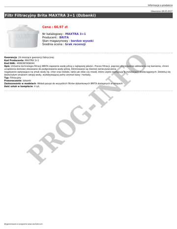 Informacje o produkcie Utworzono 08-03-2017 Filtr Filtracyjny Brita MAXTRA 3+1 (Dzbanki) Cena : 66,97 zł Nr katalogowy : MAXTRA 3+1 Producent : BRITA Stan magazynowy : bardzo wysoki Średnia ocena : brak recenzji PR O G -I N FO Gwarancja: 24 miesiące gwarancji fabrycznej Kod Producenta: MAXTRA 3+1 Kod EAN:: 4006387006044 Opis: Unikalna technologia filtracji BRITA zapewnia wodę pitną o najlepszej jakości. Proces filtracji, poprzez zmniejszenie odkładania się kamienia, chroni urządzenia domowe stosowane do podgrzewania wody pitnej. Eliminowane są również zanieczyszczenia negatywnie wpływające na smak wody np. chlor oraz metale, takie jak ołów czy miedź, które często występują w instalacjach wodociągowych. Delektuj się doskonałym smakiem swojej wody, wydobywającej pełny aromat kawy i herbaty. Typ: Filtracyjny Przeznaczenie: dzbanki Zastosowanie w modelach: Wkład pasuje do wszystkich filtrów dzbankowych BRITA dostępnych w sklepach Ilość sztuk w komplecie: 4 szt. Wygenerowano w programie www.oscGold.com