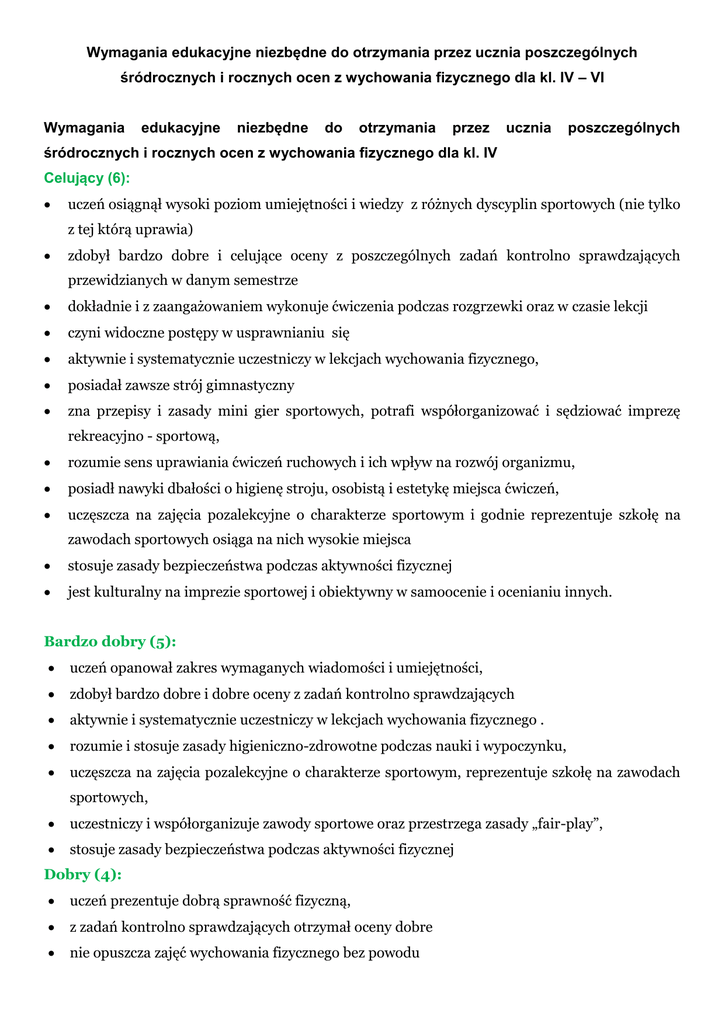 Wymagania edukacyjne niezbędne do otrzymania przez ucznia poszczególnych śródrocznych i rocznych ocen z wychowania fizycznego dla kl. IV – VI Wymagania edukacyjne niezbędne do otrzymania przez ucznia poszczególnych śródrocznych i rocznych ocen z wychowania fizycznego dla kl. IV Celujący (6): uczeń osiągnął wysoki poziom umiejętności i wiedzy z różnych dyscyplin sportowych (nie tylko z tej którą uprawia) zdobył bardzo dobre i celujące oceny z poszczególnych zadań kontrolno sprawdzających przewidzianych w danym semestrze dokładnie i z zaangażowaniem wykonuje ćwiczenia podczas rozgrzewki oraz w czasie lekcji czyni widoczne postępy w usprawnianiu się aktywnie i systematycznie uczestniczy w lekcjach wychowania fizycznego, posiadał zawsze strój gimnastyczny zna przepisy i zasady mini gier sportowych, potrafi współorganizować i sędziować imprezę rekreacyjno - sportową, rozumie sens uprawiania ćwiczeń ruchowych i ich wpływ na rozwój organizmu, posiadł nawyki dbałości o higienę stroju, osobistą i estetykę miejsca ćwiczeń, uczęszcza na zajęcia pozalekcyjne o charakterze sportowym i godnie reprezentuje szkołę na zawodach sportowych osiąga na nich wysokie miejsca stosuje zasady bezpieczeństwa podczas aktywności fizycznej jest kulturalny na imprezie sportowej i obiektywny w samoocenie i ocenianiu innych. Bardzo dobry (5): uczeń opanował zakres wymaganych wiadomości i umiejętności, zdobył bardzo dobre i dobre oceny z zadań kontrolno sprawdzających aktywnie i systematycznie uczestniczy w lekcjach wychowania fizycznego . rozumie i stosuje zasady higieniczno-zdrowotne podczas nauki i wypoczynku, uczęszcza na zajęcia pozalekcyjne o charakterze sportowym, reprezentuje szkołę na zawodach sportowych, uczestniczy i współorganizuje zawody sportowe oraz przestrzega zasady „fair-play”, stosuje zasady bezpieczeństwa podczas aktywności fizycznej Dobry (4): uczeń prezentuje dobrą sprawność fizyczną, z zadań kontrolno sprawdzających otrzymał oceny dobre nie opuszcza zajęć wychowania fizycznego bez powodu wykazuje się zaangażowaniem na lekcjach, troszczy się o higienę osobistą, opanował wiadomości i umiejętności obejmujące podstawowe elementy wiedzy o zajęciach ruchowych, potrafi dokonywać obiektywnej samooceny sprawności swojej i kolegów, jest opanowany, koleżeński, kulturalny w szkole, na imprezie sportowej. Dostateczny (3): uczeń systematycznie pracuje na zajęciach wychowania fizycznego, opanował podstawowe wymagania z wiadomości, umiejętności i motoryczności w zakresie umożliwiającym postęp w dalszym kontynuowaniu zajęć wychowania fizycznego, wykazuje słaby postęp w usprawnianiu się nie bierze udziału w życiu sportowym klasy i szkoły zapominał o stroju gimnastycznym odmawia wykonania zadania, nie podejmuje próby nauczenia się nowego ćwiczenia posiada nawyki higieniczno - zdrowotne, jest koleżeński i uczynny. Dopuszczający (2): uczeń w minimalnym stopniu spełnia podstawowe wymagania programowe lub jest bliski ich spełnienia, wykazuje niską aktywność na zajęciach wychowania fizycznego w ograniczonym stopniu opanował nawyki higieniczno-zdrowotne, często zapominał stroju często opuszcza lekcje wychowania fizycznego nie uczestniczy w organizacji imprez rekreacyjnych przez zespół klasowy. Niedostateczny (1): uczeń nie spełnia podstawowych wymagań programowych, często opuszcza lekcje wychowania fizycznego nie dba o fizyczny rozwój swego organizmu i nie czyni żadnych postępów w poprawianiu sprawności fizycznej, nie bierze udziału w życiu sportowym klasy na lekcjach odmawia wykonania zadań, nie wykonuje ćwiczeń na miarę swoich możliwości wykazuje znaczące braki w integracji zespołowej i wychowaniu społecznym oraz zdrowotnym. Na ocenę semestralną lub roczną dodatni wpływ mogą mieć: - wzorowa postawa na wszystkich zajęciach lekcyjnych, pozalekcyjnych (w tym zawodach sportowych), - udział w zawodach sportowych, ale bez zajmowania miejsca na podium, - propagowanie zdrowego stylu życia w szkole i poza szkołą, - uczestnictwo w pozaszkolnych formach kultury fizycznej (kluby sportowe, towarzystwa związane z kulturą fizyczną ), - pomoc w organizacji pozaszkolnych imprez rekreacyjno – sportowych - prace na rzecz szkoły (plakaty, gazetki, kronika, plansze). UWAGI KOŃCOWE Najważniejszym kryterium oceniania uczniów z wychowania fizycznego jest zaangażowanie na każdej lekcji i wkład pracy włożony w nauczanie poszczególnych elementów( sprawny uczeń nie musi otrzymać oceny celującej i bardzo dobrej, uczeń o niskiej sprawności fizycznej nie jest skazany na ocenę dobrą i dostateczną.) Trzykrotny brak stroju jest równoznaczny z cząstkową oceną niedostateczną. Uczeń , który nie opuszcza zajęć wychowania fizycznego i aktywnie w nich uczestniczy otrzymuje pod koniec każdego semestru cząstkową ocenę celującą za aktywność. Uczniowie biorący udział w zawodach i turniejach międzyszkolnych za każde miejsce punktowane otrzymują dodatkowo ocenę celującą, nie otrzymują ocen za sam udział w zawodach. Raz w semestrze, uczniowie trenujący w klubach sportowych, uprawiający sport prywatnie, ale przynajmniej trzy razy w tygodniu, otrzymują cząstkową ocenę celującą. UWAGA !!! Osiągnięte sukcesy w zawodach sportowych, systematyczny udział w dodatkowych zajęciach sportowych lub treningach wpływają na podwyższenie oceny z przedmiotu( nie koniecznie na ocenę celującą.) Wymagania edukacyjne niezbędne do otrzymania przez ucznia poszczególnych śródrocznych i rocznych ocen z wychowania fizycznego dla kl. V Celujący (6): uczeń osiągnął wysoki poziom umiejętności i wiedzy z różnych dyscyplin sportowych (nie tylko z tej którą uprawia) zdobył bardzo dobre i celujące oceny z poszczególnych zadań kontrolno sprawdzających przewidzianych w danym semestrze dokładnie i z zaangażowaniem wykonuje ćwiczenia podczas ro