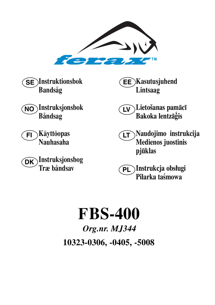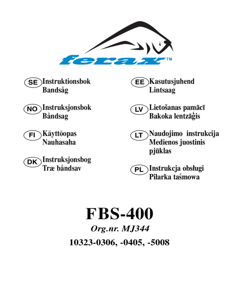 SE Instruktionsbok Bandsåg EE Kasutusjuhend Lintsaag NO Instruksjonsbok Båndsag LV Lietošanas pamācī Bakoka lentzāģis FI Käyttöopas Nauhasaha LT Naudojimo instrukcija Medienos juostinis pjūklas DK Instruksjonsbog Træ båndsav PL Instrukcja obsługi Pilarka taśmowa FBS-400 Org.nr. MJ344 10323-0306, -0405, -5008 Svenska ....................................................................................................................................................3 Norsk ..........................................................................................................................................................7 Suomi.......................................................................................................................................................11 Danska ...................................................................................................................................................15 Eesti ..........................................................................................................................................................19 Latviski .................................................................................................................................................23 Lietuviškai .........................................................................................................................................27 W języku polskim .......................................................................................................................31 SVENSKA INNEHÅLLSFÖRTECKNING 1. 2. 3. 3.2 3.3 3.4 Tekniska data .....................................................3 Emballage ..........................................................3 Viktiga säkerhetsföreskrifter..............................3 Brukaren.............................................................3 Föreanvändning..................................................3 Särskilda säkerhetsbestämmelser för bandsågar......................................................4 4. Jordning/Spänning .............................................4 4.1 Instruktioner för jordning ..................................4 4.2 Inkoppling av strömkälla ...................................4 4.3 Kopplingsschema...............................................4 5. Montering och justering av bord .......................5 5.1 Montering av bord .............................................5 5.2 Justera bordsvinkeln ..........................................5 6. Bruksanvisning för sågblad ...............................5 6.1 Byte av sågblad..................................................5 6.2 Bladstyrning.......................................................5 6.3 nställning av såghöjd .........................................6 7. Driftstörningar och åtgärder som kan vidtagas ..............................................................6 Reservdelslista .........................................................35 EC överensstämmelsedeklaration ............................43 3. VIKTIGA SÄKERHETSFÖRESKRIFTER LÄS ALLA INSTRUKTIONER INNAN MASKINEN TAS I BRUK! 3.1 För att undvika person- eller maskinskada, brand eller elektrisk stöt, se till att arbetsplatsen • inte är dammig, fuktig eller utsatt för väta; • inte innehåller lättantändliga gaser eller vätskor; • har barnsäkra lås och huvudströmbrytaren är frånslagen när den inte används; • har bra belysning; • ren och inte belamrad med saker; • har bra ventilation. 3.2 BRUKAREN SUNT FÖRNUFT OCH FÖRSIKTIGHET INGÅR INTE I MASKINEN. DET SKA BRUKAREN SJÄLV BIDRA MED – SÅ TÄNK PÅ ATT: • undvika kroppskontakt med jordade föremål som ledningar och element; • vara uppmärksam. Använd aldrig maskinen när du är trött; • att inte använda maskinen om du är alkohol- eller drogpåverkad. Läs varningsetiketten på medicinförpackningen för att kunna avgöra om din reaktionsförmåga kommer att påverkas; • att inte använda vida klädesplagg eller smycken som riskerar att fastna i rörliga delar. • att använda halkfri fotbeklädnad; • att använda hårnät för att hålla ihop långt hår; • att använda ögon- och hörselskydd. Ha alltid: • dammskydd och andningsmasker godkända av ANSI vid arbete med trä och metall samt kemiskt damm och ångor; • hel skyddsskärm vid arbete med metall- eller träspån; • hörselskydd; • ordentligt fotfäste och bra balans. DET ÄR VIKTIGT ATT LÄSA IGENOM HELA BRUKSANVISNINGEN INNAN MONTERINGEN PÅBÖRJAS! 1. TEKNISKA DATA ARTIKEL Hjuldiameter Bord, ställbart Bearbetningsutrymme Sågblad, längd Sågblad, bredd Sågbladshastighet Ljudnivå Motor Max. höjd Max. bredd Effekt Spänning Frekvens Hastighet TYP 400 mm 0-45˚ 200 mm 350 mm 2950 mm 6-20 mm 10 m/sek 85 dB(A) 2 hk 230 V 50 Hz 1400 v/m 3.3 FÖRE ANVÄNDNING • Lär känna maskinen. Lär dig hur den ska användas dess begränsningar och eventuella riskmoment. • Kontrollera att ingen maskindel är skadad. I så fall måste delen gås igenom noggrant så att man kan vara säker på att den verkligen fungerar som den är ämnad att fungera. Vid tveksamhet bör delen bytas ut. • Se till att strömbrytaren är i OFF-läge när maskinen ansluts till elnätet. 2. EMBALLAGE Tillbehör 1. Geringslinjal (medföljer) 2. Bruksanvisning 3. Sågbord 3 • Se till att maskinen är väl rengjord och ordentligt oljad. • Kontrollera noggrant att verktyg som ser defekta ut verkligen går att använda till det ändamål de är avsedda för innan de tas i bruk. • Kontrollera och justera rörliga eller skadade delar, monteringsfixturer eller annat som kan inverka på själva manövreringen. Del som är skadad måste bli lagad eller utbytt av en fackman. • Använd inte maskinen om dess strömbrytare inte fungerar ordentligt. Gå aldrig ifrån en maskin som är igång. Glöm inte att slå av huvudströmbrytaren, när maskinen inte körs. Skruva fast maski