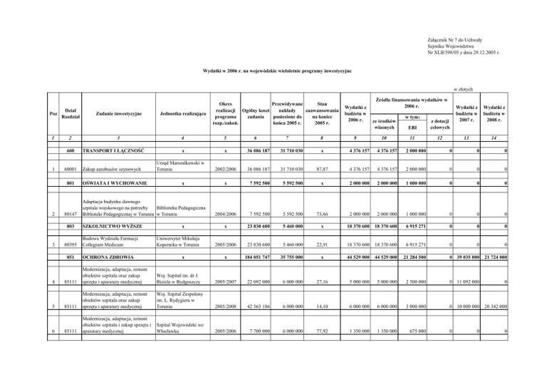 Załącznik Nr 7 do Uchwały Sejmiku Województwa Nr XLII/598/05 z dnia 29.12.2005 r. Wydatki w 2006 r. na wojewódzkie wieloletnie programy inwestycyjne w złotych Poz 1 Dział Rozdział 2 600 1 60001 801 2 80147 803 3 80395 851 4 5 6 Zadanie inwestycyjne 3 TRANSPORT I ŁĄCZNOŚĆ Zakup autobusów szynowych OŚWIATA I WYCHOWANIE Jednostka realizująca Budowa Wydziału Farmacji Collegium Medicum OCHRONA ZDROWIA z dotacji celowych 11 12 13 14 31 710 030 x 4 376 157 4 376 157 2 000 000 0 0 0 2002/2006 36 086 187 31 710 030 87,87 4 376 157 4 376 157 2 000 000 0 0 0 x 7 592 500 5 592 500 x 2 000 000 2 000 000 1 000 000 0 0 0 2004/2006 7 592 500 5 592 500 73,66 2 000 000 2 000 000 1 000 000 0 0 0 x 23 830 600 5 460 000 x 18 370 600 18 370 600 6 915 271 0 0 0 2005/2006 23 830 600 5 460 000 22,91 18 370 600 18 370 600 6 915 271 0 0 0 x 184 051 747 35 755 000 x 44 529 000 44 529 000 21 284 500 0 39 035 000 21 724 000 x 10 EBI 36 086 187 Uniwersytet Mikołaja Kopernika w Toruniu 9 w tym: Wydatki z budżetu w 2008 r. x x 8 ze środków własnych Wydatki z budżetu w 2007 r. x x 7 Źródła finansowania wydatków w 2006 r. 5 Urząd Marszałkowski w Toruniu 6 Wydatki z budżetu w 2006 r. 4 Adaptacja budynku dawnego szpitala wojskowego na potrzeby Biblioteka Pedagogiczna Biblioteki Pedagogicznej w Toruniu w Toruniu SZKOLNICTWO WYŻSZE Okres Przewidywane Stan realizacji Ogólny koszt nakłady zaawansowania programu zadania poniesione do na koniec rozp./zakoń. końca 2005 r. 2005 r. 85111 Modernizacja, adaptacja, remont obiektów szpitala oraz zakup sprzętu i aparatury medycznej Woj. Szpital im. dr J. Biziela w Bydgoszczy 2005/2007 22 092 000 6 000 000 27,16 5 000 000 5 000 000 2 500 000 0 11 092 000 0 85111 Modernizacja, adaptacja, remont obiektów szpitala oraz zakup sprzętu i aparatury medycznej Woj. Szpital Zespolony im. L. Rydygiera w Toruniu 2005/2008 42 563 186 6 000 000 14,10 6 000 000 6 000 000 3 000 000 0 10 000 000 20 342 000 85111 Modernizacja, adaptacja, remont obiektów szpitala i zakup sprzętu i aparatury medycznej Szpital Wojewódzki we Włocławku 2005/2006 7 700 000 6 000 000 77,92 1 350 000 1 350 000 675 000 0 0 0 Poz 1 7 8 9 10 11 12 13 14 15 Dział Rozdział 2 Zadanie inwestycyjne 3 Jednostka realizująca Okres Przewidywane Stan realizacji Ogólny koszt nakłady zaawansowania programu zadania poniesione do na koniec rozp./zakoń. końca 2005 r. 2005 r. 4 5 6 7 8 Woj. Szpital Dziecięcy im. J. Brudzińskiego w Bydgoszczy 2005/2008 5 311 000 1 000 000 2005/2007 12 718 000 2006 Wydatki z budżetu w 2006 r. Źródła finansowania wydatków w 2006 r. ze środków własnych w tym: EBI z dotacji celowych 12 Wydatki z budżetu w 2007 r. Wydatki z budżetu w 2008 r. 13 14 9 10 11 18,83 929 000 929 000 464 500 0 2 000 000 1 382 000 2 018 000 15,87 4 000 000 4 000 000 2 000 000 0 5 200 000 0 24 800 000 0 0,00 8 000 000 8 000 000 4 000 000 0 0 0 85111 Modernizacja, adaptacja, remont obiektów szpitala oraz zakup sprzętu i aparatury medycznej 85111 Woj. Szpital Budowa budynku łóżkowego wraz z Obserwacyjno-Zakaźny Izbą Przyjęć przy ul. Floriana 12 i im. T. Browicza w zakup sprzętu i aparatury medycznej Bydgoszczy 85111 Modernizacja Centrum Diagnostyczno-Leczniczego we Włocławku Filii Centrum Onkologii w Bydgoszczy Centrum OnkologiiSzpital im. prof. Łukaszczyka w Bydgoszczy oddział we Włocławku 85111 Modernizacja, adaptacja obiektów szpitala oraz zakup sprzętu i aparatury medycznej Centrum OnkologiiSzpital im. prof. Łukaszczyka w Bydgoszczy 2005/2007 41 507 561 9 000 000 21,68 3 068 000 3 068 000 1 534 000 0 5 396 000 0 85111 Modernizacja, adaptacja, remont obiektów szpitala oraz zakup sprzętu i aparatury medycznej Kujawsko-Pomorskie Centrum Pulmonologii w Bydgoszczy 2005/2007 8 617 000 3 245 000 37,66 3 415 000 3 415 000 1 707 500 0 1 897 000 0 85111 Modernizacja, remont obiektów szpitala oraz zakup sprzętu i aparatury medycznej Wojewódzki Szpital Obserwacyjno-Zakaźny w Toruniu 2006-2007 650 000 0 0,00 400 000 400 000 0 0 250 000 0 85111 Modernizacja, remont obiektów szpitala oraz zakup sprzętu i aparatury medycznej Regionalny Zespół Opieki Paliatywnej Dom Sue Ryder w Bydgoszczy 2006 200 000 0 0,00 200 000 200 000 0 0 0 0 85115 Remont obiektów Kolejowe Sanatorium Uzdrowiskowe w Inowrocławiu 2006 150 000 0 0,00 150 000 150 000 0 0 0 0 85120 Modernizacja, remont, zakup sprzętu i aparatury medycznej Woj. Szpital dla Nerwowo i Psychicznie Chorych w Świeciu 2 150 000 40 000 1,86 1 100 000 1 100 000 550 000 0 1 000 000 0 2005/2007 Poz 1 Dział Rozdział 7 2005/2006 674 000 330 000 2006/2007 500 000 85121 Woj. Przychodnia Modernizacja przychodni oraz Dermatologiczna w zakup sprzętu i aparatury medycznej Bydgoszczy 2005/2006 85121 Modernizacja kotłowni, instalacji, poddasza i placu parkingowego Zespół Przychodni Lekarskich OLK w Toruniu Modernizacja oraz zakup sprzętu i aparatury medycznej Bydgoskie Centrum Diabetologii i Endokrynologii w Bydgoszczy 85121 22 23 17 18 19 20 21 24 4 5 85120 Modernizacja, remont obiektów szpitala i zakup aparatury medycznej Woj. Ośrodek Lecznictwa Psychiatrycznego w Toruniu 85120 Zakup sprzętu i aparatury medycznej Wojewódzka Przychodnia Zdrowia Psychicznego w Bydgoszczy 8 Wydatki z budżetu w 2006 r. Źródła finansowania wydatków w 2006 r. ze środków własnych w tym: EBI z dotacji celowych 12 Wydatki z budżetu w 2007 r. Wydatki z budżetu w 2008 r. 13 14 9 10 11 48,96 320 000 320 000 160 000 0 0 0 0 0,00 200 000 200 000 0 0 300 000 0 2 300 000 800 000 34,78 1 500 000 1 500 000 750 000 0 0 0 2005/2006 567 000 400 000 70,55 167 000 167 000 83 500 0 0 0 2006/2007 2 300 000 0 0,00 1 000 000 1 000 000 500 000 0 1 300 000 0 Modernizacja i adaptacja budynku przy ul. Markwarta 8 Wojewódzka Przychodnia ReumatologicznoRehabilitacyjna w Bydgoszczy 2006 2 000 000 0 0,00 2 000 000 2 000 000 1 000 000 0 0 0 85121 Zakup sprzętu i aparatury medycznej Wojewódzka Przychodnia Sportowo-Lekarska w Bydgoszczy 2006/2007 400 000 0 0,00 200 0