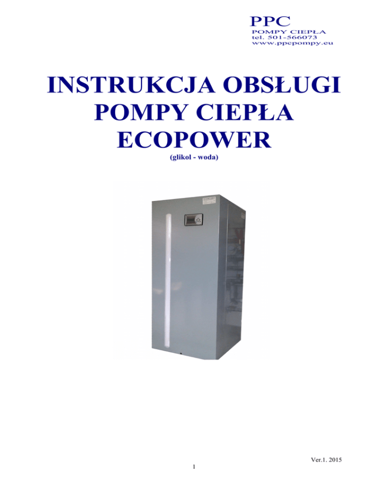 PPC POMPY CIEPŁA tel. 501-566073 www.ppcpompy.eu INSTRUKCJA OBSŁUGI POMPY CIEPŁA ECOPOWER (glikol - woda) Ver.1. 2015 1 Zalecenia przed włączeniem pompy ciepła. • Podczas ustawiania, przesuwania, podnoszenia nie należy chwytać za rurki. • Wypoziomować urządzenie za pomocą obrotowych nóżek. • Pompa ciepła pracuje prawidłowo w temperaturze otoczenia od +10°C do+32°C i wilgotności poniżej 80%. Nie należy pozostawiać jej w nie ogrzewanym domu jesienią i zimą. • Po ustawieniu URZĄDZENIA na swoim miejscu można ją włączyć po 2 godzinach, gdyż podczas transportu mogło być nadmiernie przechylone. • Producent nie ponosi odpowiedzialności za szkody wynikłe z nieprzestrzegania zasad umieszczonych w instrukcji, dlatego należy uważnie przeczytać informacje na temat bezpieczeństwa pracy, użytkowania.. • Prosimy o zachowanie tej instrukcji w celu wykorzystania jej w przyszłości lub przekazania ewentualnemu następnemu użytkownikowi. • Zwrócić szczególną uwagę, aby z urządzenia nie korzystały pozostawione bez opieki dzieci. Nie pozwalać dzieciom bawić się urządzeniem. • Dźwięki słyszalne jako trzaskanie są spowodowane przez rozszerzanie i kurczenie się części na skutek zmian temperatury. • Przed każdą czynnością konserwacyjną należy wyjąć wtyczkę z gniazdka sieciowego, lub wyłączyć urządzenie wyłącznikiem. • Ze względu na bezpieczeństwo nie naprawiać urządzenia we własnym zakresie. Naprawy, wykonywane przez osoby nie posiadające wymaganych kwalifikacji mogą stanowić poważne niebezpieczeństwo dla użytkownika urządzenia. • Jeżeli urządzenia nie będziemy więcej użytkować, to przed jego złomowaniem należy je całkowicie zabezpieczyć tj. odciąć przewód zasilający. • W przypadku uszkodzenia układu chłodniczego należy przewietrzyć przez kilka minut pomieszczenie, w którym stoi urządzenie (pomieszczenie to musi mieć przynajmniej 10 m3). • W warunkach dużej wilgotności powietrza i różnicy temperatur może pojawić się skroplina na układzie DZ • Dla zapewnienia swobodnego dostępu odległość pomiędzy ścianą boczną pompy ciepła a ścianą pomieszczenia winna wynosić 5 cm. Odległość pomiędzy ścianą tylną pompy ciepła a ścianą budynku powinna wynosić min. 10cm. Podłączenie do instalacji. • Urządzenie należy podłączyć do sieci prądu przemiennego 400V, 50Hz, poprzez prawidłowo wykonane przyłącze elektryczne, uziemione i zabezpieczone bezpiecznikiem nad prądowym i różnicowym o prądzie zadziałania 30mA. Podłączenie powinien wykonać elektryk. • Uziemienie urządzenia jest wymagane przepisami prawa. Producent zrzeka się jakiejkolwiek odpowiedzialności z tytułu ewentualnych szkód, jakie mogą ponieść osoby lub przedmioty na skutek niewypełnienia obowiązku nałożonego przez ten przepis. • Urządzenie należy podłączyć hydraulicznie do dolnego i górnego źródła za pomocą gwintów calowych 1” . • Na wejściu do urządzenie bezwzględnie zamontować filtry siatkowe dostosowane średnicą do przepływu w danym urządzeniu. • Uzupełnić czynnik w instalacji dolnego źródła pompy ciepła do ciśnienia ok. 1,5 bar. Czynnik chłodniczy powinien mieć temp. Zamarzania min. 14 stopni Celciusza. Odpowietrzyć dolne źródło. 2 • Uzupełnić czynnik grzewczy w górnym źródle do ciśnienia ok. 1,5 bar. Odpowietrzyć górne źródło • Dane dotyczące napięcia i pobieranej mocy są na tabliczce znamionowej, znajdującej się tabliczce znamionowej. Użytkowanie pompy ciepła • Po włączeniu zasilania zapali się panel sterujący pompy ciepła. Pompa ciepła jest wyposażona w czujnik kolejności i zaniku faz. Jeżeli fazy nie są zgodne lub napięcie zasilające nie spełnia wymagań panel sterujący nie włączy się. Ważniejsze funkcje realizowane przez regulator pompy ciepła: • praca w dwóch trybach: Zima, Lato, wybieranych ręcznie lub automatycznie, • pogodowa regulacja temperatury w obwodzie CO realizowana w oparciu o • wybraną krzywą grzania i program tygodniowy, • ochrona przed mrozem, • ochrona pompy obiegowej CO przed zakleszczeniem, • tygodniowy program grzania CWU, • praca z lub bez priorytetu CWU, • program dezynfekcji instalacji CWU załączany ręcznie lub automatycznie, • tygodniowy program działania cyrkulacji CWU z cykliczną pracą pompy, • tygodniowy program taryfy opłat za energię elektryczną, • program ferie załączany na określoną parametrem ilość dni, • program party załączany na określoną parametrem liczbę godzin, • kontrola temperatury na wyjściu pompy ciepła, • kontrola temperatury na wejściu i wyjściu dolnego źródła, • współpraca z presostatem pompy ciepła, • ochrona pomp przed zakleszczeniem, • sygnalizacja stanów alarmowych dźwiękowa (zadziałanie presostatu lub uszkodzenie czujnika temperatury), • liczniki czasu pracy pompy ciepła, • wyświetlanie wszystkich mierzonych temperatur, • wyświetlanie stanu pracy pompy ciepła i instalacji, • funkcja testu wyjść umożliwiająca sprawdzenie poprawności połączeń elektrycznych, Regulator ma podświetlany wyświetlacz LCD 4x16 znaków oraz klawiaturę składającą się z 5 przycisków. Naciśnięcie przycisku potwierdzane jest sygnałem dźwiękowym. Jeżeli sprawne są wszystkie tory pomiarowe i zwarte jest wejście od presostatu pompy dioda w lewym górnym rogu pulpitu świeci na zielono. Czerwony kolor diody sygnalizuje błąd toru pomiarowego (niesprawny czujnik, przerwa w linii czujnika) lub rozwarcie wejścia presostatu. Po włączeniu zasilania wyświetlany jest ekran główny. • • W pierwszym wierszu wyświetlany jest bieżący dzień tygodnia (Pn, Wt, Sr, Cz, Pt, So, Ni), bieżący czas oraz informacja o trybie pracy sterownika. Pole tryb pracy może przyjmować następujące wartości: Lato(R) Ręcznie wybrany tryb Lato (Lato obowiązuje bez względu na to,