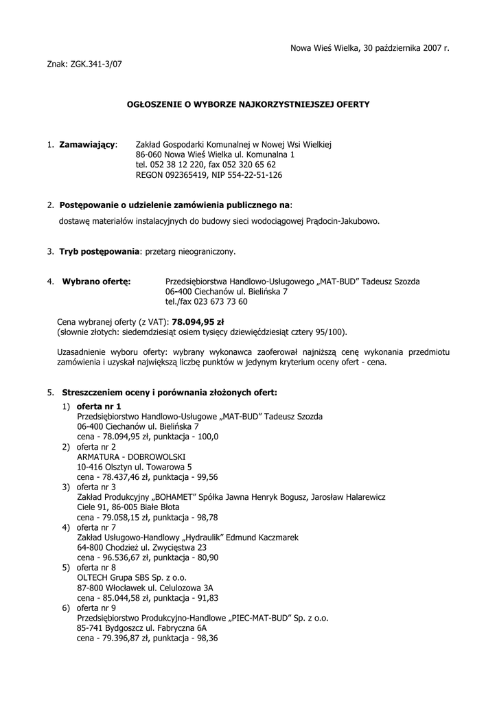 Nowa Wieś Wielka, 30 października 2007 r. Znak: ZGK.341-3/07 OGŁOSZENIE O WYBORZE NAJKORZYSTNIEJSZEJ OFERTY 1. Zamawiający: Zakład Gospodarki Komunalnej w Nowej Wsi Wielkiej 86-060 Nowa Wieś Wielka ul. Komunalna 1 tel. 052 38 12 220, fax 052 320 65 62 REGON 092365419, NIP 554-22-51-126 2. Postępowanie o udzielenie zamówienia publicznego na: dostawę materiałów instalacyjnych do budowy sieci wodociągowej Prądocin-Jakubowo. 3. Tryb postępowania: przetarg nieograniczony. 4. Wybrano ofertę: Przedsiębiorstwa Handlowo-Usługowego „MAT-BUD” Tadeusz Szozda 06-400 Ciechanów ul. Bielińska 7 tel./fax 023 673 73 60 Cena wybranej oferty (z VAT): 78.094,95 zł (słownie złotych: siedemdziesiąt osiem tysięcy dziewięćdziesiąt cztery 95/100). Uzasadnienie wyboru oferty: wybrany wykonawca zaoferował najniŜszą cenę wykonania przedmiotu zamówienia i uzyskał największą liczbę punktów w jedynym kryterium oceny ofert - cena. 5. Streszczeniem oceny i porównania złoŜonych ofert: 1) oferta nr 1 Przedsiębiorstwo Handlowo-Usługowe „MAT-BUD” Tadeusz Szozda 06-400 Ciechanów ul. Bielińska 7 cena - 78.094,95 zł, punktacja - 100,0 2) oferta nr 2 ARMATURA - DOBROWOLSKI 10-416 Olsztyn ul. Towarowa 5 cena - 78.437,46 zł, punktacja - 99,56 3) oferta nr 3 Zakład Produkcyjny „BOHAMET” Spółka Jawna Henryk Bogusz, Jarosław Halarewicz Ciele 91, 86-005 Białe Błota cena - 79.058,15 zł, punktacja - 98,78 4) oferta nr 7 Zakład Usługowo-Handlowy „Hydraulik” Edmund Kaczmarek 64-800 ChodzieŜ ul. Zwycięstwa 23 cena - 96.536,67 zł, punktacja - 80,90 5) oferta nr 8 OLTECH Grupa SBS Sp. z o.o. 87-800 Włocławek ul. Celulozowa 3A cena - 85.044,58 zł, punktacja - 91,83 6) oferta nr 9 Przedsiębiorstwo Produkcyjno-Handlowe „PIEC-MAT-BUD” Sp. z o.o. 85-741 Bydgoszcz ul. Fabryczna 6A cena - 79.396,87 zł, punktacja - 98,36