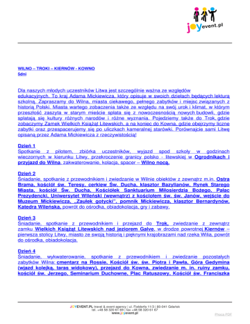 WILNO – TROKI – KIERNÓW - KOWNO 5dni Dla naszych młodych uczestników Litwa jest szczególnie ważna ze względów edukacyjnych. To kraj Adama Mickiewicza, który opisuje w swoich dziełach będących lekturą szkolną. Zapraszamy do Wilna, miasta ciekawego, pełnego zabytków i miejsc związanych z historią Polski. Miasta wartego zobaczenia także ze względu na swój urok i klimat, w którym przeszłość zaszyta w starym mieście splata się z nowoczesnością nowych budowli, gdzie splatają się kultury różnych narodów i różne wyznania. Pojedziemy także do Trok, gdzie zobaczymy Zamek Wielkich Książąt Litewskich, a na koniec do Kowna, gdzie obejrzymy liczne zabytki oraz przespacerujemy się po uliczkach kameralnej starówki. Porównajcie sami Litwę opisaną przez Adama Mickiewicza z rzeczywistością! Dzień 1 Spotkanie z pilotem, zbiórka uczestników, wyjazd spod szkoły w godzinach wieczornych w kierunku Litwy, przekroczenie granicy polsko - litewskiej w Ogrodnikach i przyjazd do Wilna, zakwaterowanie, kolacja, spacer – Wilno nocą. Dzień 2 Śniadanie, spotkanie z przewodnikiem i zwiedzanie w Wilnie obiektów z zewnątrz m.in. Ostra Brama, kościół św. Teresy, cerkiew Św. Ducha, klasztor Bazylianów, Rynek Starego Miasta, kościół Św. Ducha, Kościółek Sanktuarium Miłosierdzia Bożego, Pałac Prezydencki, Uniwersytet Wileński (wewnątrz) z kościołem św. św. Janów, wejście do Muzeum Mickiewicza, „Zaułek gotycki”, pomnik Mickiewicza, klasztor Bernardynów, Katedra Wileńska, powrót do ośrodka, obiadokolacja, gry i zabawy. Dzień 3 Śniadanie, spotkanie z przewodnikiem i przejazd do Trok, zwiedzanie z zewnątrz zamku Wielkich Książąt Litewskich nad jeziorem Galve, w drodze powrotnej Kiernów – pierwsza stolicy Litwy, miasto ze swoją historią i pięknymi krajobrazami nad rzeka Wilia, powrót do ośrodka, obiadokolacja. Dzień 4 Śniadanie, wykwaterowanie, spotkanie z przewodnikiem i zwiedzanie pozostałych zabytków Wilna: cmentarz na Rossie, Kościół św. św. Piotra i Pawła, Góra Gedymina (wjazd kolejką, taras widokowy), przejazd do Kowna, zwiedzanie m. in. ruiny zamku, kościół św. Jerzego, Seminarium Duchowne, Plac Ratuszowy, Kościół św. Franciszka JOYEVENT.PL travel & event agency | ul. Fieldorfa 11/3 | 80-041 Gdańsk tel. +48 58 320 61 69 | fax +48 58 320 61 67 www.joyevent.pl Phoca PDF Ksawerego i gimnazjum, w którym uczył Adam Mickiewicz, kościół Witolda Archikatedra św. św. Piotra i Pawła, obiadokolacja, wyjazd w drogę powrotną. Dzień 5 W godzinach porannych przyjazd pod szkołę. Uwaga! Istnieje możliwość wzbogacenia programu o: - wejście do Zamku w Trokach - rejs statkiem po jeziorze w Trokach - wjazd na wieżę telewizyjną w Wilnie - Muzeum Diabłów w Kownie - Akropolio Ledas – lodowisko w centrum handlowym. - poszerzenie zwiedzania trasy Uniwersytetu Wileńskiego - Pałac Wielkich Książąt Litewskich - wstęp do podziemi katedry wileńskiej - Muzeum Więzienia KGB w Wilnie - Muzeum Dziedzictwa Kościelnego w byłym kościele św. Michała w Wilnie - wizytę w Aquaparku Vichy - wizytę w Parku Europy (okolice Wilna) - wizytę w Geograficznym Centrum Europy pod Wilnem O szczegóły zapytaj w biurze! Cena: od 647 PLN (dla grupy min. 45os.) Cena zawiera: Zakwaterowanie w schronisku młodzieżowym w Wilnie, pokoje 3-5 osobowe, łazienki na korytarzu (WC, umywalka, prysznic), wyżywienie zgodne z programem, przejazd autokarem klasy turystycznej z dwoma kierowcami, opieka i pomoc pilota, usługi przewodnickie, ubezpieczenie KL i NNW zagranicą, podatek VAT. Bilety wstępu do zwiedzanych obiektów płatne dodatkowo – ok. 40 zł / os. Program imprezy jest ramowy, kolejność zwiedzania może ulec zmianie. Planujesz zorganizować klasową wycieczkę „z klasą”? Szukasz transportu, przewodnika, pilota, programu wycieczki? Nasze biuro podróży z przyjemnością Ci w tym pomoże. Joytrip.pl to organizator wycieczek szkolnych nastawiony przede wszystkim JOYEVENT.PL travel & event agency | ul. Fieldorfa 11/3 | 80-041 Gdańsk tel. +48 58 320 61 69 | fax +48 58 320 61 67 www.joyevent.pl Phoca PDF na satysfakcję klientów. W ramach turystyki szkolnej oferujemy autorskie programy wyjazdów szkolnych, zielonych szkół, biwaków i wycieczek krajoznawczych. Najchętniej wybierane przez naszych klientów programy i regiony to: Kraków, Warszawa, Lwów, Praga, Łeba, Zakopane, Poznań, Mazury, Pomorze, Bieszczady, Tatry, Szlak Piastowski, Pomorze. Podróżujemy zawsze bezpiecznie autokarem, busem lub pociągiem. Każda z naszych wycieczek daje możliwość aktywnego wypoczynku, naturalnego poszerzenia wiedzy uczniów i ich integracji przez zabawę, której tak często brakuje w dobie intensywnej komputeryzacji. JOYEVENT.PL travel & event agency | ul. Fieldorfa 11/3 | 80-041 Gdańsk tel. +48 58 320 61 69 | fax +48 58 320 61 67 www.joyevent.pl Phoca PDF