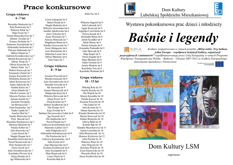 Grupa wiekowa 6 -7 lat Weronika Markocka lat 7 Pola Piotrowska lat 7 Wiktoria Palak lat 7 Maja Fiszer lat 7 Noemi Banaszkiewicz lat 7 Michał Zwolak lat 7 Tomasz Zieliński lat 7 Sebastian Szwedziński lat 7 Aleksandra Suchorab lat 7 Patrycja Radomska lat 7 Miłosz Marek lat 7 Gabriela Kwiatkowska Lat 7 Michał Kosmowski lat 7 Adrian Knap lat 7 Oliwia Kiszczak lat 7 Hubert Sidor lat 7 Hubert Krawczyk lat 7 Emanuela Chmiel lat 7 Kacper Kowalski lat 7 Michalina Klusek lat 7 Jakub Konieczny lat 7 Adam Sadowski lat 7 Natalia Kalisz lat 7 Alicja Matuła lat 7 Nikola Czerniec lat 7 Marysia Puchacz lat 6 Justyna Szalak lat 7 Zuzanna Niezgoda Jaś Bernaszczuk 7 Anna Szumacher lat 7 Nadia Capała lat 7 Amelia Okal lat 7 Amelia Walewska lat 6 Piotr Buczak lat 6 Weronika Hordyjewicz lat 7 Martyna Mazurek lat 7 Natalia Ścibor lat 7 Julia Kitowska lat 7 Laura Kuraś lat 7 Magda Dragan lat 6 Karolinka Kitowska lat 6 Paweł Sasimowski lat 7 Piotr Sasimowski lat 7 Zuzia Guzek lat 6 Julia Niezabitowska lat 7 Karolinka Oliveira lat 6 Alicja Słomka lat 6 Iga Mitkowska lat 6 Julita Fac lat 8 Liwia Łukianiuk lat 6 Marta Flisiak lat 6 Magda Skałecka lat 6 Wiktoria Gawrońska lat 6 Amelka Jakubowska lat 6 Julia Cichocka lat 6 Kasia Wierucka lat 7 Antosia Matuszak lat 7 Magdalena Baran lat 6 Natalka Grzeszczuk lat 7 Zuzia Małagocka lat 6 Asia Warchulska lat 6 Sebastian Łazarz lat 6 Milosz Błachnio lat 6 Julia Gajos lat 7 Grupa wiekowa 8 - 9 lat Szymon Pszczoła lat 9 Monika Gonciarz lat 9 Julia Jóźwiakowska lat 8 Matylda Gwozda lat 8 Ida Aurzecka lat 9 Joanna Maziarczyk lat 9 Małgorzata Kura lat 9 Wiktoria Brewczak lat 9 Alicja Przeor lat 9 Alicja Komsta lat 9 Hubert Szydłowski lat 8 Ola Przypis lat 9 Kaja Zwolak lat 9 Barbara Drewnowska-Ciołek lat 9 Iga Nazaruk lat 9 Ola Samborska lat 9 Paweł Patejuk lat 9 Gabrysia Krochmalska lat 8 Martynka Łubiarz lat 8 Julia Podgórska lat 8 Aleksandra Kołodziejczyk lat 8 Ola Pawłowska lat 8 Gabrysia Kazimierska lat 8 Julia Florek lat 8 Inga Maciejewska lat 8 Zuzanna Kucharczyk lat 8 Julia Szczepanik lat 8 Maja Bojarczuk lat 8 Laura Olech lat 9 Kornelia Bąk lat 8 Wiktoria Stępoch lat 9 Julia Łukasiak lat 9 Agata Krzaczek lat 9 Angelika Czerwińska lat 9 Sylwia Kusak lat 8 Dominika Baran lat 8 Jakub Szyndler lat 9 Jakub Mazur lat 8 Dorota Zarucka lat 9 Dominika Podsiadła lat 9 Julia Śpiewak lat 8 Maja Koper lat 9 Otylia Kapała lat 9 Maja Błachnio lat 8 Oskar Groński lat 9 Aniela Michota lat 8 Karolinka Trus lat 8 Karolinka Woźniak lat 8 Dom Kultury Lubelskiej Spółdzielni Mieszkaniowej Wystawa pokonkursowa prac dzieci i młodzieży Baśnie i legendy Konkurs zorganizowano w ramach projektu „Bliżej siebie. Trzy kultury, jedna Europa – współpraca instytucji kultury, organizacji pozarządowych i animatorów” współfinansowanego przez Unię Europejską w ramach Programu Współpracy Transgranicznej Polska – Białoruś – Ukraina 2007-2013 ze środków Europejskiego Instrumentu Sąsiedztwa i Partnerstwa Grupa wiekowa 10 - 13 lat Mikołaj Rola lat 10 Amelia Rzecka lat 10 Ola Wójcik lat 10 Maciej Koszałka lat 10 Natalia Kaczor lat 10 Zuzanna Pszczoła lat 10 Ola Gałan lat 10 Ania Komsta lat 11 Hanna Sprawka lat 10 Klaudia Brodowska lat 10 Maciej Staszczyk lat 10 Kalina Bronecka lat 10 Oliwia Bilik lat 10 Kamila Bąk lat 10 Klaudia Mazurkiewicz lat 11 Janina Lużyńska lat 10 Julia Bernaszczuk lat 12 Mateusz Kryłowicz lat 12 Julia Pawlak lat 10 Wiktoria Witer lat 10 Julia Wiączek lat 10 Karolina Wójcik lat 10 Zosia Staszewska lat 10 Weronika Bryk lat 10 Zuzia Szydłowska lat 10 Dom Kultury LSM zaprasza Projekt „Bliżej siebie. Trzy kultury, jedna Europa – współpraca instytucji kultury, organizacji pozarządowych i animatorów” współfinansowany przez Unię Europejską w ramach Programu Współpracy Transgranicznej Polska – Białoruś – Ukraina 2007-2013 ze środków Europejskiego Instrumentu Sąsiedztwa i Partnerstwa Projekt skierowany jest do instytucji kultury, organizacji pozarządowych i animatorów we Lwowie, Lublinie i Brześciu. Do uczestnictwa w projekcie zgłosiły się instytucje kultury współfinansowane przez samorząd: 3 osiedlowe instytucje kultury w Lublinie (Dom Kultury LSM, Dom Kultury Czechów i Dom Kultury Bronowice), 3 instytucje kultury w Brześciu (Dom Kultury Kolejarz, Miejski Dom Kultury oraz Pałac Kultury), 2 instytucje kultury we Lwowie (Miejski Pałac Kultury i Dom Kultury Lewandówka). Łącznie w projekcie będzie uczestniczyć: 936 artystów (prezentacje artystyczne), 18 instruktorów kultury (wizyty studyjno-szkoleniowe), 147 animatorów kultury (szkolenia specjalistyczne), 540 uczestników konkursów. Dodatkowo w imprezach zamykających projekt uczestniczyć będzie ok. 18 000 widzów (Planeta LublinLwów-Brześć). W kategorii 6-7 lat przyznano miejsce: 1. Weronika Hordyjewicz lat 7, Dzielnicowy Dom Kultury „Bronowice”, inst. Ewa Rejmak 2. Laura Kuraś lat 7, Dom Kultury Lubelskiej Spółdzielni Mieszkaniowej, inst. Monika Sierzpowska 3. Justyna Swoygier lat 7, Dom Kultury „Błonie”, inst.. Aleksandra Kędziora Wyróżnienia: Tomasz Zieliński lat 7, Zespół Szkół nr 4 w Krasnymstawie, inst. Małgorzata Wróbel i Maria Liśkiewicz Amelia Okal lat 6, Dzielnicowy Dom Kultury „Bronowice”, inst. Ewa Rejmak Julia Gajos Lat 7, Dzielnicowy Dom Kultury „Czechów”, inst.. Marzena Miszczuk-Głowacka Michalina Klusek lat 7, Zespół Szkół nr 4 w Krasnymstawie, inst. Maria Liśkiewicz Grzegorz van Oorschot lat 7, Zespół Szkół nr 4 w Krasnymstawie, inst. Maria Liśkiewicz Paweł Sasimowski lat 7, Dom Kultury Lubelskiej Spółdzielni Mieszkaniowej, inst. Monika Sierzpowska Pola Piotrowska lat 7, Szkoła Podstawowa im. Bolesława Chrobrego w Lublinie, inst. Katarzyna Koch-Ostrowska Emanuela Chmiel lat 7, Zespół Szkół nr 4 w Krasnymstawie, inst. Maria Liśkiewicz Magdalena Baran lat 6, Dzielnicowy Dom Kultury „Czechów”, inst.. Marzena Miszczuk-Głowacka Kamil Mazurkiewicz la