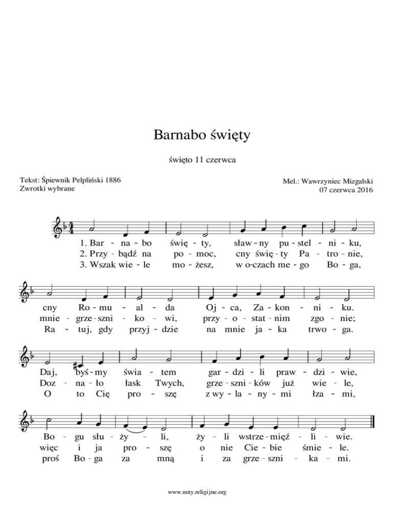 Barnabo święty święto 11 czerwca Tekst: Śpiewnik Pelpliński 1886 Zwrotki wybrane 44 Mel.: Wawrzyniec Mizgalski 07 czerwca 2016 1. Bar na bo 2. Przy bądź na 3. Wszak wie le świę ty, po moc, mo żesz, cny mnie Ra Ro mu grze szni tuj, gdy al ko przyj da wi, dzie sław ny pu stel cny świę ty Pa w o czach me go Oj ca, Za kon przy o stat nim na mnie ja ka ni ku, tro nie, Bo ga, ni zgo trwo ku. nie; ga. dzi wie łza wie, le, mi, li śmie ka wie. le. mi. Daj, Doz O Bo więc proś byś my na ło to Cię gu słu i ja Bo ga świa łask pro ży pro za tem Twych, szę gar dzi li praw grze szni ków już z wy la ny mi li, szę mną ży o i li wstrze mięź nie Cie bie za grze szni www.nuty.religijne.org