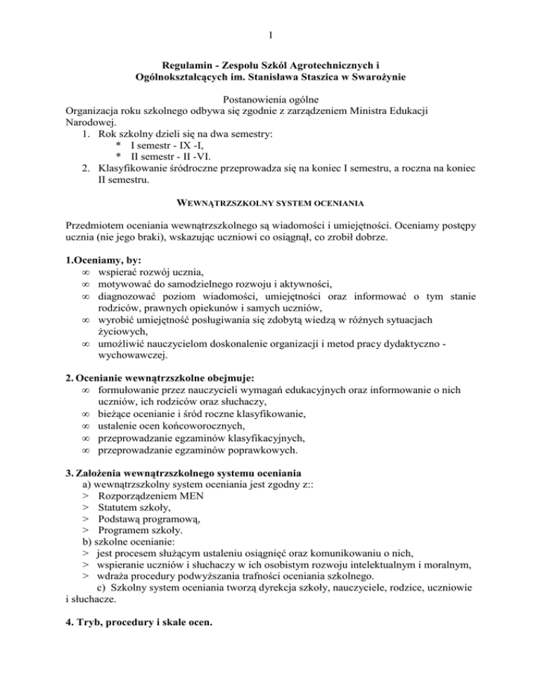 1 Regulamin - Zespołu Szkól Agrotechnicznych i Ogólnokształcących im. Stanisława Staszica w Swarożynie Postanowienia ogólne Organizacja roku szkolnego odbywa się zgodnie z zarządzeniem Ministra Edukacji Narodowej. 1. Rok szkolny dzieli się na dwa semestry: * I semestr - IX -I, * II semestr - II -VI. 2. Klasyfikowanie śródroczne przeprowadza się na koniec I semestru, a roczna na koniec II semestru. WEWNĄTRZSZKOLNY SYSTEM OCENIANIA Przedmiotem oceniania wewnątrzszkolnego są wiadomości i umiejętności. Oceniamy postępy ucznia (nie jego braki), wskazując uczniowi co osiągnął, co zrobił dobrze. 1.Oceniamy, by: • wspierać rozwój ucznia, • motywować do samodzielnego rozwoju i aktywności, • diagnozować poziom wiadomości, umiejętności oraz informować o tym stanie rodziców, prawnych opiekunów i samych uczniów, • wyrobić umiejętność posługiwania się zdobytą wiedzą w różnych sytuacjach życiowych, • umożliwić nauczycielom doskonalenie organizacji i metod pracy dydaktyczno wychowawczej. 2. Ocenianie wewnątrzszkolne obejmuje: • formułowanie przez nauczycieli wymagań edukacyjnych oraz informowanie o nich uczniów, ich rodziców oraz słuchaczy, • bieżące ocenianie i śród roczne klasyfikowanie, • ustalenie ocen końcoworocznych, • przeprowadzanie egzaminów klasyfikacyjnych, • przeprowadzanie egzaminów poprawkowych. 3. Założenia wewnątrzszkolnego systemu oceniania a) wewnątrzszkolny system oceniania jest zgodny z:: > Rozporządzeniem MEN > Statutem szkoły, > Podstawą programową, > Programem szkoły. b) szkolne ocenianie: > jest procesem służącym ustaleniu osiągnięć oraz komunikowaniu o nich, > wspieranie uczniów i słuchaczy w ich osobistym rozwoju intelektualnym i moralnym, > wdraża procedury podwyższania trafności oceniania szkolnego. c) Szkolny system oceniania tworzą dyrekcja szkoły, nauczyciele, rodzice, uczniowie i słuchacze. 4. Tryb, procedury i skale ocen. 2 UCZNIOWIE. Sposób informowania uczniów i ich rodziców (opiekunów prawnych) o zakresie i kryteriach wymagań: na początku roku szkolnego nauczyciele informują uczniów i ich rodziców o wymaganiach edukacyjnych wynikających z realizowanego programu nauczania oraz o sposobach sprawdzania osiągnięć edukacyjnych uczniów i kryteriach oceniania, w przypadku ucznia z opinią i orzeczeniem Poradni Psychologicznopedagogicznej nauczyciel dostosowuje wymagania edukacyjne do indywidualnych możliwości ucznia, zapoznanie z obowiązującym zakresem i kryteriami wymagań z poszczególnych przedmiotów rodzice (opiekunowie prawni) potwierdzają własnoręcznym podpisem w zeszycie przedmiotowym ucznia. b) Sposób informowania rodziców (opiekunów prawnych) o postępach w nauce i frekwencji ich dzieci: Korespondencja w dzienniczku lub zeszycie przedmiotowym wg ustaleń nauczyciela, Ogólnoklasowe spotkania z rodzicami według harmonogramu - informacja na stronie internetowej Szkoły, Indywidualne spotkania z rodzicami, Informacje telefoniczne potwierdzone zapisem w dzienniku. c) Ocenie podlegają: • Sprawdziany pisemne wiadomości (praca klasowa, testy, kartkówki), • Praca ucznia na lekcjach (odpowiedź ustna, aktywność, współudział w prowadzeniu lekcji np. referat), • Samodzielna praca domowa ucznia (Praca pisemna w zeszycie, odpowiedź, praca projektowa-praktyczna). d) Sposób zaliczania zajęć edukacyjnych: 1. Nieobecności ucznia czy słuchacza na zajęciach szkolnych: 1) każdorazowa nieobecność w szkole winna być usprawiedliwiona w ciągu 7 dni: • uczniowie niepełnoletni przedstawiają wychowawcy usprawiedliwienie napisane przez rodziców (prawnych opiekunów) w dzienniczku ucznia, • uczniowie pełnoletni i słuchacze sami usprawiedliwiają nieobecności. 2) planowana, dłuższa nieobecność ucznia czy słuchacza w szkole powinna być wcześniej uzgodniona na piśmie z wychowawcą i Dyrektorem, 3) zobowiązuje się rodziców do zawiadomienia szkoły o dłuższej nieobecności ucznia spowodowanej choroby w celu umożliwienia zorganizowania pomocy ze strony szkoły, 4) gdy uczeń pozostaje w internacie o nieobecności powiadamia i usprawiedliwia ją wychowawca internatu, 5) Nieprzystąpienie ucznia lub słuchacza z przyczyn zdrowotnych do egzaminów: a. maturalnego, b. klasyfikacyjnego, c. poprawkowego usprawiedliwiane jest wyłącznie przez przedstawienie odpowiedniego zaświadczenia lekarskiego. a) 3 2. Dla ucznia nieklasyfikowanego z zajęć praktycznych lub praktyki zawodowej z powodu ciągłej usprawiedliwionej nieobecności udokumentowanej w książeczce zdrowia szkoła organizuje zajęcia umożliwiające uzupełnienie programu nauczania. e) Klasyfikowanie śródroczne uczniów i słuchaczy przeprowadza się zgodnie z Rozporządzeniem MEN > Oceny klasyfikacyjne ustalają nauczyciele prowadzący poszczególne zajęcia edukacyjne na podstawie systematycznej oceny prawnej uczniów z uwzględnieniem oceny bieżącej. Niedopuszczalne jest ustalenie oceny klasyfikacyjnej na podstawie jednorazowego sprawdzianu wiedzy na koniec sprawdzianu, > Na dwa tygodnie przed śródrocznym (rocznym) plenarnym posiedzeniem Rady Pedagogicznej nauczyciele prowadzący poszczególne zajęcia edukacyjne informuje ucznia o przewidywanej dla niego śródrocznej (rocznej) niedostatecznej ocenie klasyfikacyjnej i odnotowuje ten fakt w dzienniku, > Wychowawca klasy ma obowiązek poinformować przynajmniej jednego z rodziców (opiekunów prawnych) o proponowanych ocenach niedostatecznych semestralnych (rocznych) podczas indywidualnej rozmowy lub w formie pisemnej. Poinformowanie nie jest równoznaczne z ich wystawieniem, uczeń, który wykaże się wiedzą może otrzymać ocenę pozytywną, gdy przestanie uczęszczać na zajęcia może być nieklasyfikowany, > Informację o grożącej ocenie niedostatecznej rodzic (opiekun prawny) potwierdza własnoręcznym podpisem w dzienniku lekcyjnym podczas spotkania klasowego, > W przypadku nieobecności rodzica