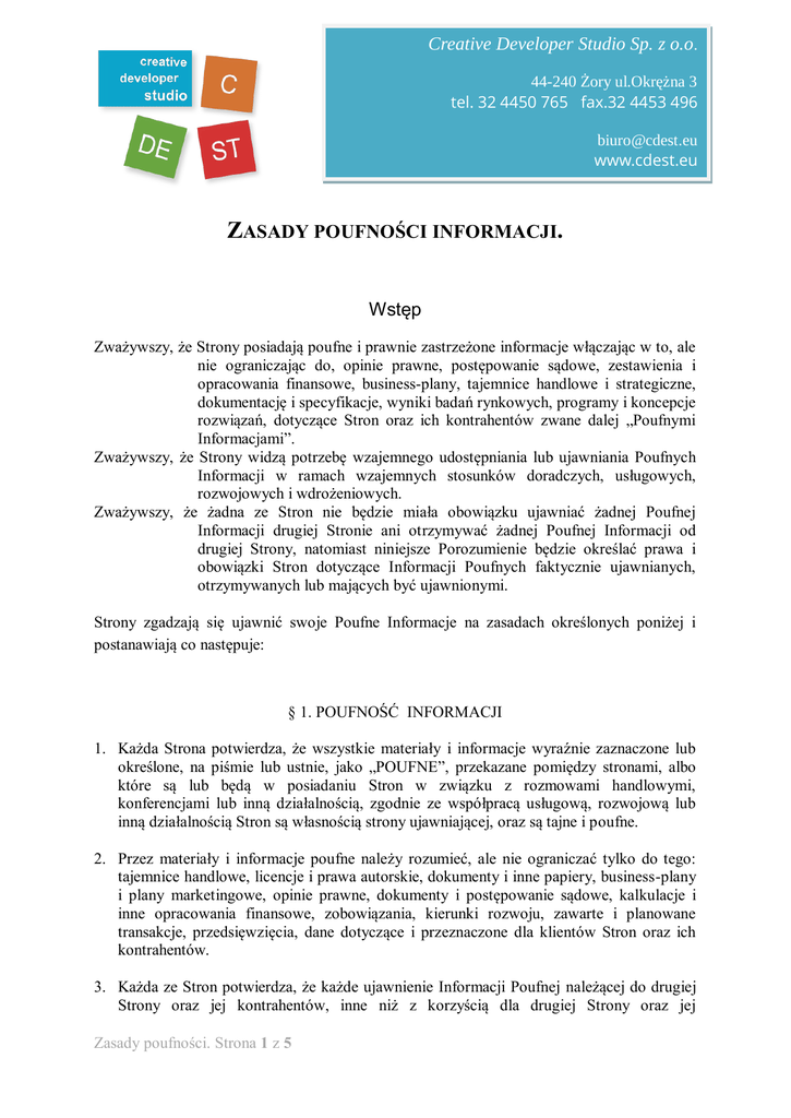 Creative Developer Studio Sp. z o.o. 44-240 Żory ul.Okrężna 3 tel. 32 4450 765 fax.32 4453 496 [email protected] www.cdest.eu ZASADY POUFNOŚCI INFORMACJI. Wstęp Zważywszy, że Strony posiadają poufne i prawnie zastrzeżone informacje włączając w to, ale nie ograniczając do, opinie prawne, postępowanie sądowe, zestawienia i opracowania finansowe, business-plany, tajemnice handlowe i strategiczne, dokumentację i specyfikacje, wyniki badań rynkowych, programy i koncepcje rozwiązań, dotyczące Stron oraz ich kontrahentów zwane dalej „Poufnymi Informacjami”. Zważywszy, że Strony widzą potrzebę wzajemnego udostępniania lub ujawniania Poufnych Informacji w ramach wzajemnych stosunków doradczych, usługowych, rozwojowych i wdrożeniowych. Zważywszy, że żadna ze Stron nie będzie miała obowiązku ujawniać żadnej Poufnej Informacji drugiej Stronie ani otrzymywać żadnej Poufnej Informacji od drugiej Strony, natomiast niniejsze Porozumienie będzie określać prawa i obowiązki Stron dotyczące Informacji Poufnych faktycznie ujawnianych, otrzymywanych lub mających być ujawnionymi. Strony zgadzają się ujawnić swoje Poufne Informacje na zasadach określonych poniżej i postanawiają co następuje: § 1. POUFNOŚĆ INFORMACJI 1. Każda Strona potwierdza, że wszystkie materiały i informacje wyraźnie zaznaczone lub określone, na piśmie lub ustnie, jako „POUFNE”, przekazane pomiędzy stronami, albo które są lub będą w posiadaniu Stron w związku z rozmowami handlowymi, konferencjami lub inną działalnością, zgodnie ze współpracą usługową, rozwojową lub inną działalnością Stron są własnością strony ujawniającej, oraz są tajne i poufne. 2. Przez materiały i informacje poufne należy rozumieć, ale nie ograniczać tylko do tego: tajemnice handlowe, licencje i prawa autorskie, dokumenty i inne papiery, business-plany i plany marketingowe, opinie prawne, dokumenty i postępowanie sądowe, kalkulacje i inne opracowania finansowe, zobowiązania, kierunki rozwoju, zawarte i planowane transakcje, przedsięwzięcia, dane dotyczące i przeznaczone dla klientów Stron oraz ich kontrahentów. 3. Każda ze Stron potwierdza, że każde ujawnienie Informacji Poufnej należącej do drugiej Strony oraz jej kontrahentów, inne niż z korzyścią dla drugiej Strony oraz jej Zasady poufności. Strona 1 z 5 Creative Developer Studio Sp. z o.o. 44-240 Żory ul.Okrężna 3 tel. 32 4450 765 fax.32 4453 496 [email protected] www.cdest.eu kontrahentów będzie bezprawne (nieuczciwe) i spowoduje niepowetowane szkody, dlatego każda Strona zgadza się trzymać poufne Informacje drugiej Strony oraz jej kontrahentów w najściślejszej tajemnicy i nie korzystać z nich inaczej, jak tylko z korzyścią dla drugiej Strony. 4. Informacje Poufne nie mogą być, bez uprzedniej pisemnej zgody Strony ujawniającej w szczególności: a) ujawnione przez Stronę otrzymującą je stronie trzeciej, b) kopiowane lub przepisane przez Stronę otrzymującą, c) wykorzystane przez Stronę otrzymującą w innym celu niż konieczność przeprowadzenia rozmów handlowych, wewnętrznych ocen związanych ze współpracą handlową i usługową pomiędzy Stronami oraz opracowań wykonywanych na zlecenie Strony ujawniającej. § 2.UZASADNIONE UJAWNIENIE 1. Strony zgadzają się, iż w celu umożliwienia im prowadzenia rozmów na temat działalności związanej ze współpracą handlową i usługową, każda ze Stron może być poproszona o udostępnienie Informacji Poufnych pracownikom drugiej Strony. 2. Każda Strona będzie odpowiedzialna za działania swojego personelu odnośnie łamania postanowień niniejszego Porozumienia i zobowiąże się użyć wszystkich niezbędnych środków w celu zwrócenia uwagi swojego personelu oraz innych osób na charakter Informacji Poufnych, otrzymywanych przez tę Stronę oraz na ich pochodzenie oraz zapewnić, że jej pracownicy szanują i przestrzegają ich poufnego charakteru tak, jakby pracownicy ci byli Stroną niniejszego Porozumienia pod warunkiem, że poziom dbałości o ochronę takich informacji będzie równy temu, jaki Strona otrzymująca przykłada do ochrony swoich informacji poufnych. 3. Każda Strona będzie odpowiedzialna za działania wszystkich osób, którym ujawniła Informacje Poufne z zachowaniem warunków zawartych w niniejszym Porozumieniu, odnośnie łamania postanowień niniejszego Porozumienia i zobowiązuje się, używając wszystkich dostępnych środków, zwrócić ich uwagę na charakter i pochodzenie Informacji Poufnych, jednocześnie zobowiąże wyżej wymienione osoby do przestrzegania postanowień niniejszego Porozumienia. 4. Każda ze Stron może zażądać do drugiej Strony przedstawienia listy osób, które dana Strona upoważniła do wglądu do Informacji Poufnych. 5. Każda ze Stron będzie przestrzegać, szanować i utrzymywać wszystkie oznaczenia, pojawiające się na Informacjach Poufnych i zapewni, że wszystkie wypisy, kopie czy odtworzenia Informacji Poufnych będą zawierały identyczne oznakowania, jak oryginalne, a wypisy, kopiowanie i odtwarzanie wymagają zgody strony ujawniającej. Zasady poufności. Strona 2 z 5 Creative Developer Studio Sp. z o.o. 44-240 Żory ul.Okrężna 3 tel. 32 4450 765 fax.32 4453 496 [email protected] www.cdest.eu 6. Wszelkie odnośniki do Informacji Poufnych, dokumentów i pism w niniejszym Porozumieniu będą zawierać, ale nie ograniczać się do odnośników do fotografii, filmów, planów, wykresów, specyfikacji, elektrycznych lub elektronicznych zapisów na nośnikach zarówno magnetycznych, papierowych, jak i plastikowych oraz innych ograniczeń pisemnych lub innych nośników. 7. Wszystkie materiały zawierające, bez ograniczenia, dokumenty, rysunki, wykresy, prezentacje, projekty i listy, przekazane przez Stronę ujawniającą drugiej Stronie, pozostaną własnością Strony ujawniającej i nic zawartego w niniejszym porozumieniu nie daje drugiej Stronie pozw