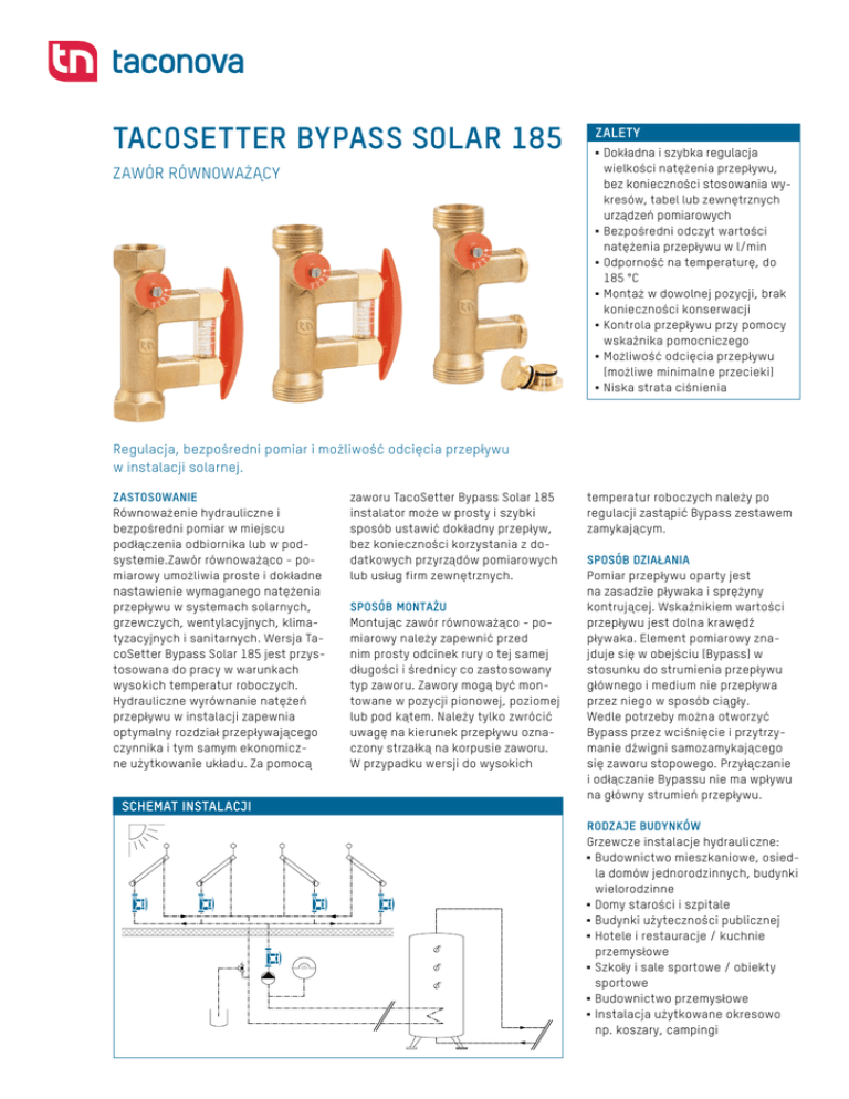 TACOSETTER BYPASS SOLAR 185 ZALETY ■■ ZAWÓR RÓWNOWAŻĄCY ■■ ■■ ■■ ■■ ■■ ■■ Dokładna i szybka regulacja wielkości natężenia przepływu, bez konieczności stosowania wykresów, tabel lub zewnętrznych urządzeń pomiarowych Bezpośredni odczyt wartości natężenia przepływu w l/min Odporność na temperaturę, do 185 °C Montaż w dowolnej pozycji, brak konieczności konserwacji Kontrola przepływu przy pomocy wskaźnika pomocniczego Możliwość odcięcia przepływu (możliwe minimalne przecieki) Niska strata ciśnienia Regulacja, bezpośredni pomiar i możliwość odcięcia przepływu w instalacji solarnej. ZASTOSOWANIE Równoważenie hydrauliczne i bezpośredni pomiar w miejscu podłączenia odbiornika lub w podsystemie.Zawór równoważąco - pomiarowy umożliwia proste i dokładne nastawienie wymaganego natężenia przepływu w systemach solarnych, grzewczych, wentylacyjnych, klimatyzacyjnych i sanitarnych. Wersja TacoSetter Bypass Solar 185 jest przystosowana do pracy w warunkach wysokich temperatur roboczych. Hydrauliczne wyrównanie natężeń przepływu w instalacji zapewnia optymalny rozdział przepływającego czynnika i tym samym ekonomiczne użytkowanie układu. Za pomocą zaworu TacoSetter Bypass Solar 185 instalator może w prosty i szybki sposób ustawić dokładny przepływ, bez konieczności korzystania z dodatkowych przyrządów pomiarowych lub usług firm zewnętrznych. SPOSÓB MONTAŻU Montując zawór równoważąco - pomiarowy należy zapewnić przed nim prosty odcinek rury o tej samej długości i średnicy co zastosowany typ zaworu. Zawory mogą być montowane w pozycji pionowej, poziomej lub pod kątem. Należy tylko zwrócić uwagę na kierunek przepływu oznaczony strzałką na korpusie zaworu. W przypadku wersji do wysokich SCHEMAT INSTALACJI temperatur roboczych należy po regulacji zastąpić Bypass zestawem zamykającym. SPOSÓB DZIAŁANIA Pomiar przepływu oparty jest na zasadzie pływaka i sprężyny kontrującej. Wskaźnikiem wartości przepływu jest dolna krawędź pływaka. Element pomiarowy znajduje się w obejściu (Bypass) w stosunku do strumienia przepływu głównego i medium nie przepływa przez niego w sposób ciągły. Wedle potrzeby można otworzyć Bypass przez wciśnięcie i przytrzymanie dźwigni samozamykającego się zaworu stopowego. Przyłączanie i odłączanie Bypassu nie ma wpływu na główny strumień przepływu. RODZAJE BUDYNKÓW Grzewcze instalacje hydrauliczne: Budownictwo mieszkaniowe, osiedla domów jednorodzinnych, budynki wielorodzinne Domy starości i szpitale Budynki użyteczności publicznej Hotele i restauracje / kuchnie przemysłowe Szkoły i sale sportowe / obiekty sportowe Budownictwo przemysłowe Instalacja użytkowane okresowo np. koszary, campingi ■■ ■■ ■■ ■■ T T T ■■ ■■ ■■ TACOSETTER BYPASS SOLAR 185 | ZAWÓR RÓWNOWAŻĄCY TEKST OGŁOSZENIA Patrz www.taconova.com DOSTĘPNE TYPY TacoSetter Bypass Solar 185 | Zawór równoważąco - pomiarowy z gwintem wewnętrznym (każdy z dołączonym zestawem zamykającym) DANE TECHNICZNE Ogólne Maksymalne parametry pracy TB max i PB max: patrz Krzywa zależności ciśnienia i temperatury Dokładność pomiaru: do 25% zakresu pomiaru = ±20% wskazanej wartości powyżej 25% zakresu pomiaru = ±10% wskazanej wartości Wartość współczynnika kVS i zakres pomiaru wg tabeli „Dostępne typy”. Gwint wewnętrzny Rp (cylindryczny) zgodny z DIN 2999 / ISO 7 lub gwint zewnętrzny G (cylindryczny) zgodny z ISO 228. Materiał Korpus: mosiądz Części wewnętrzne: stal nierdzewna, mosiądz i tworzywo sztuczne Szybka wziernik: odporne na wysoką temperaturę i uderzenia mechaniczne tworzywo sztuczne Uszczelki: EPDM Dopuszczalne media woda grzewcza (VDI 2035; SWKI BT 102-01; ONORM H 5195–1) woda lodowa zgodnie z DIN 1988-7 woda zawierająca powszechnie stosowane środki antykorozyjne i chroniące przed zamarzaniem (patrz Krzywe korekcyjne glikolu) Nr katalogowy 223.2382.000 223.2383.000 223.2480.000 223.2580.000 ■■ ■■ ■■ ■■ ■■ DN 20 20 25 32 Rp × Rp ¾" × ¾" ¾" × ¾" 1" × 1" 1¼" × 1¼" Zakres pomiaru 2 – 12 (l/min) 8 – 30 (l/min) 10 – 40 (l/min) 20 – 70 (l/min) kVS (m3/h) 2,2 5,0 8,1 17,0 TacoSetter Bypass Solar 185 | Zawór równoważąco - pomiarowy z gwintem zewnętrznym (każdy z dołączonym zestawem zamykającym) Nr katalogowy 223.2382.385 223.2383.385 DN 20 20 G×G 1" × 1" 1" × 1" Zakres pomiaru 2 – 12 (l/min) 8 – 30 (l/min) kVS (m3/h) 2,2 5,0 ■■ WYMIARY C A B2 ■■ C SW D C G B1 Rp ■■ B A D ■■ l/min 2 ■■ 8 7 6 5 4 3 ■■ ■■ ■■ DODATKOWE WARIANTY Zawory równoważąco - pomiarowe do innych zastosowań patrz karta katalogowa TacoSetter Bypass 100 i TacoSetter Bypass Solar 130. TABELA WYMIARÓW TacoSetter Bypass Solar 185 | Zawór równoważąco - pomiarowy z gwintem wewnętrznym Nr katalogowy 223.2382.000 223.2383.000 223.2480.000 223.2580.000 DN 20 20 25 32 A 129 129 152 161 B1 39 39 47 56 C 46 46 58 65 D 79 79 82 84 SW 34 34 41 49 Rp ¾" ¾" 1" 1" TacoSetter Bypass Solar 185 | Zawór równoważąco - pomiarowy z gwintem zewnętrznym Nr katalogowy 223.2382.385 223.2383.385 KRZYWE KOREKCYJNE GLIKOLU Dla TacoSetter do DN25 i jego zakresów pomiaru istnieje dedykowany wykres z dziewięcioma krzywymi korekcyjnymi do stosowania w przypadku dodatku środków antykorozyjnych i chroniących przed zamarzaniem. W przypadku dużych średnic korekta nie jest konieczna, ponieważ to odchylenie pokrywa się z dokładnością pomiaru. Patrz www.taconova.com DN 20 20 A 129 129 B2 12 12 C 46 46 D 79 79 G 1" 1" TACOSETTER BYPASS SOLAR 185 | ZAWÓR RÓWNOWAŻĄCY KRZYWA ZALEŻNOŚCI CIŚNIENIA I TEMPERATURY 18 16 Ciśnienie pracy (bar) 14 Dopuszczalny zakres pracy z zestawem zamykającym 12 10 8 6 Dopuszczalny zakres pracy z Bypassem 4 2 0 0 30 60 90 100 120130 150 185 210 Temperatura pracy (°C) CHARAKTERYSTYKI STRATY CIŚNIENIA 223.2382.XXX (DN 20 | ¾" | 2..